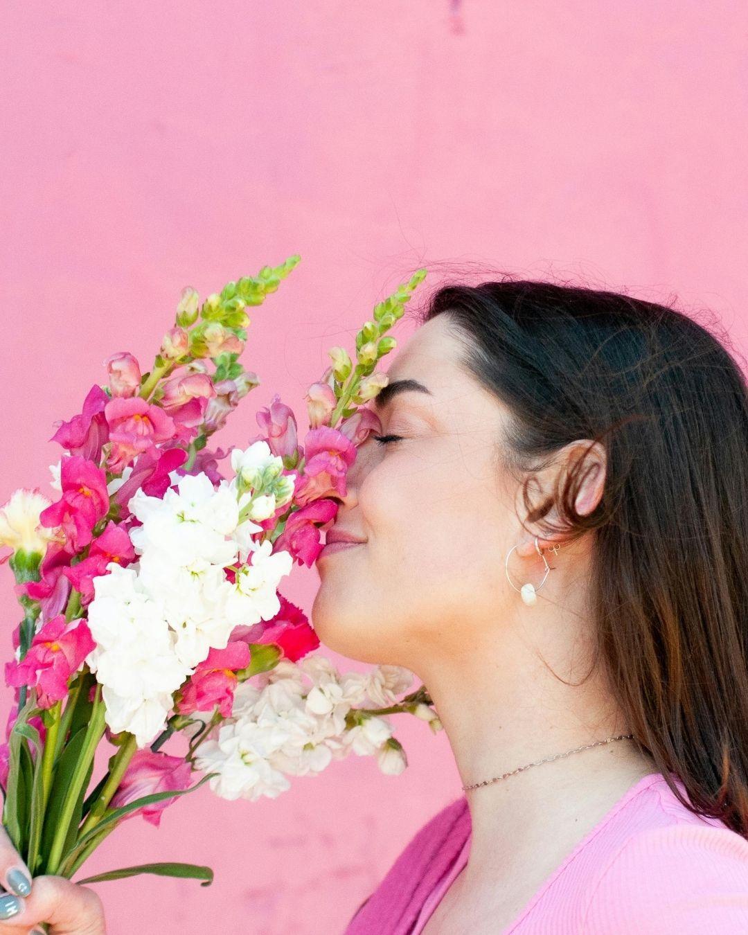 Un jean rose doux associé à une blouse fleurie et un pull pastel pour une silhouette printanière pleine de douceur et de style.