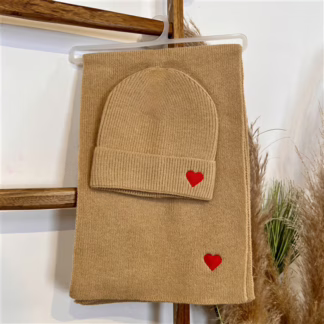 Y495- Ensemble bonnet & écharpe – Détails cœur brodé ❤️ (taupe)