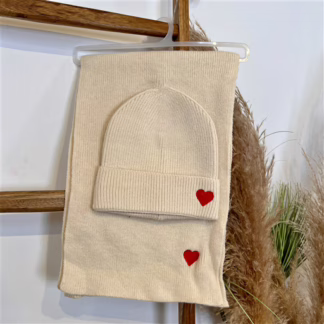 Y495- Ensemble bonnet & écharpe – Détails cœur brodé ❤️ (beige)