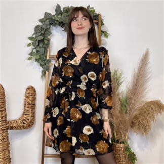 J949 – Robe courte fleurie ceinturée (T36-42) (marron)