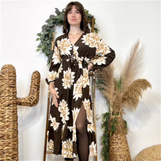 J910 – Robe motif pétales col V (T36-T40) (marron)