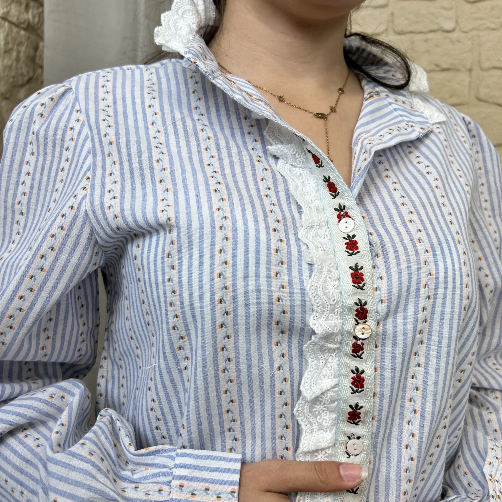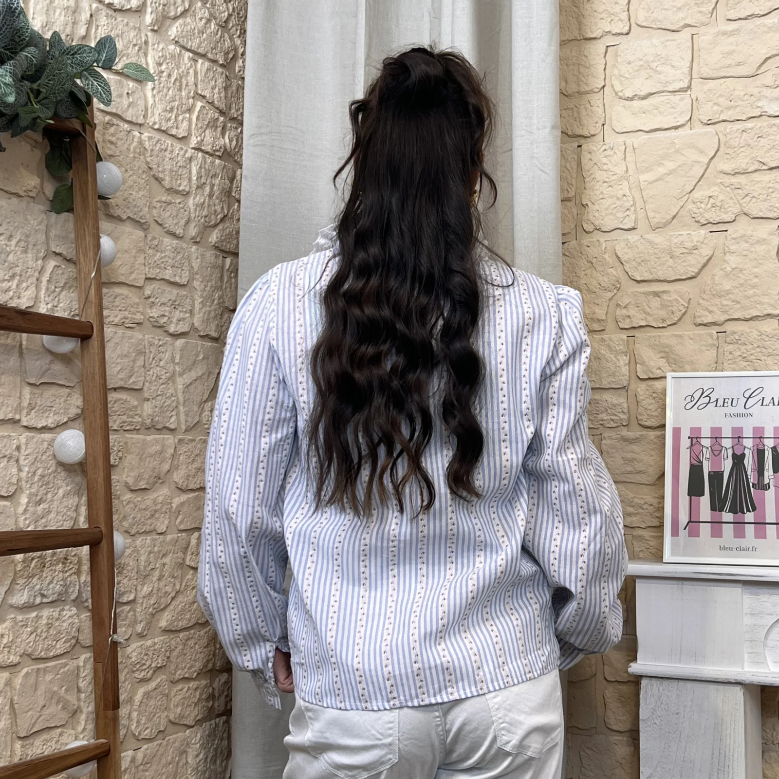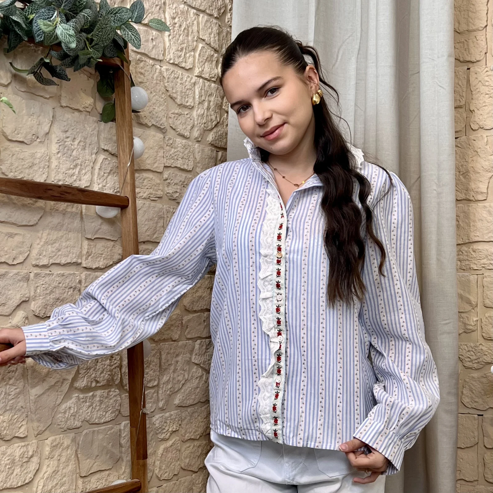 Cette chemise rayée apporte élégance et féminité à vos tenues. Ses broderies au niveau du col et du boutonnage sont parfaites pour un look bohème. A associer avec un jean ou un pantalon plus habillé.