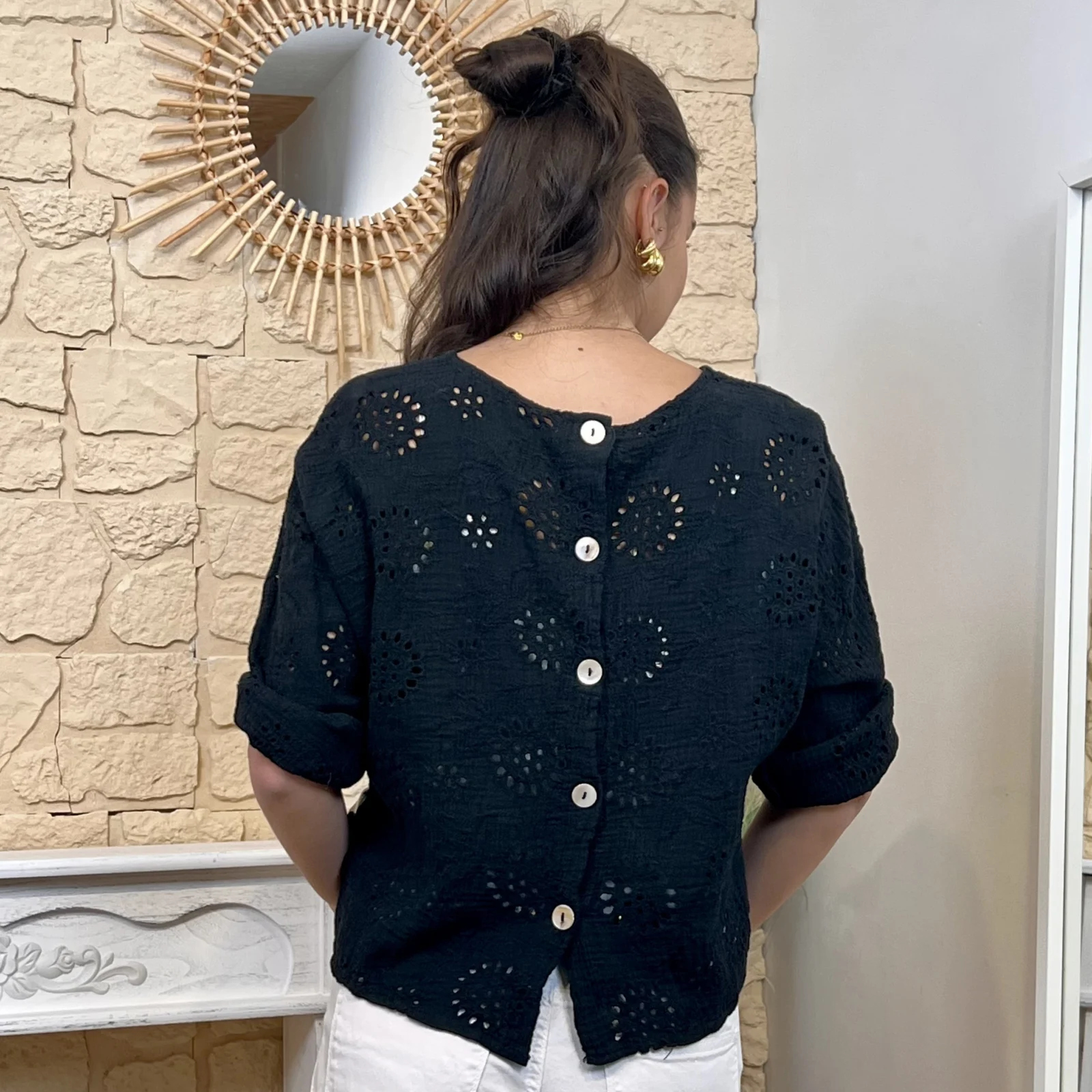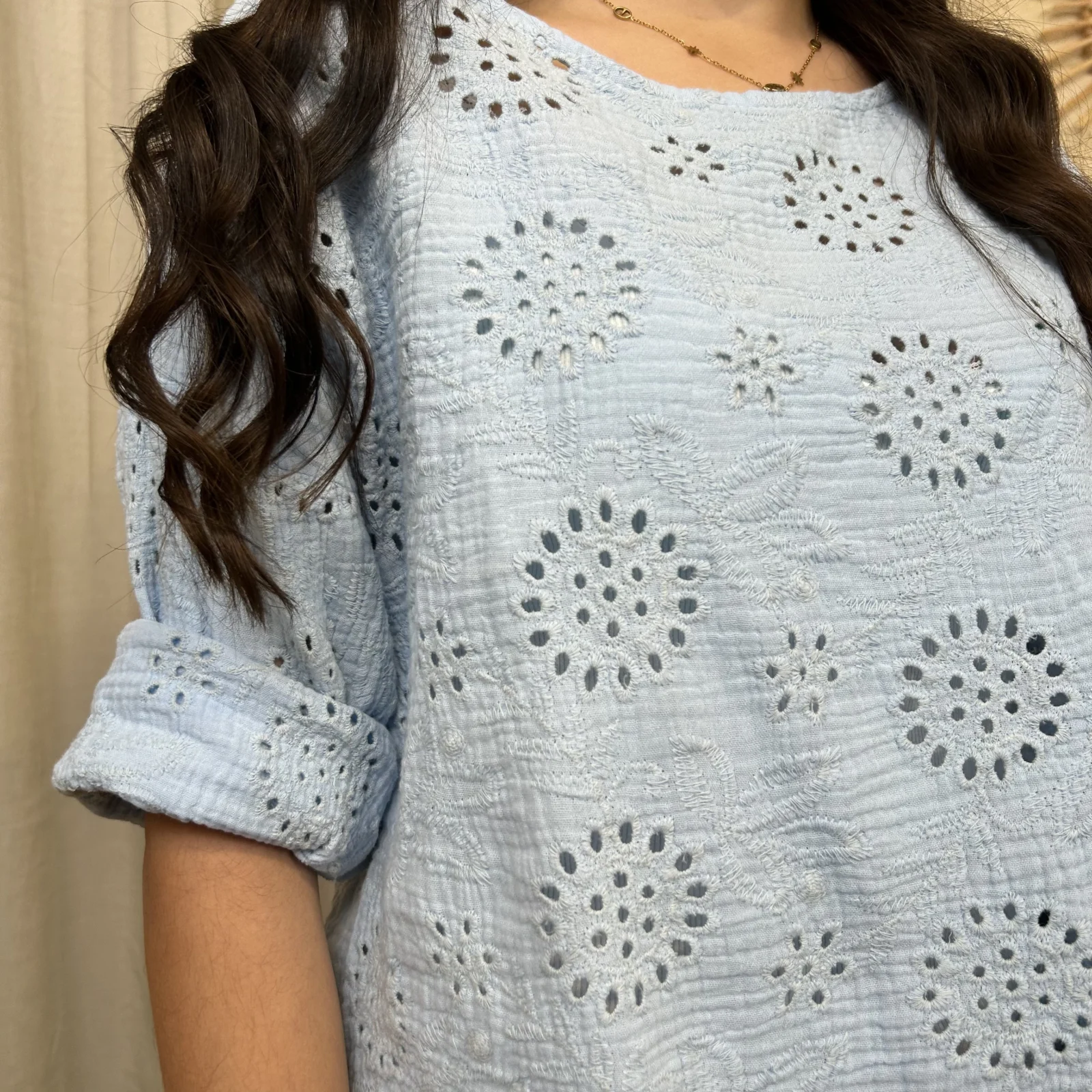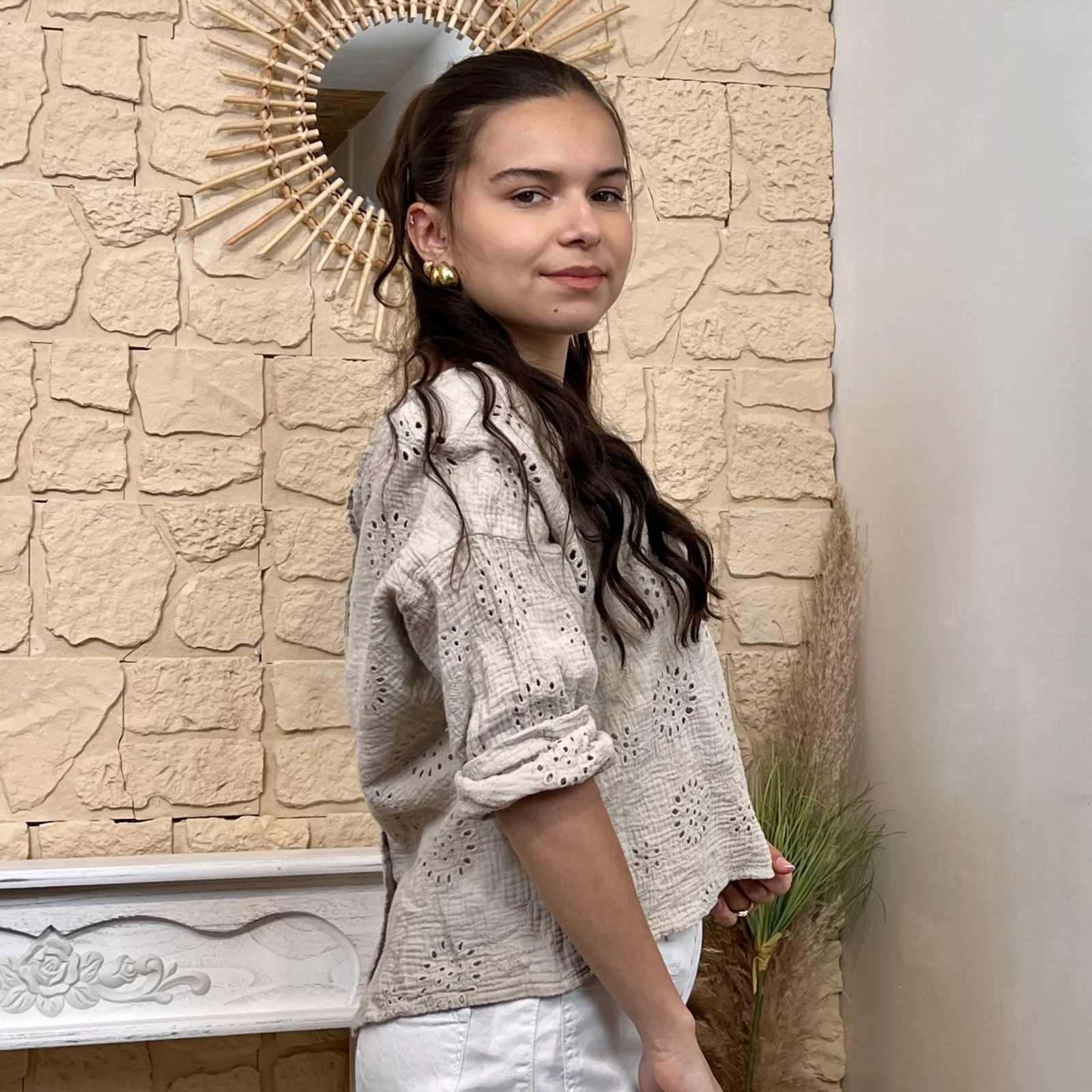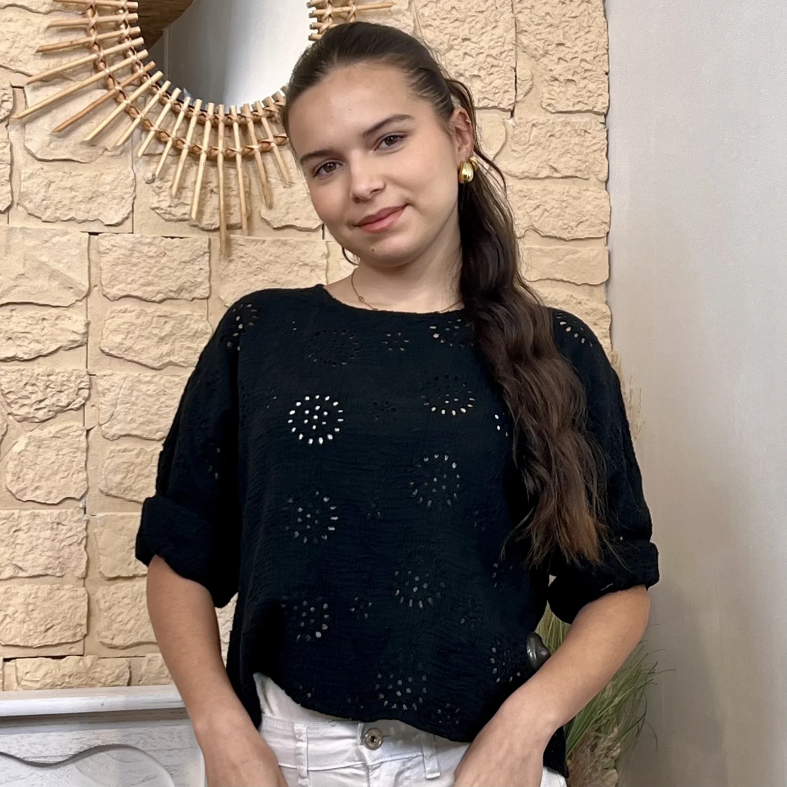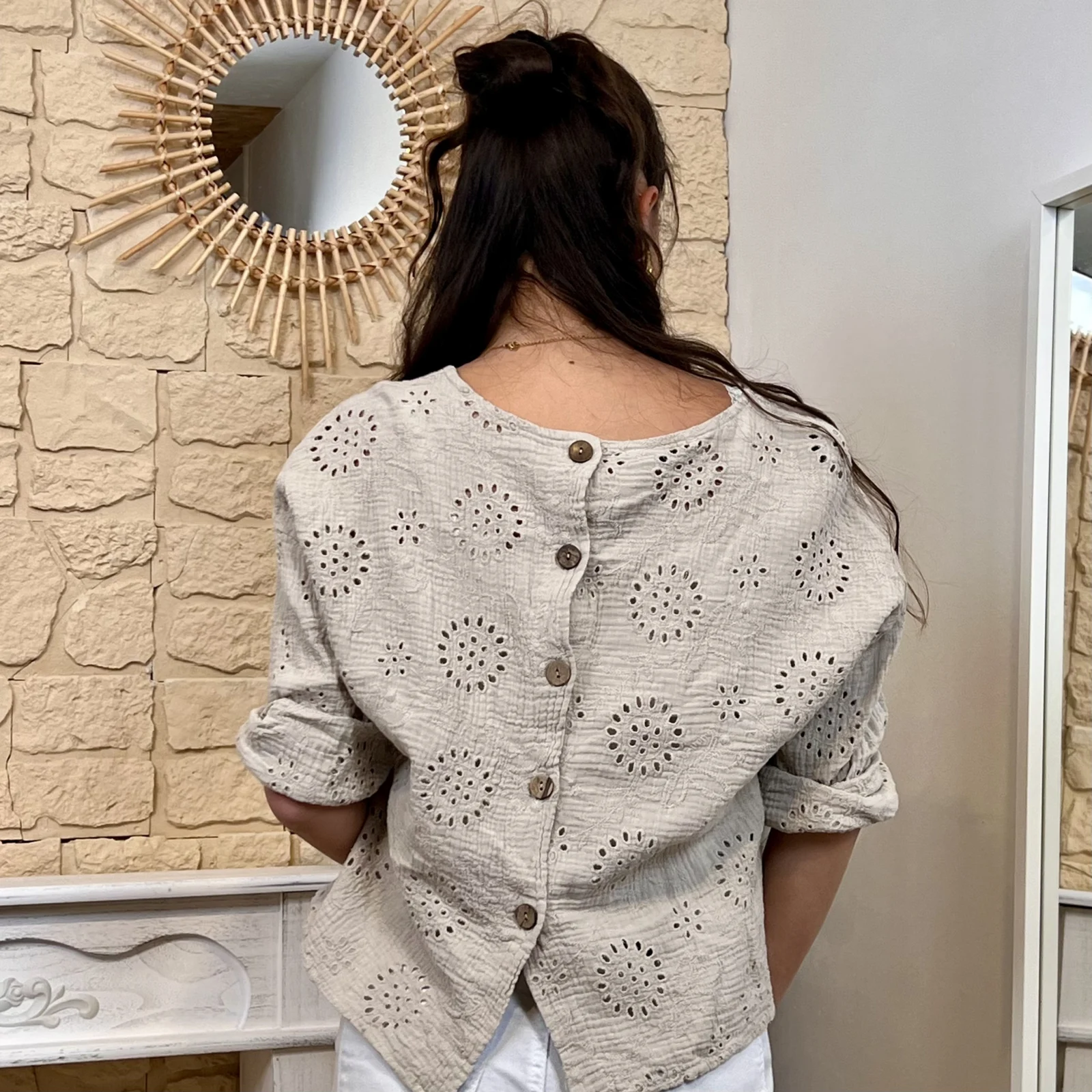 Son tissu texturé avec broderies ajourées apporte du relief et une touche de raffinement. Sa coupe ample et fluide assure un confort optimal tout en sublimant la silhouette.