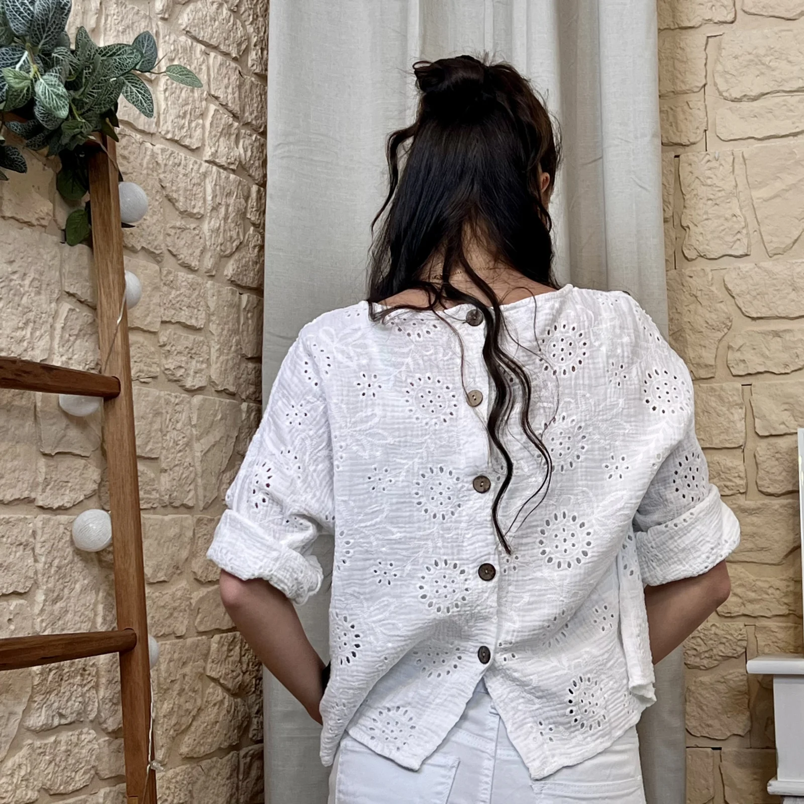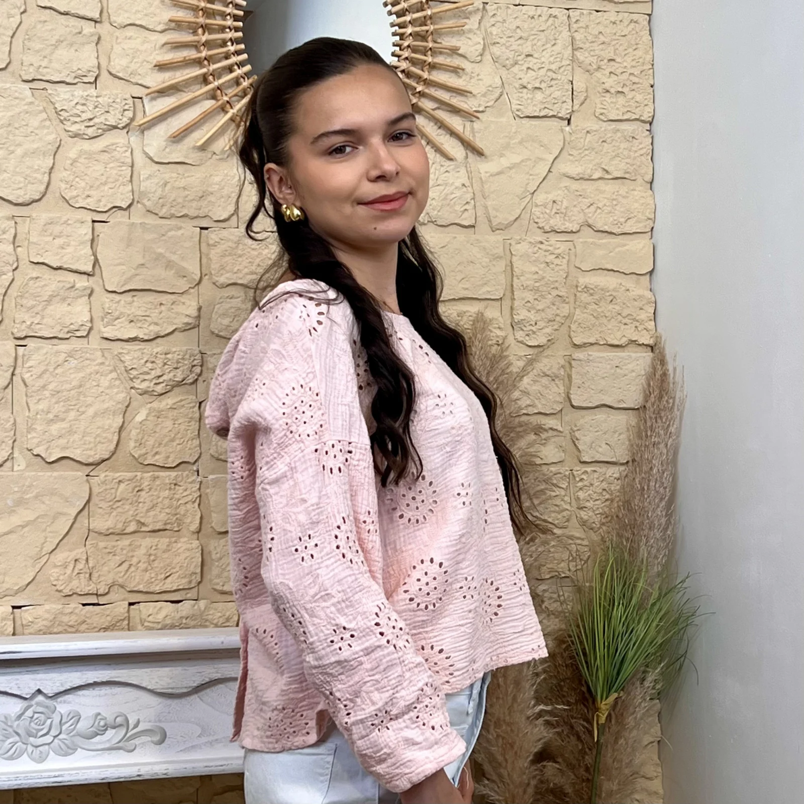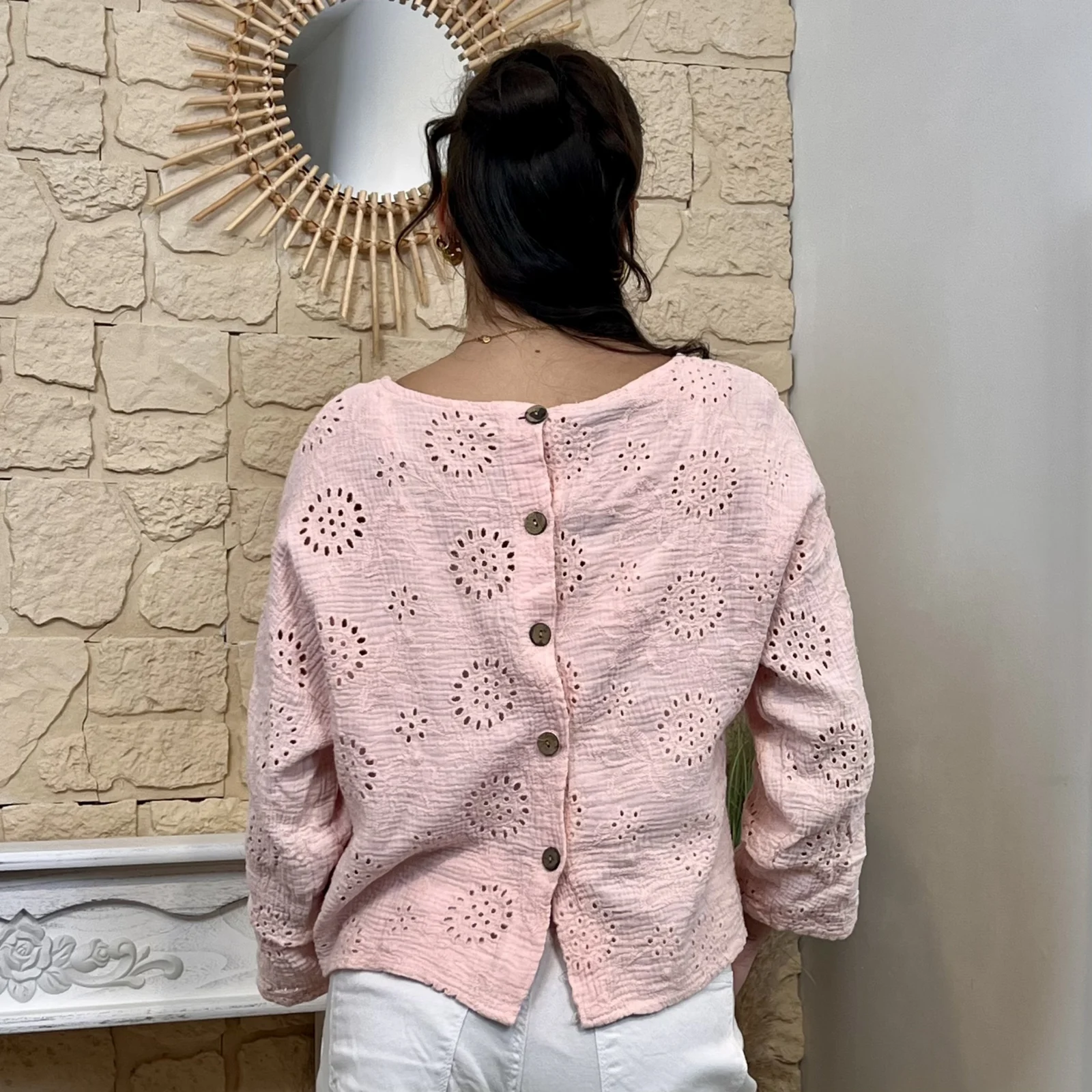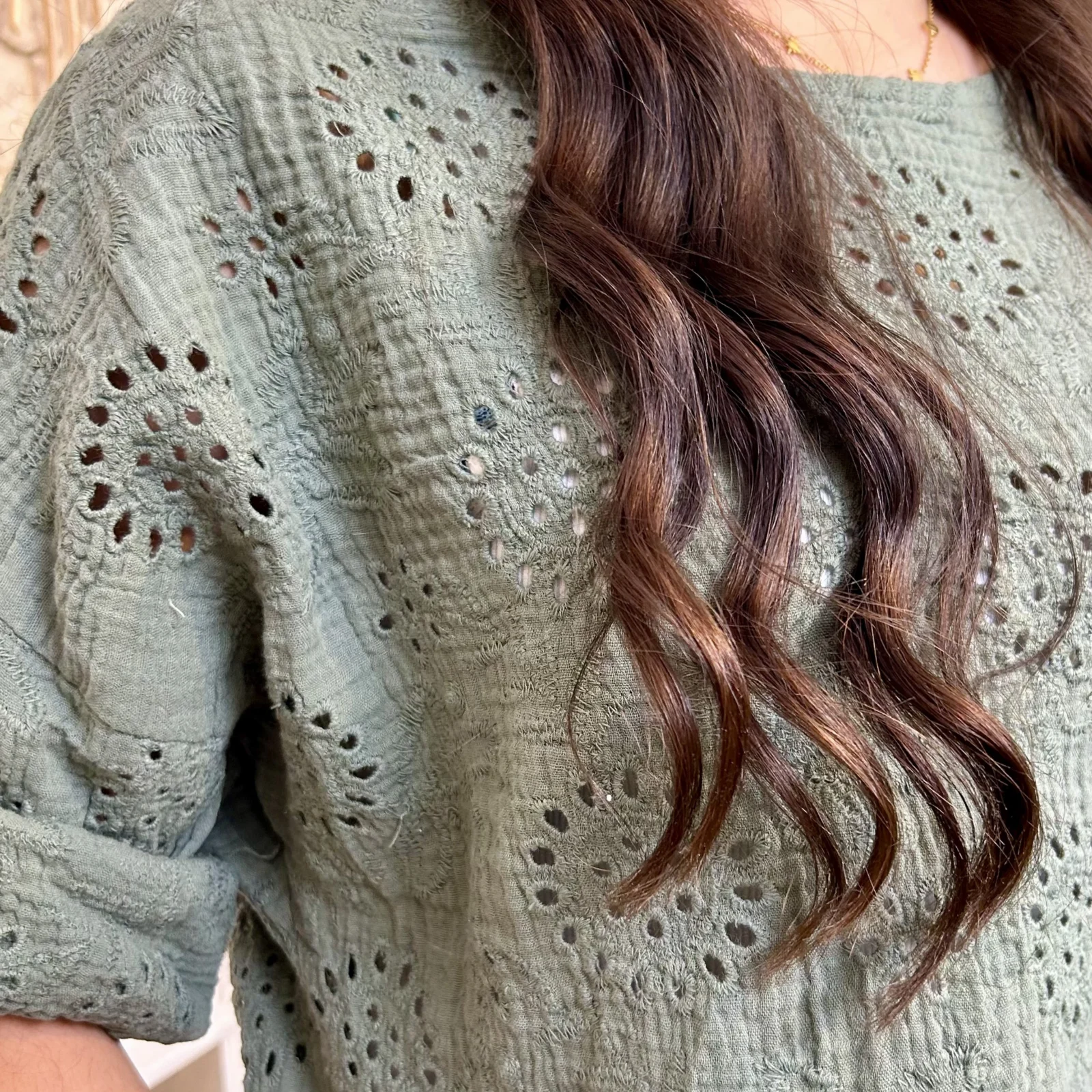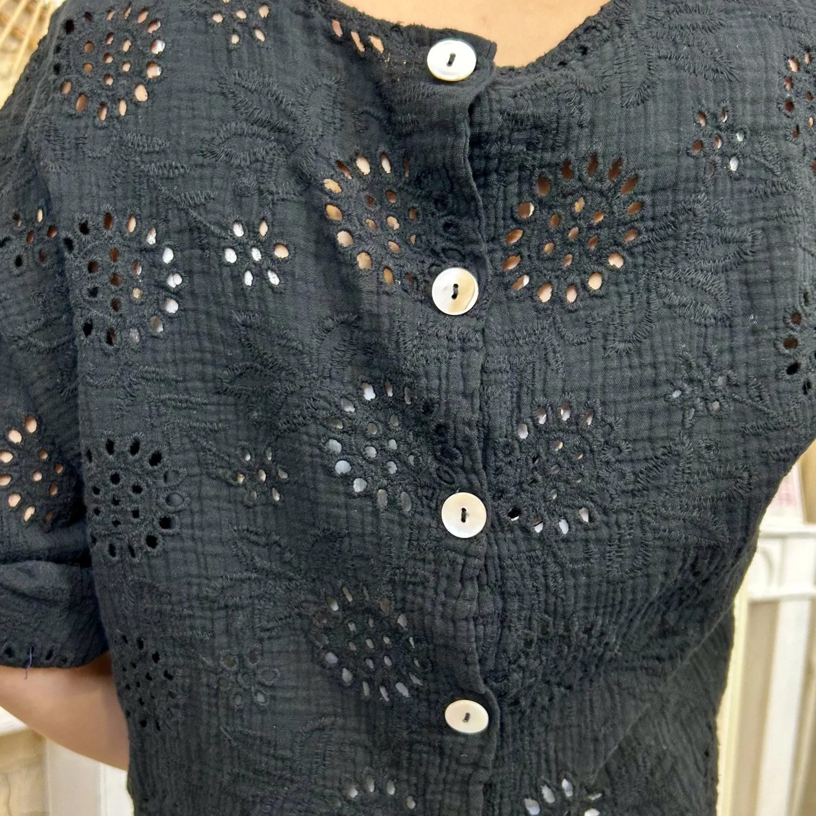 Son tissu texturé avec broderies ajourées apporte du relief et une touche de raffinement. Sa coupe ample et fluide assure un confort optimal tout en sublimant la silhouette.