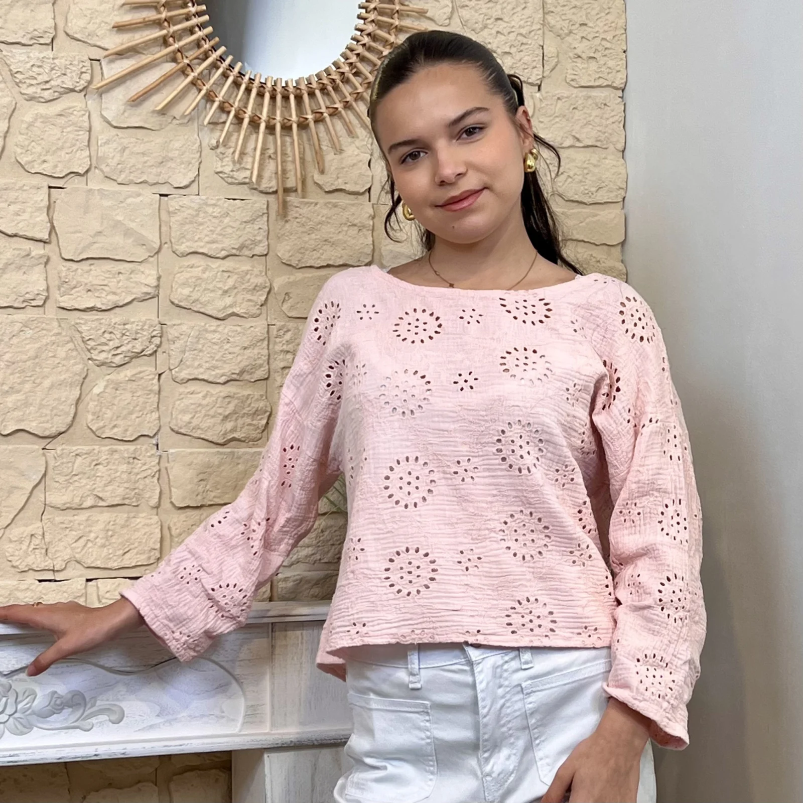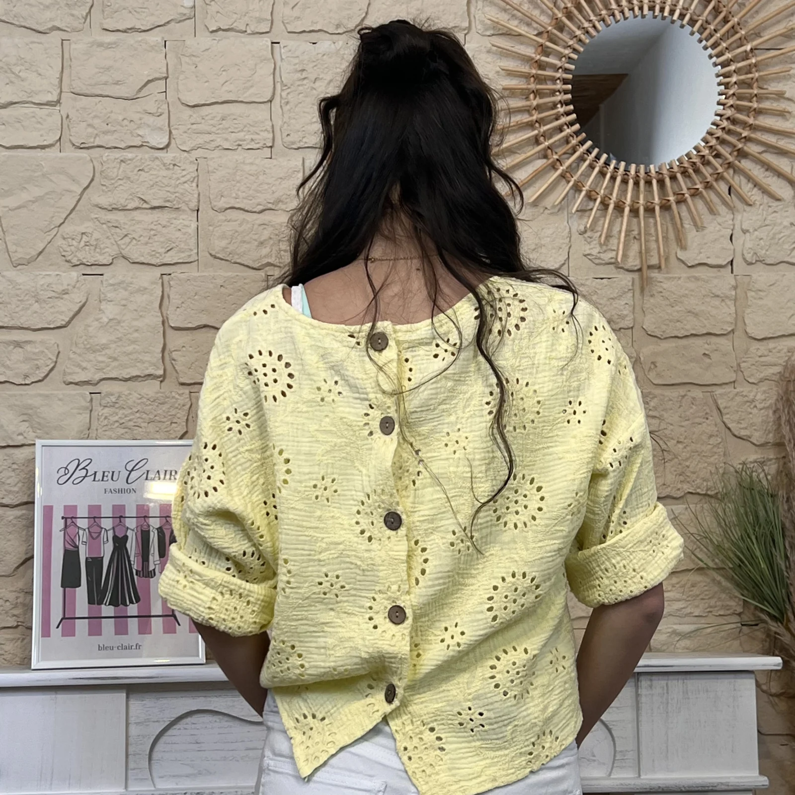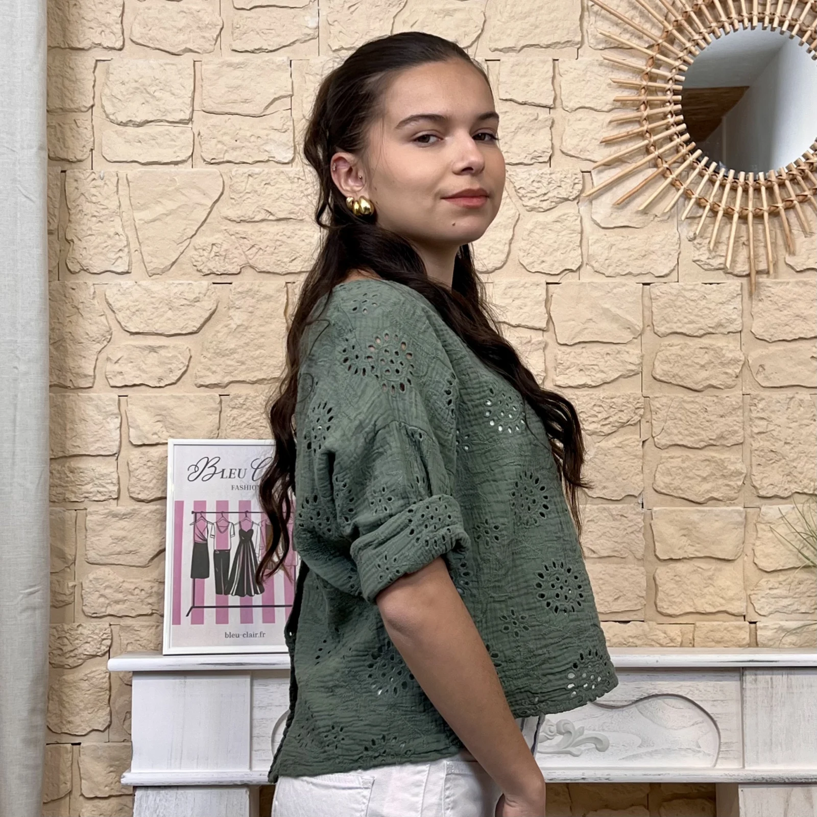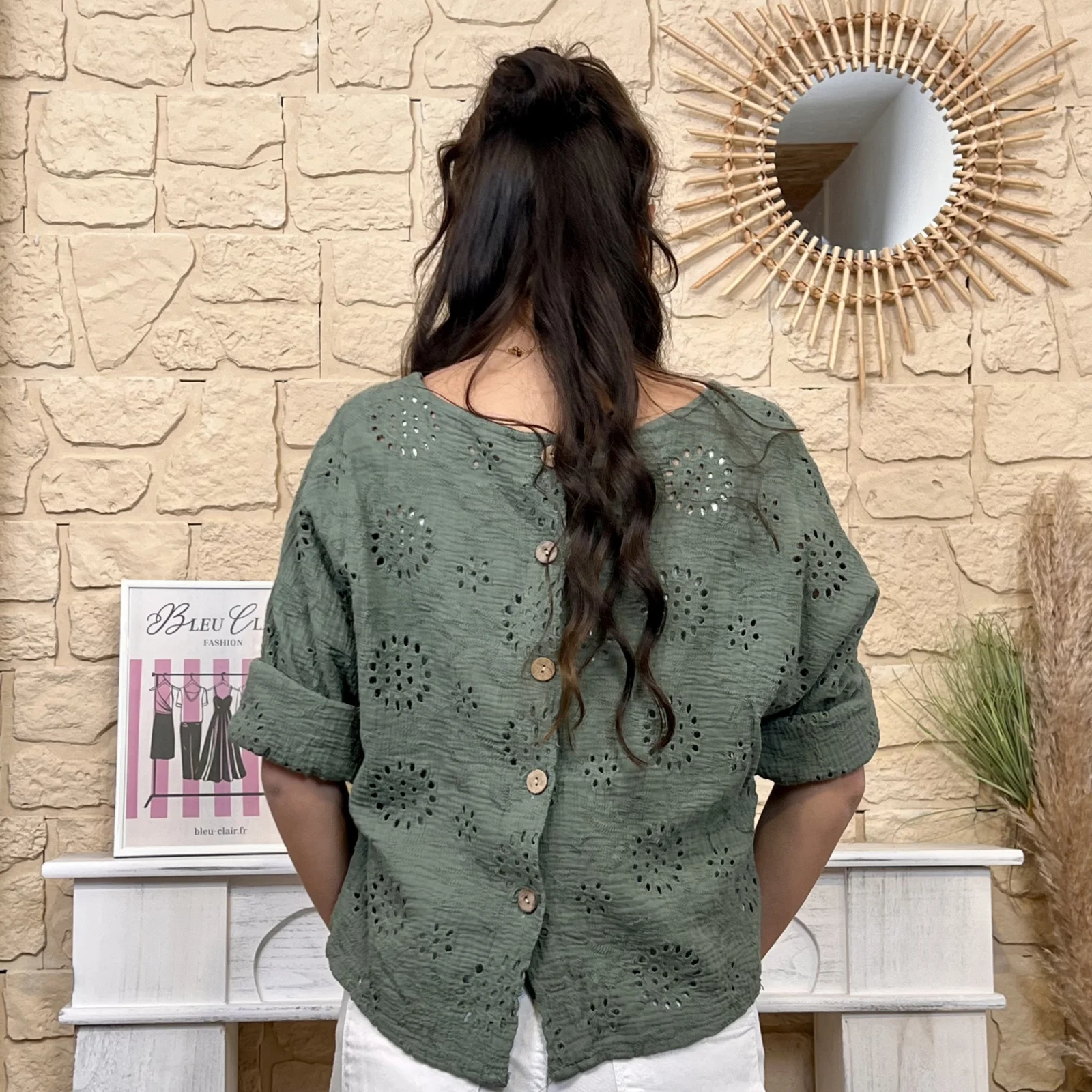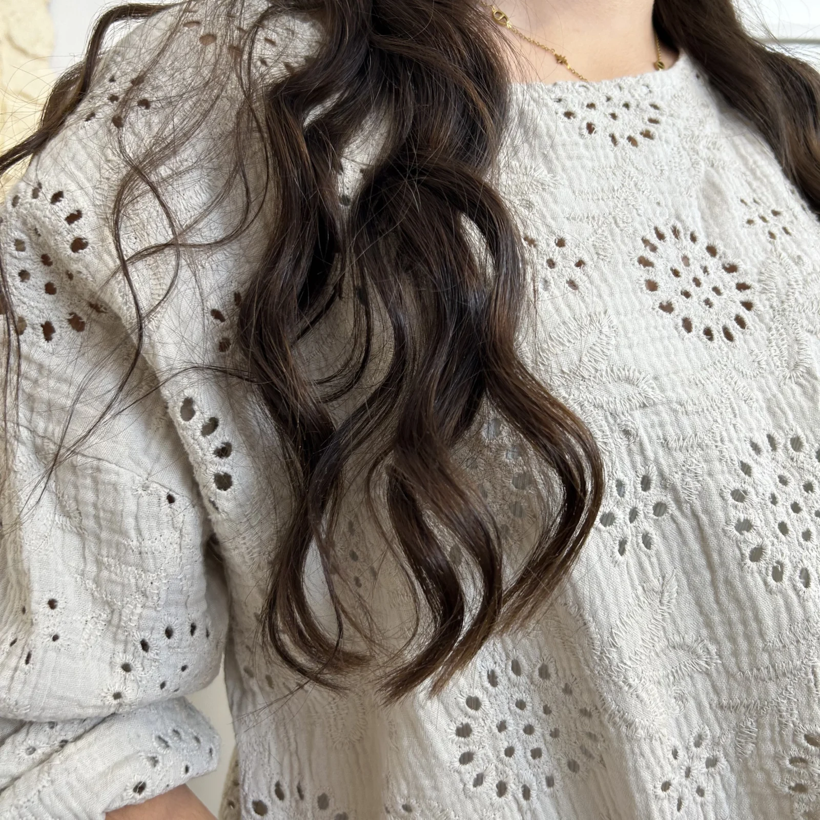 Son tissu texturé avec broderies ajourées apporte du relief et une touche de raffinement. Sa coupe ample et fluide assure un confort optimal tout en sublimant la silhouette.