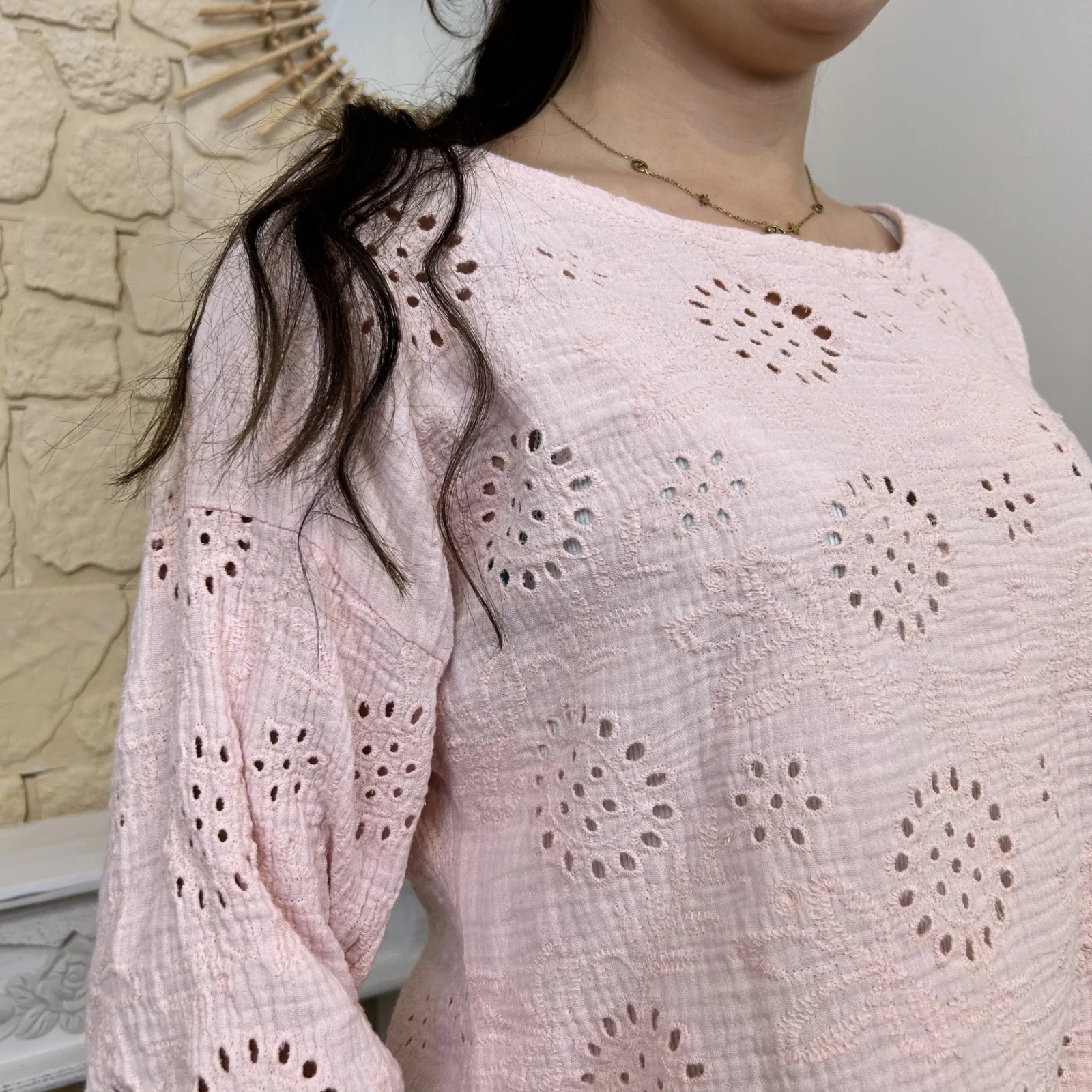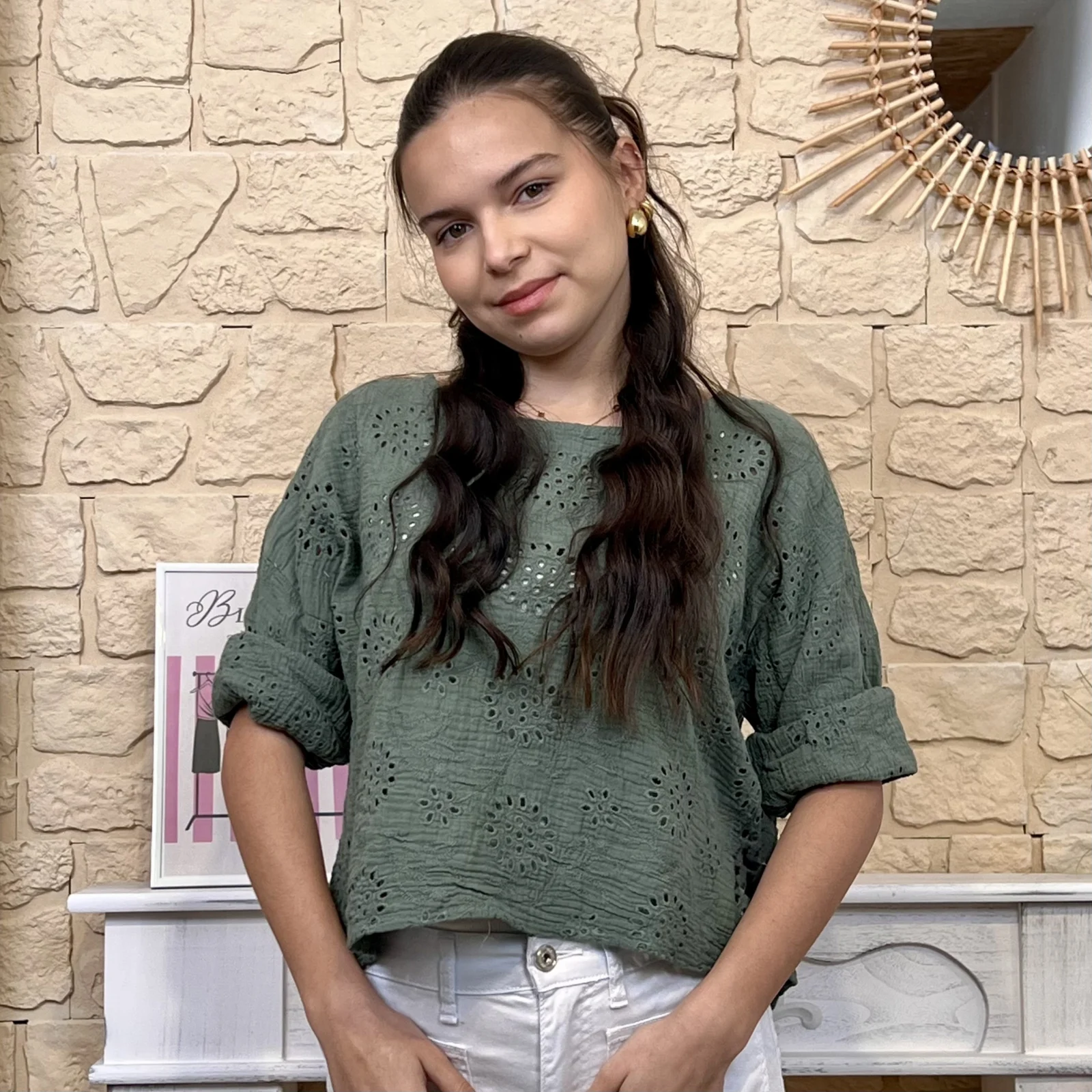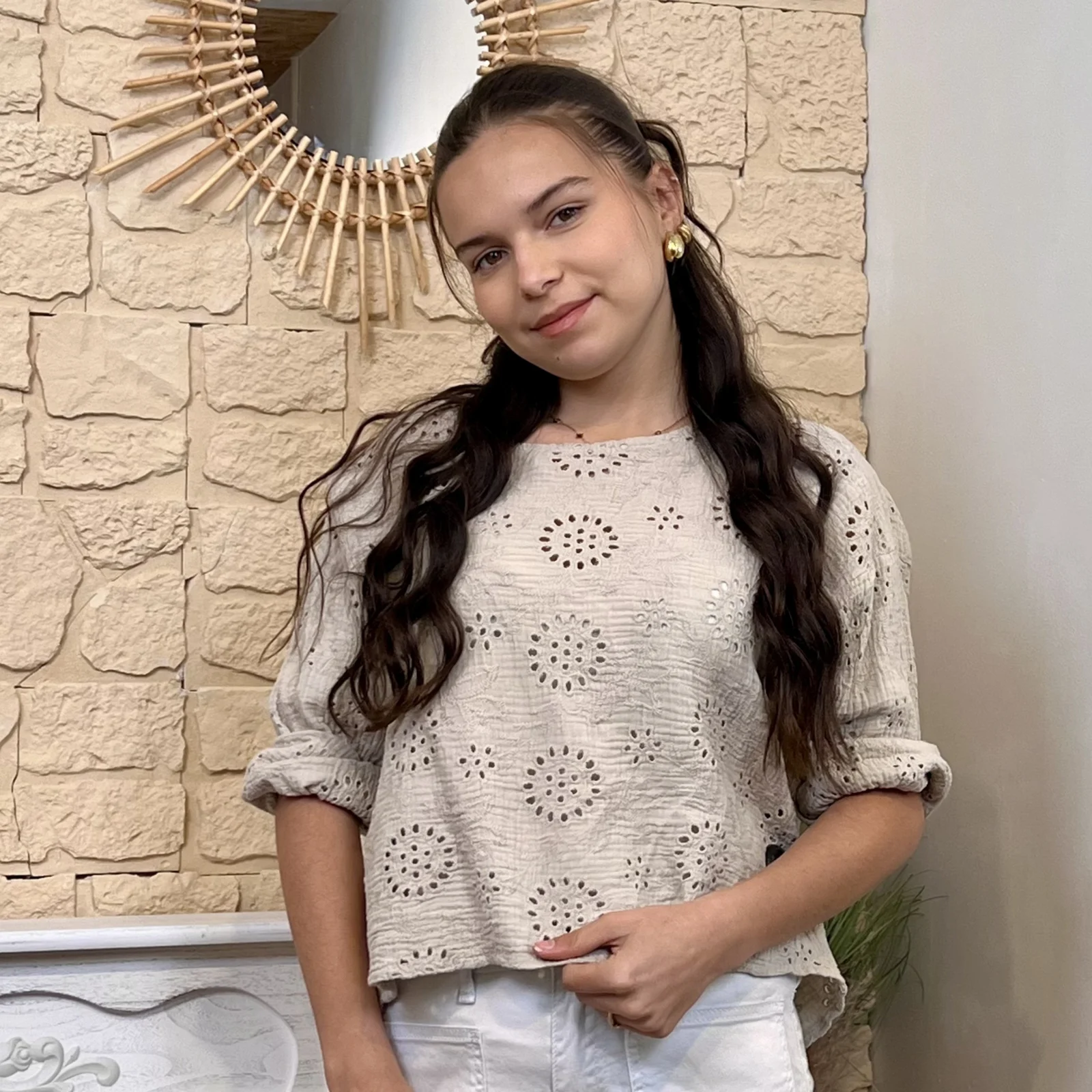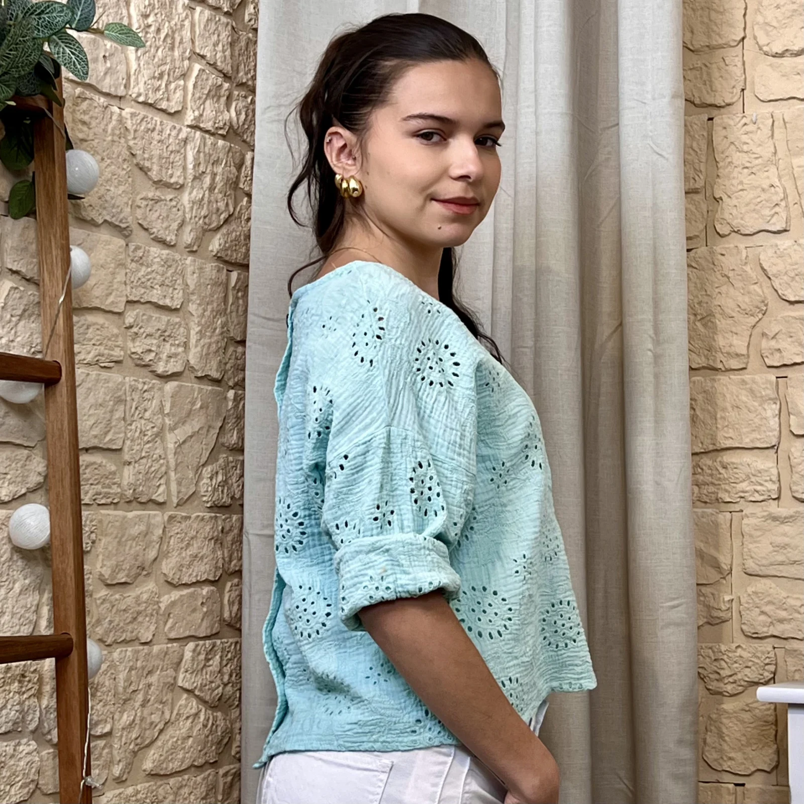 Son tissu texturé avec broderies ajourées apporte du relief et une touche de raffinement. Sa coupe ample et fluide assure un confort optimal tout en sublimant la silhouette.