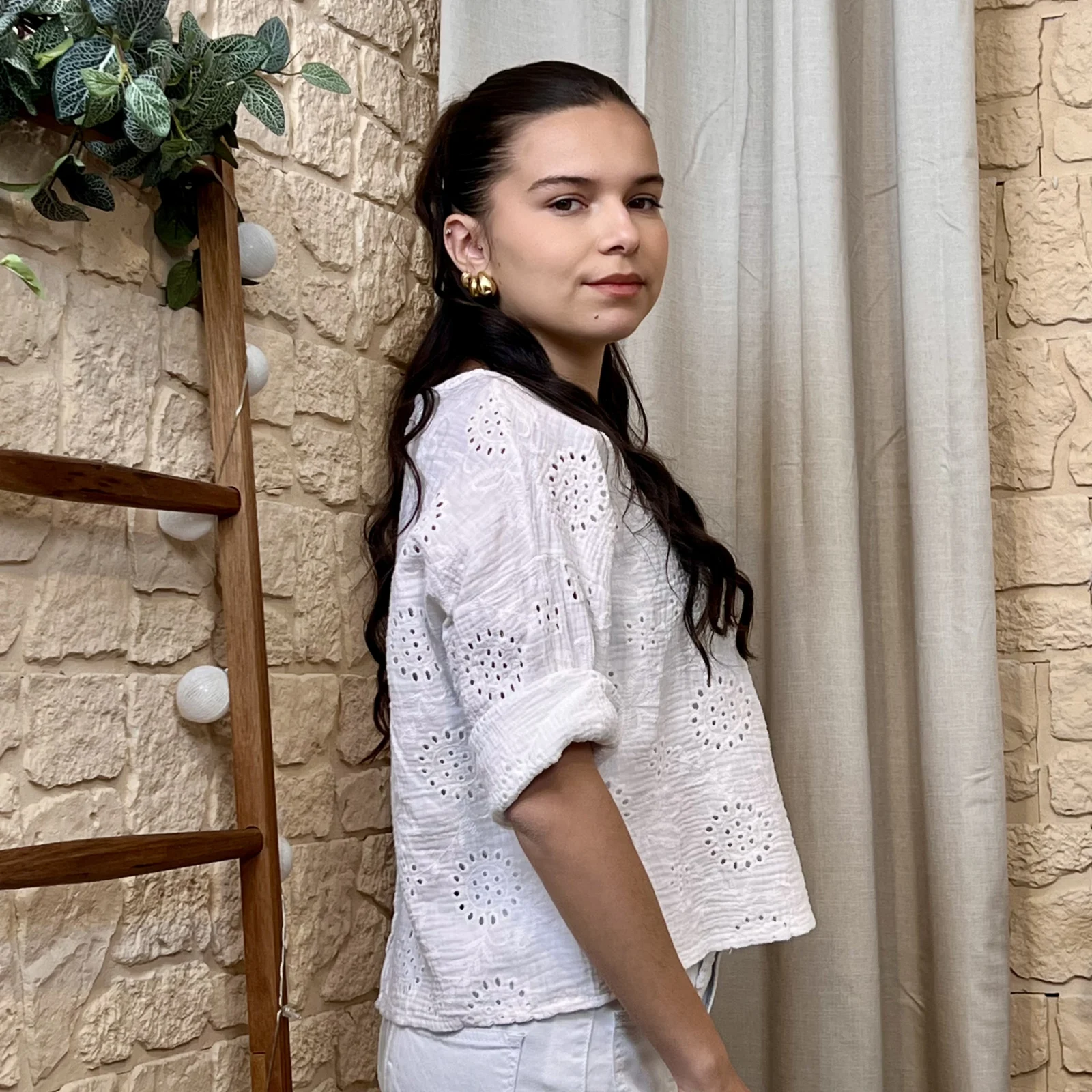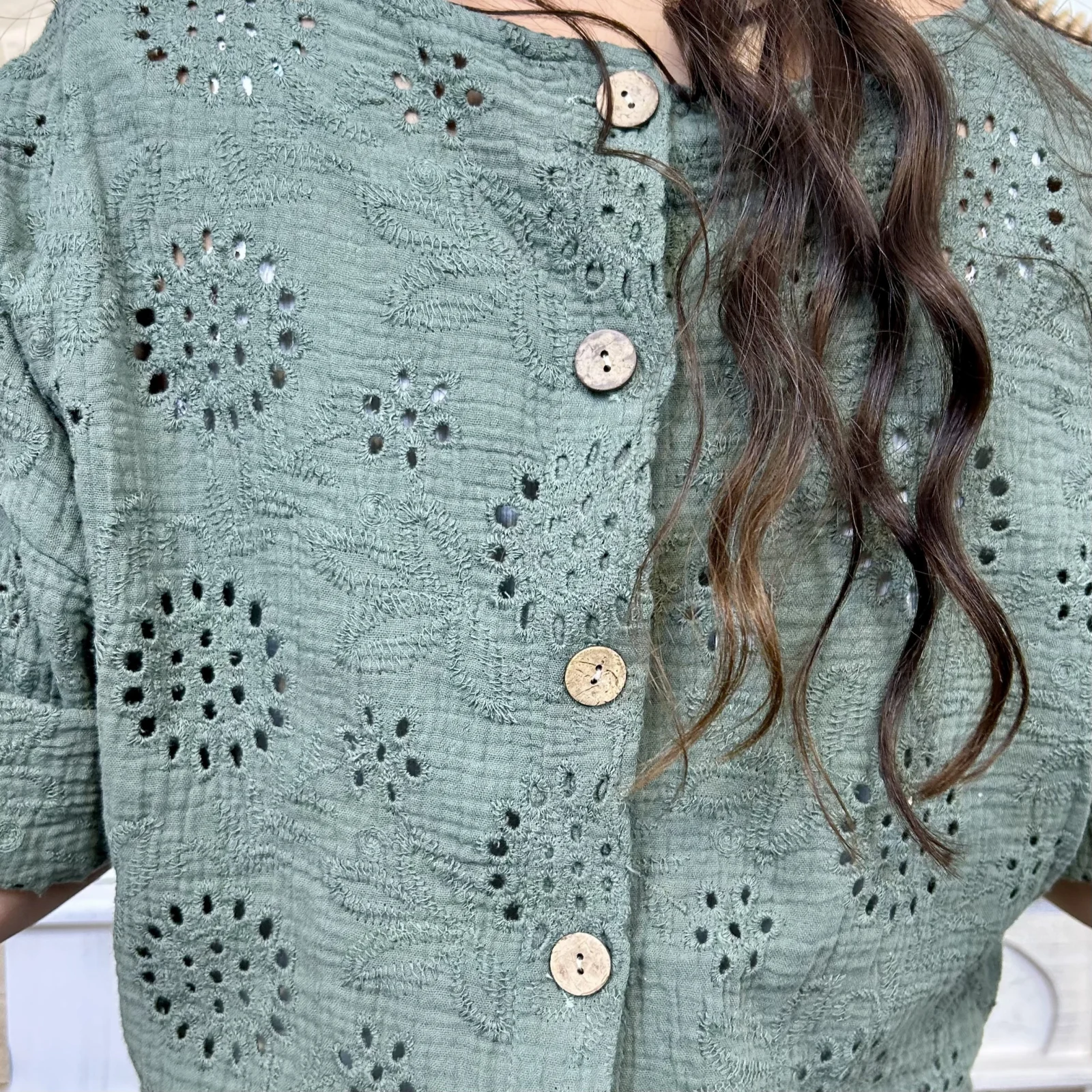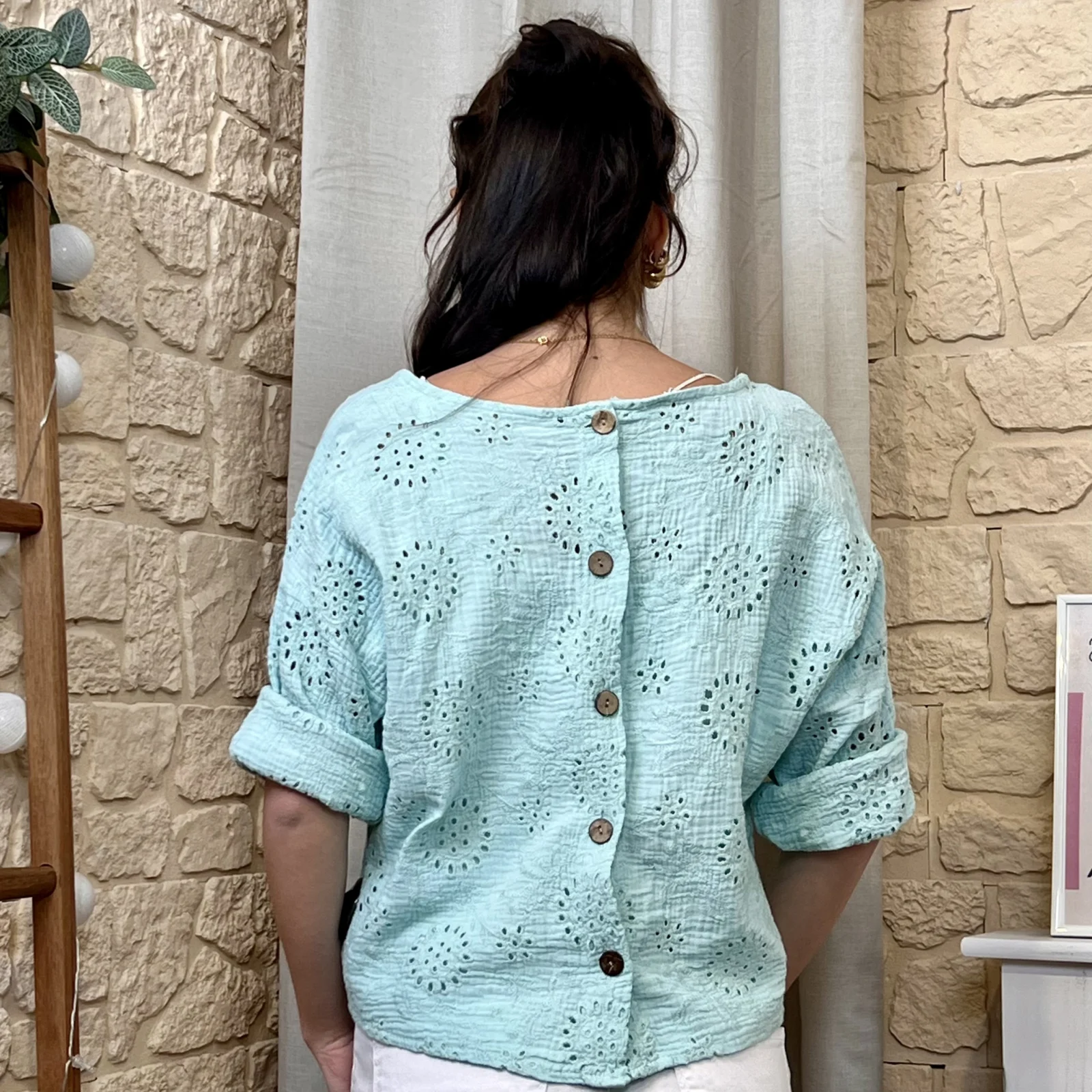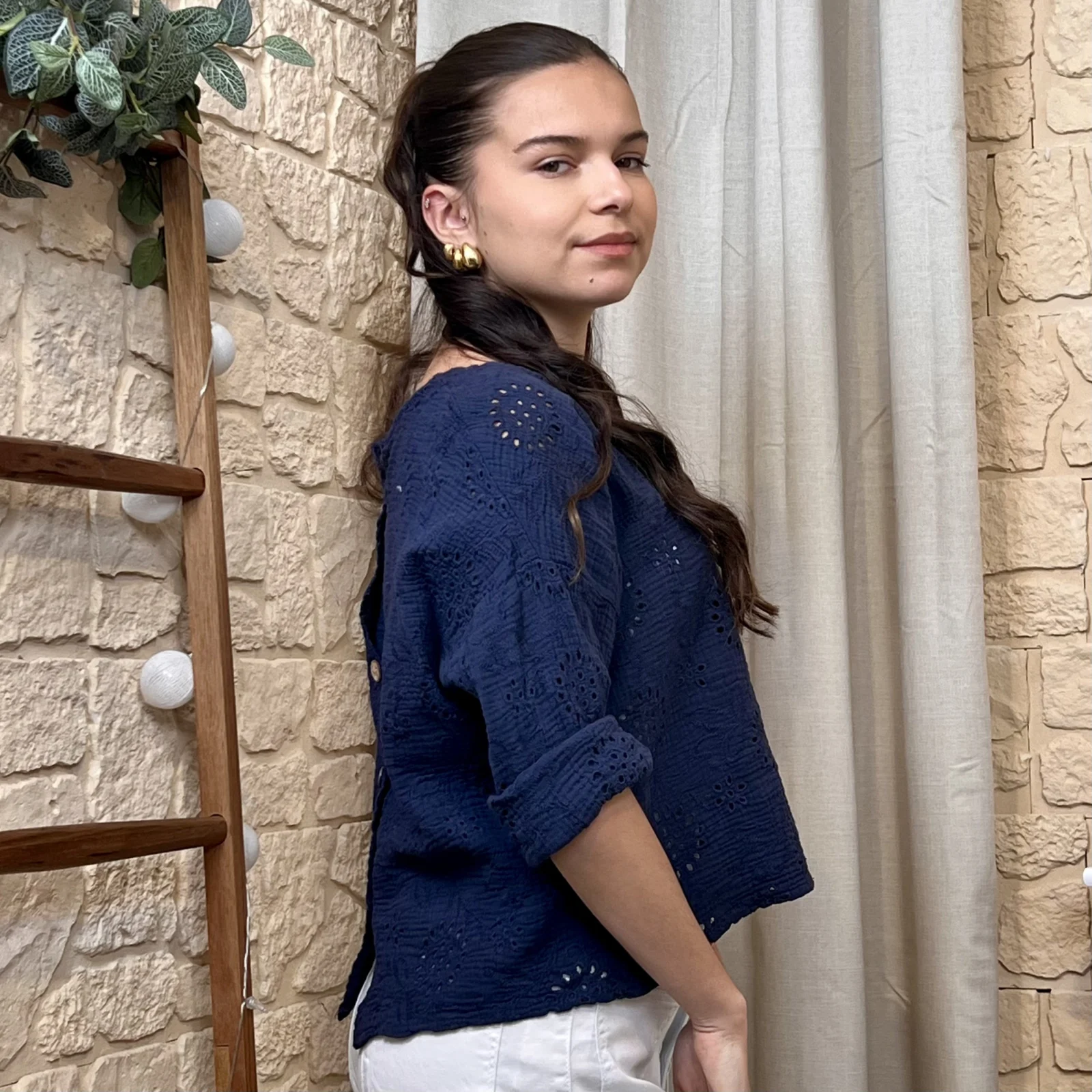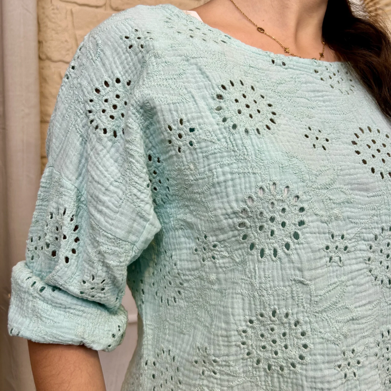 Son tissu texturé avec broderies ajourées apporte du relief et une touche de raffinement. Sa coupe ample et fluide assure un confort optimal tout en sublimant la silhouette.