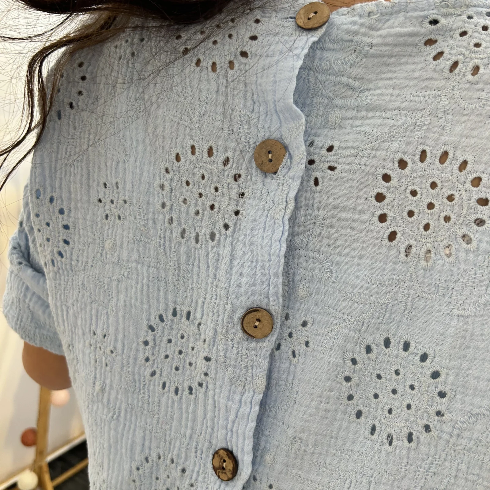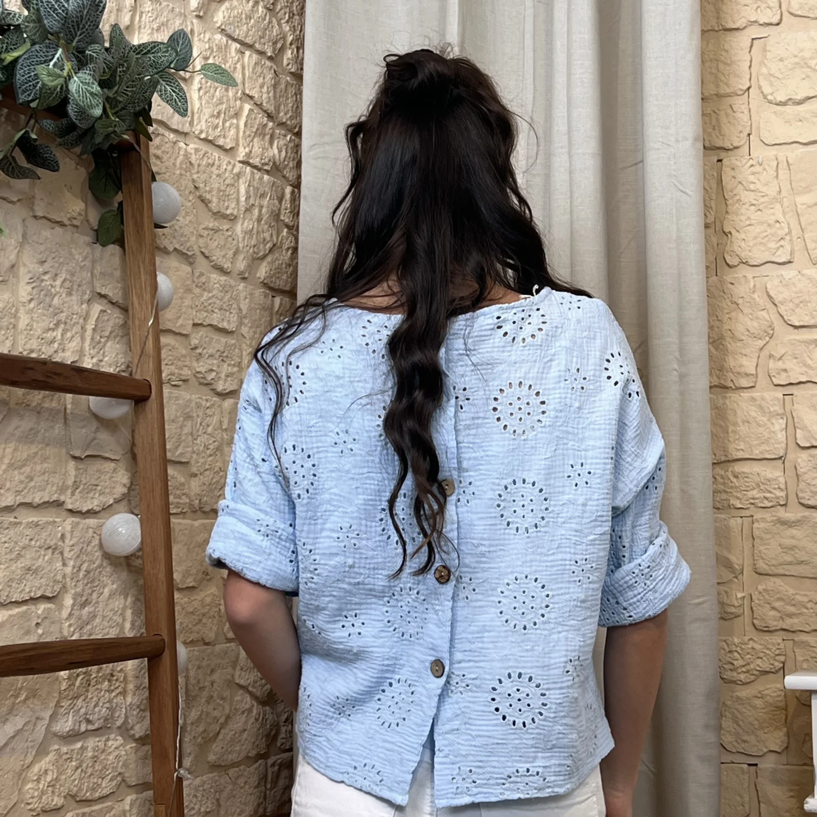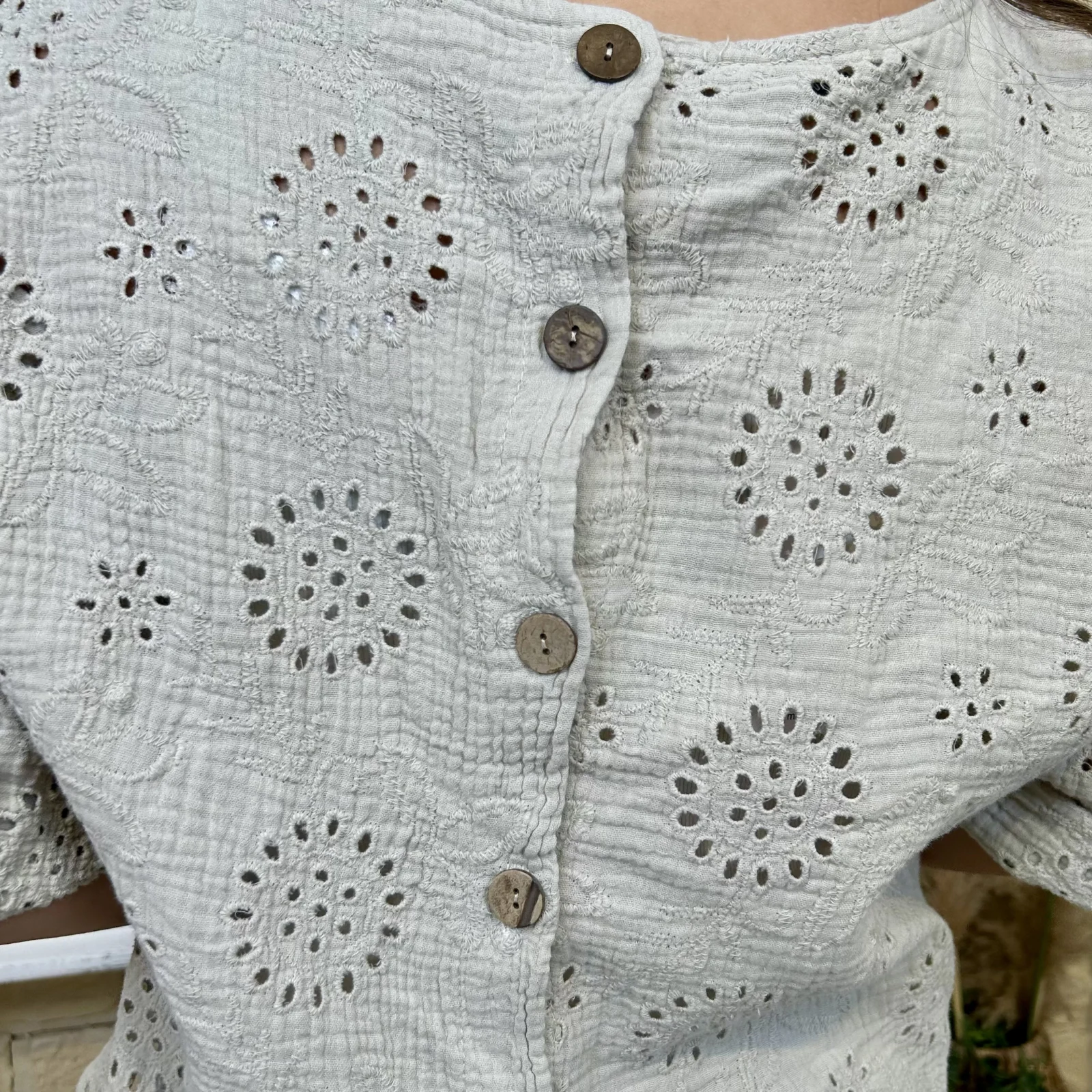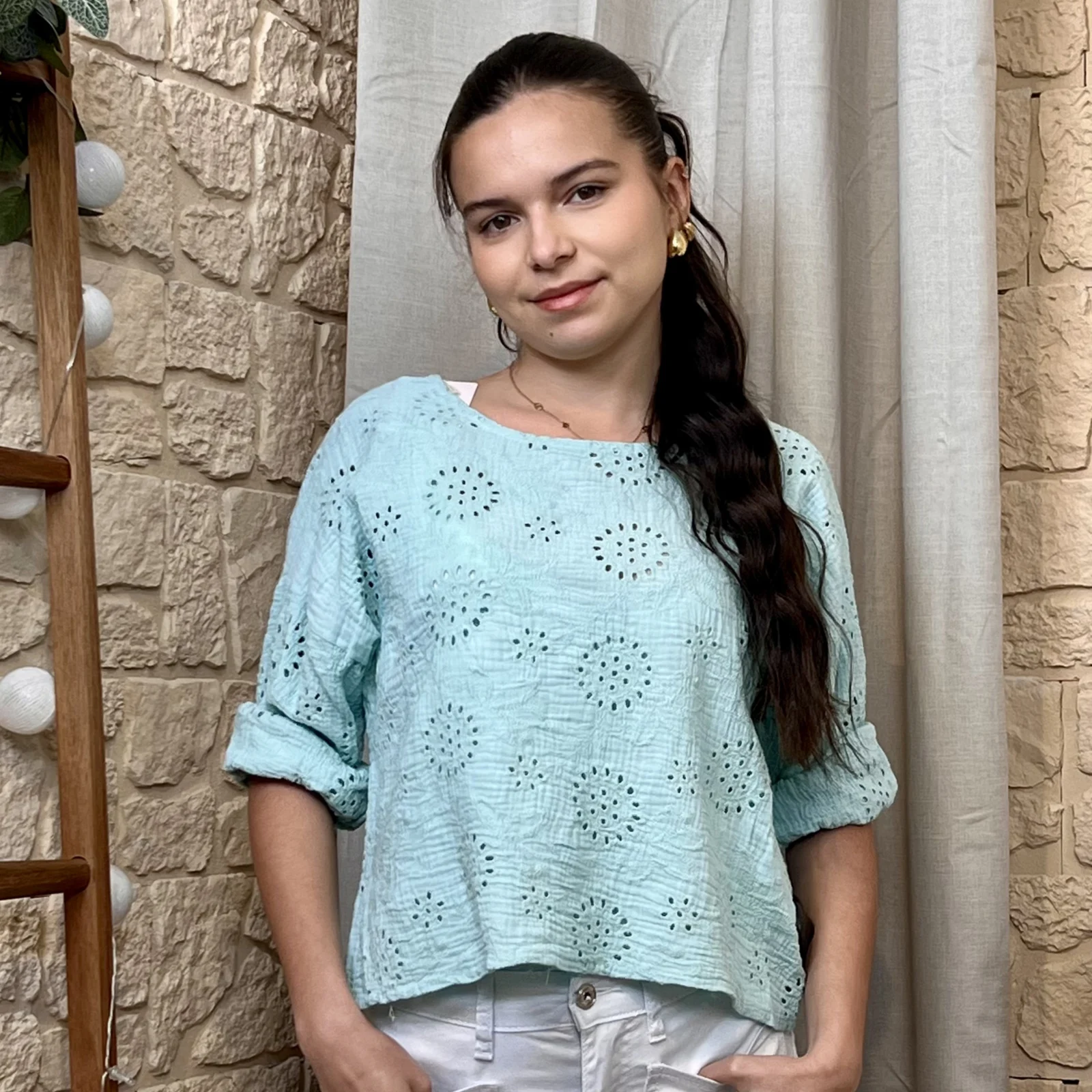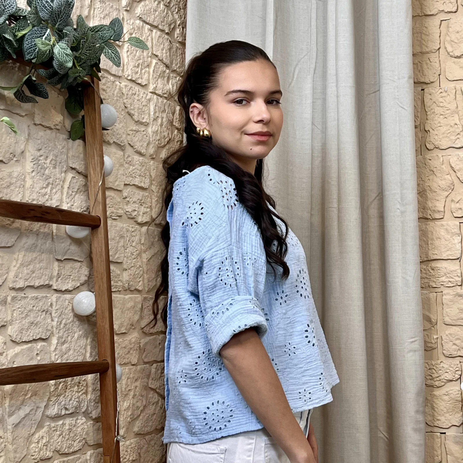 Son tissu texturé avec broderies ajourées apporte du relief et une touche de raffinement. Sa coupe ample et fluide assure un confort optimal tout en sublimant la silhouette.