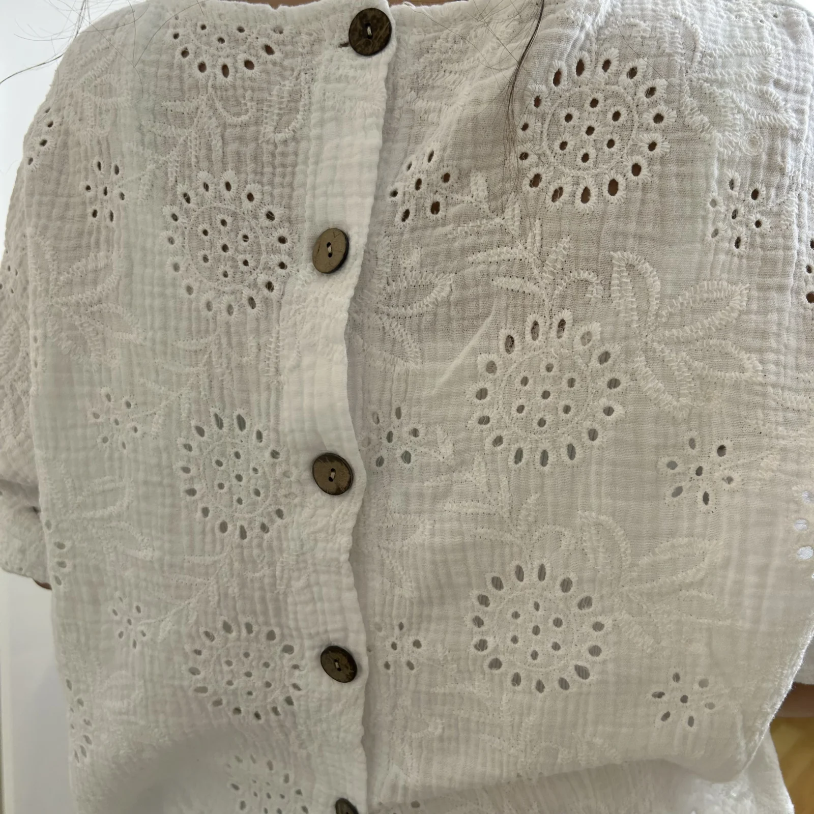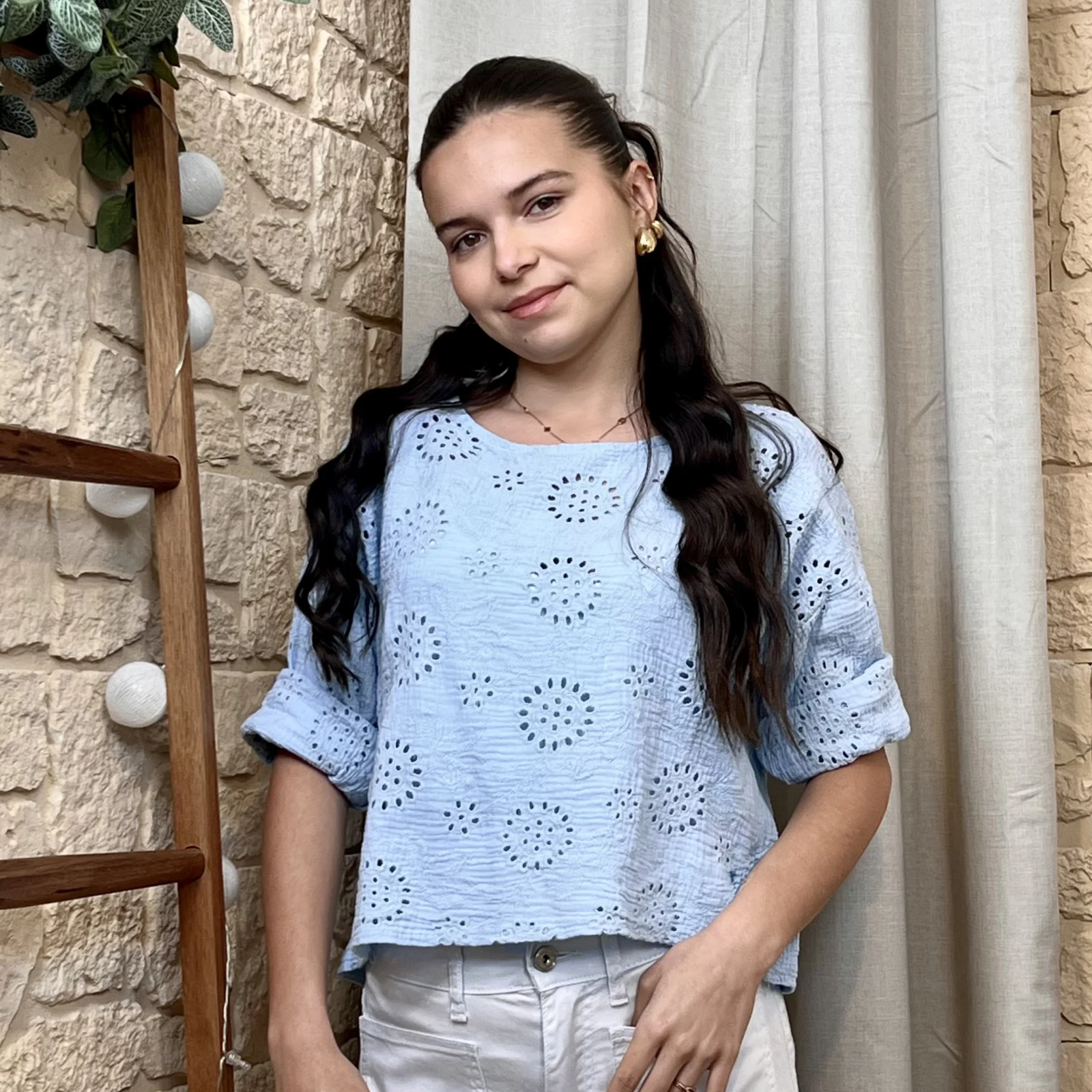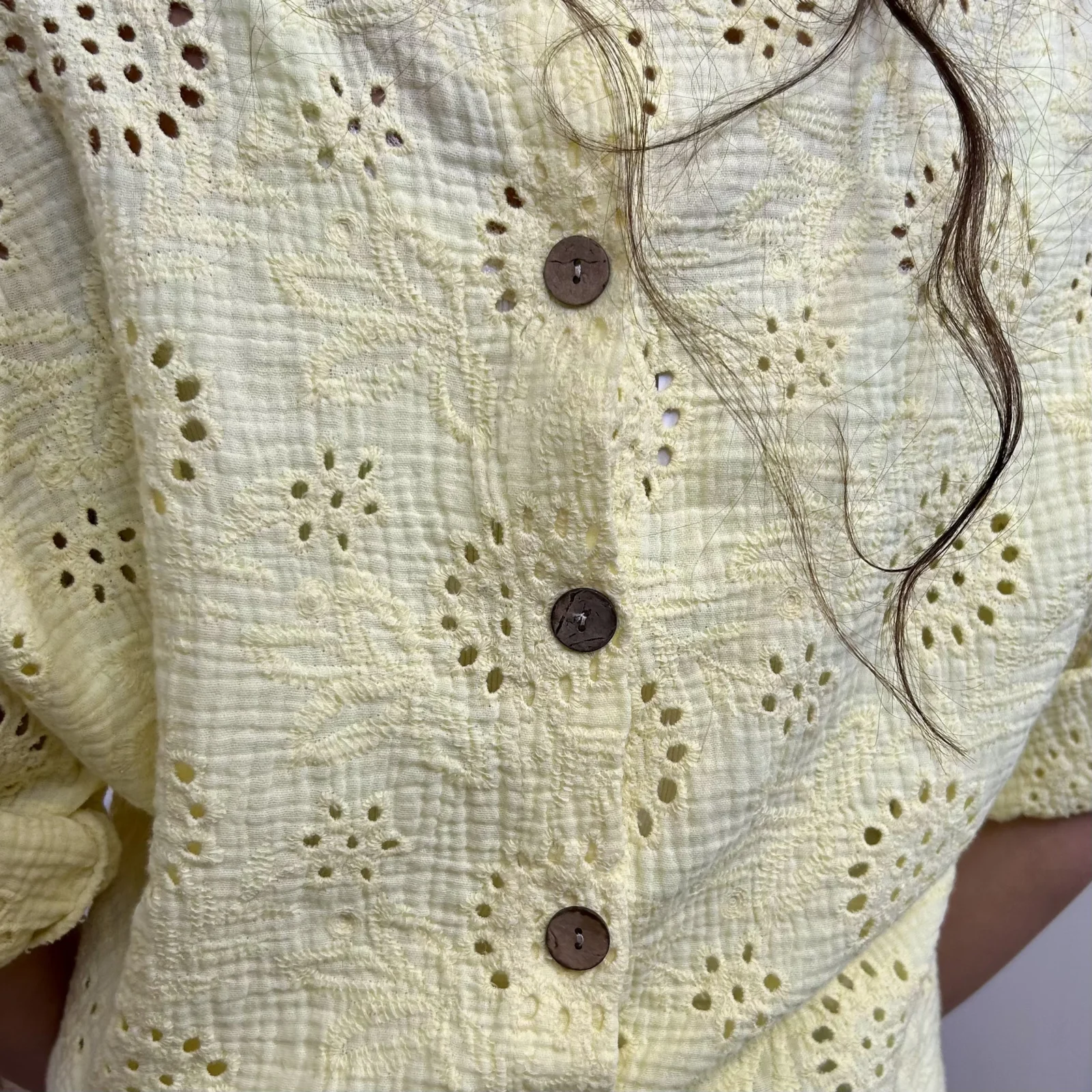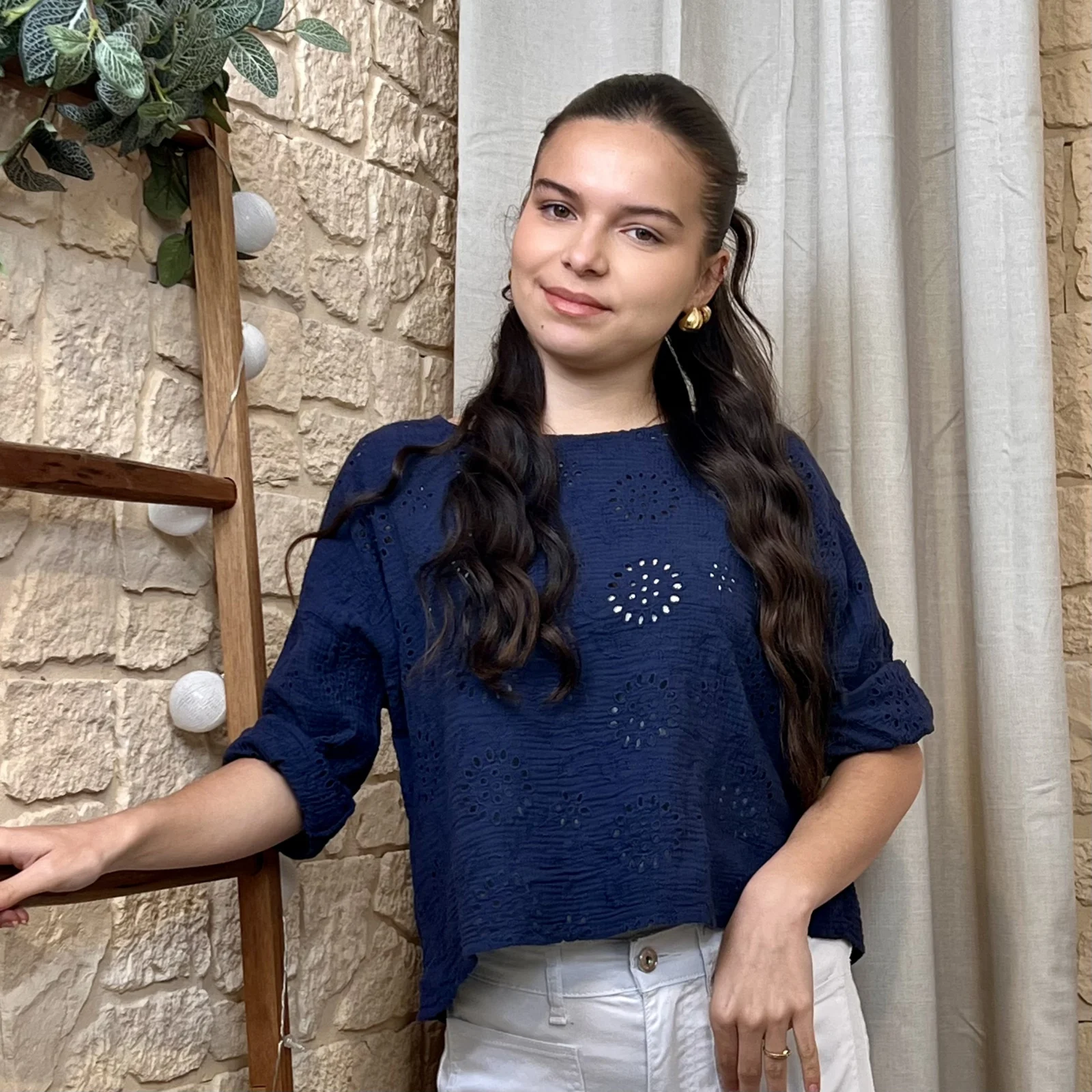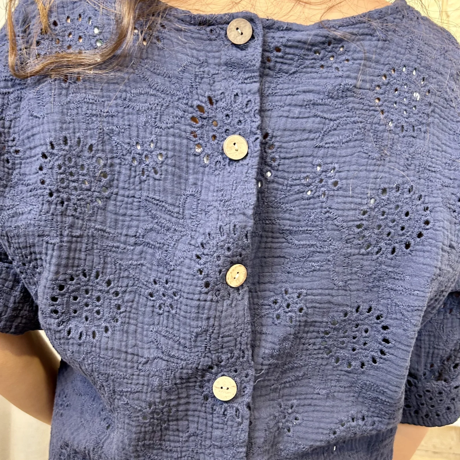 Son tissu texturé avec broderies ajourées apporte du relief et une touche de raffinement. Sa coupe ample et fluide assure un confort optimal tout en sublimant la silhouette.