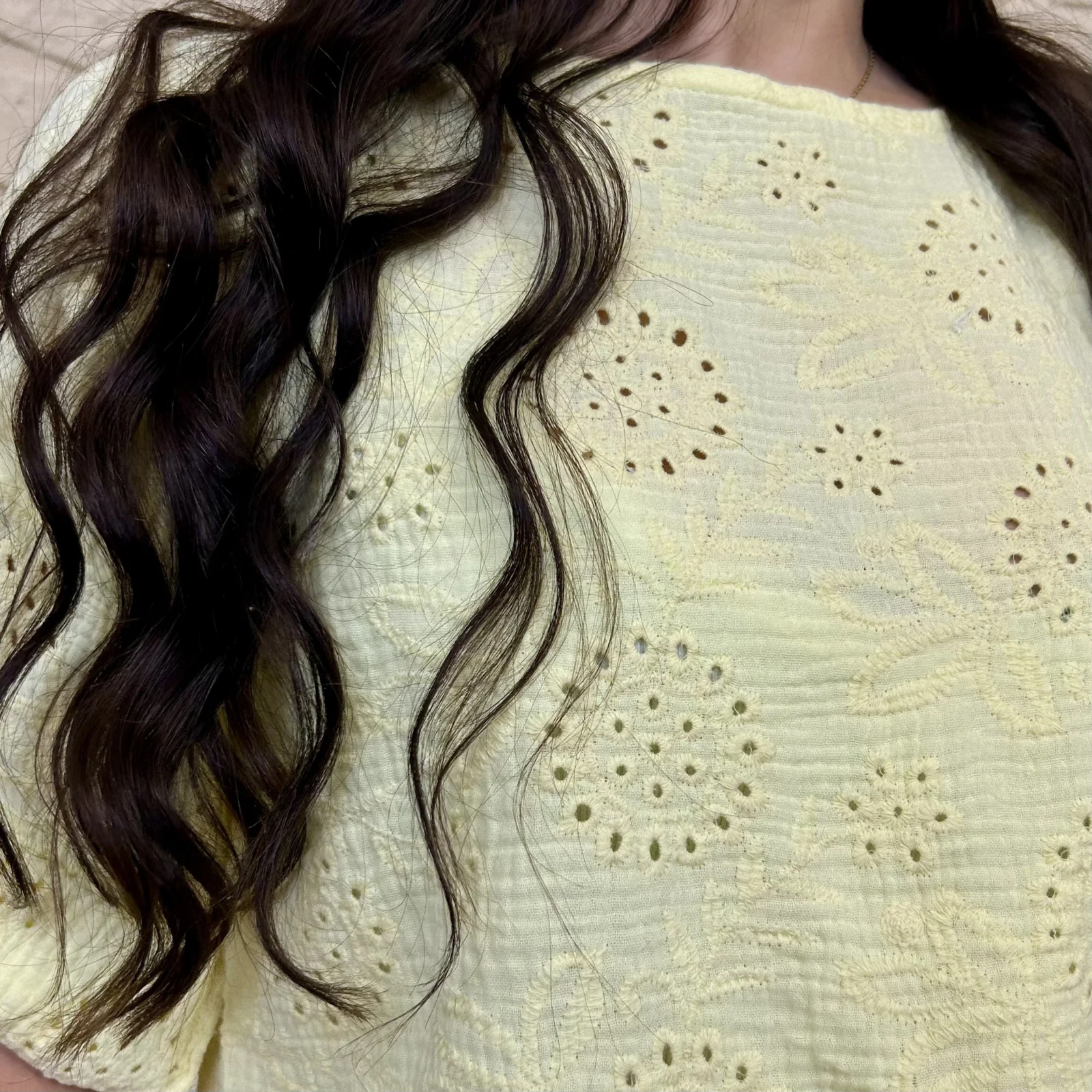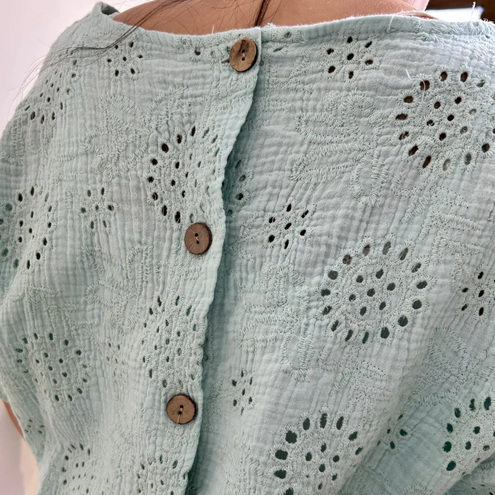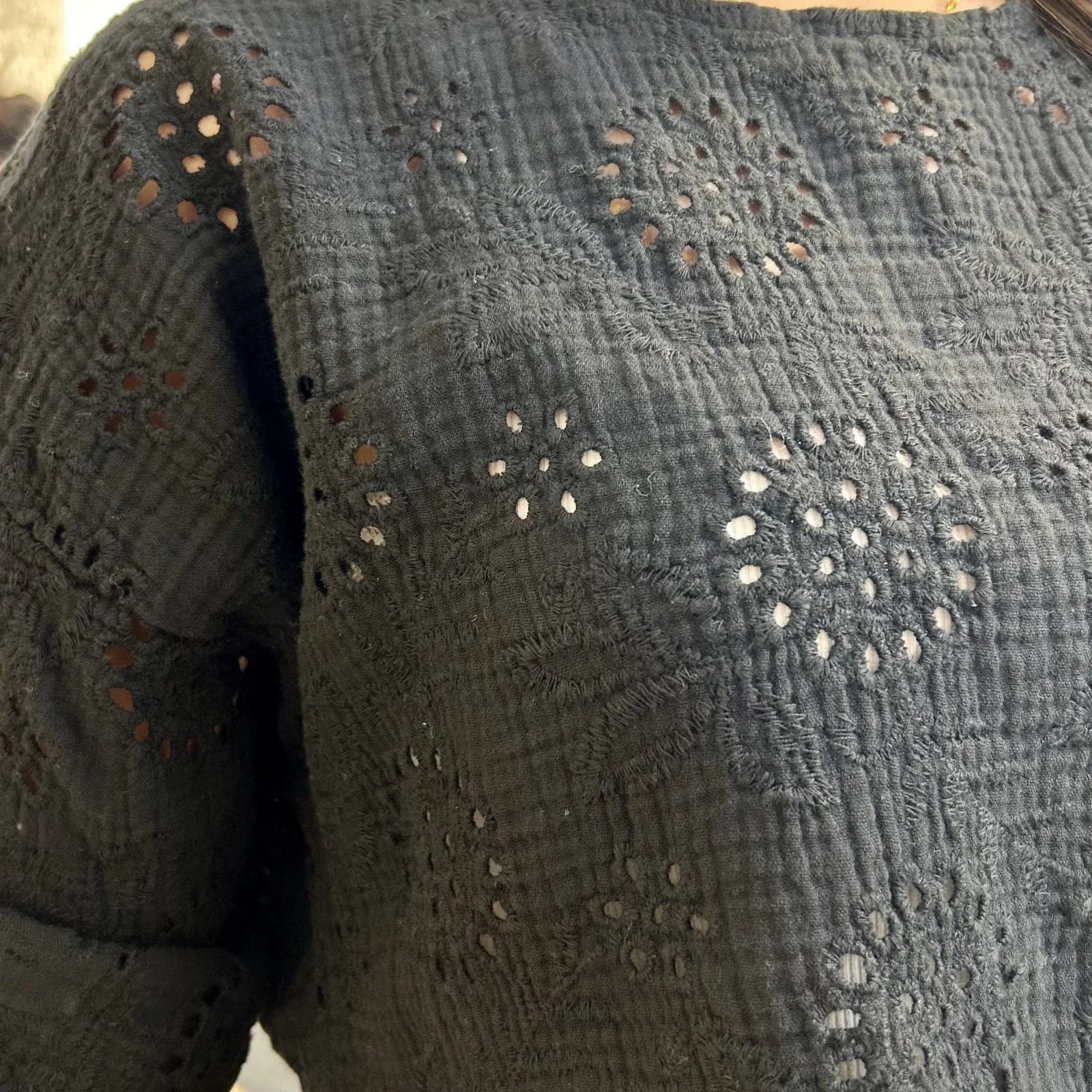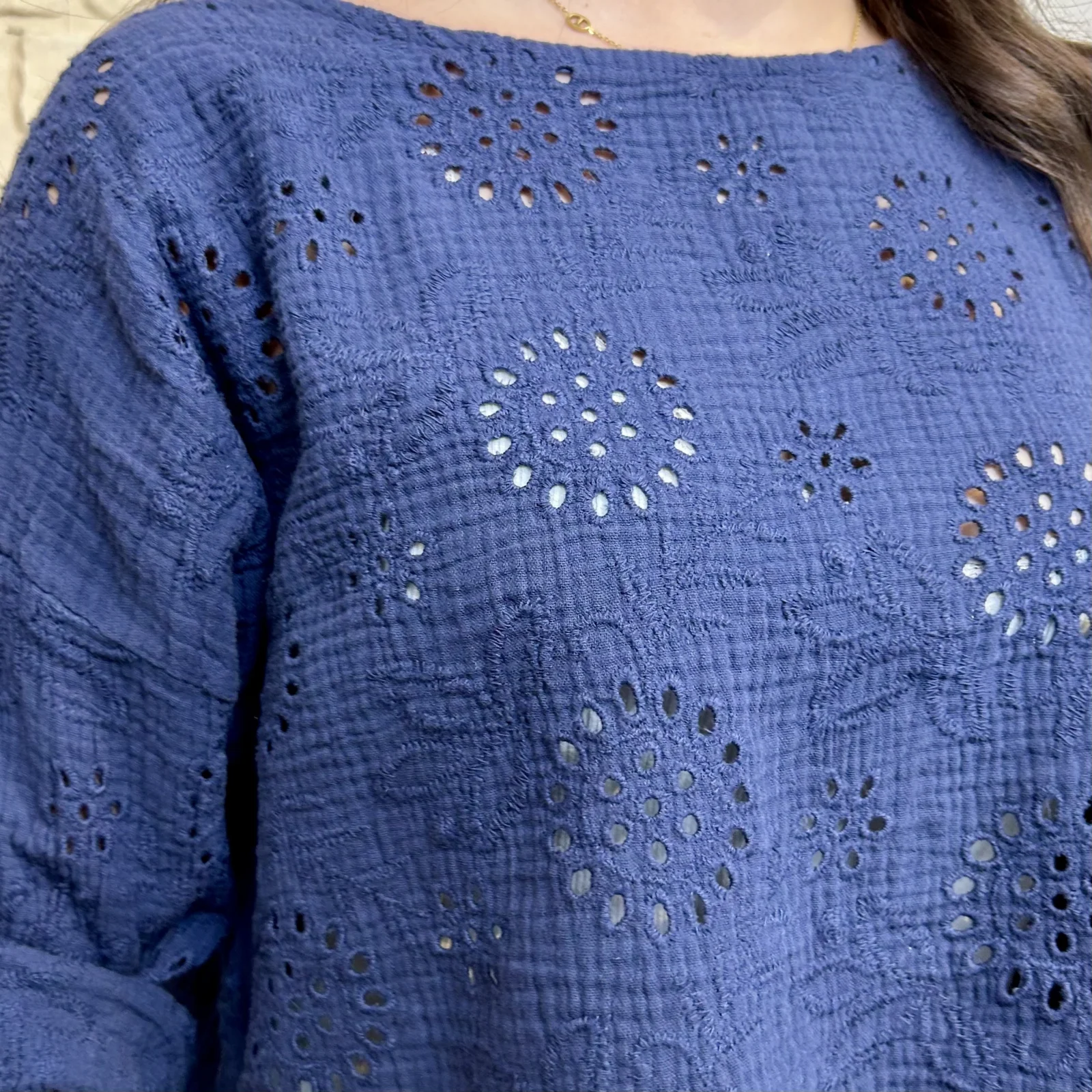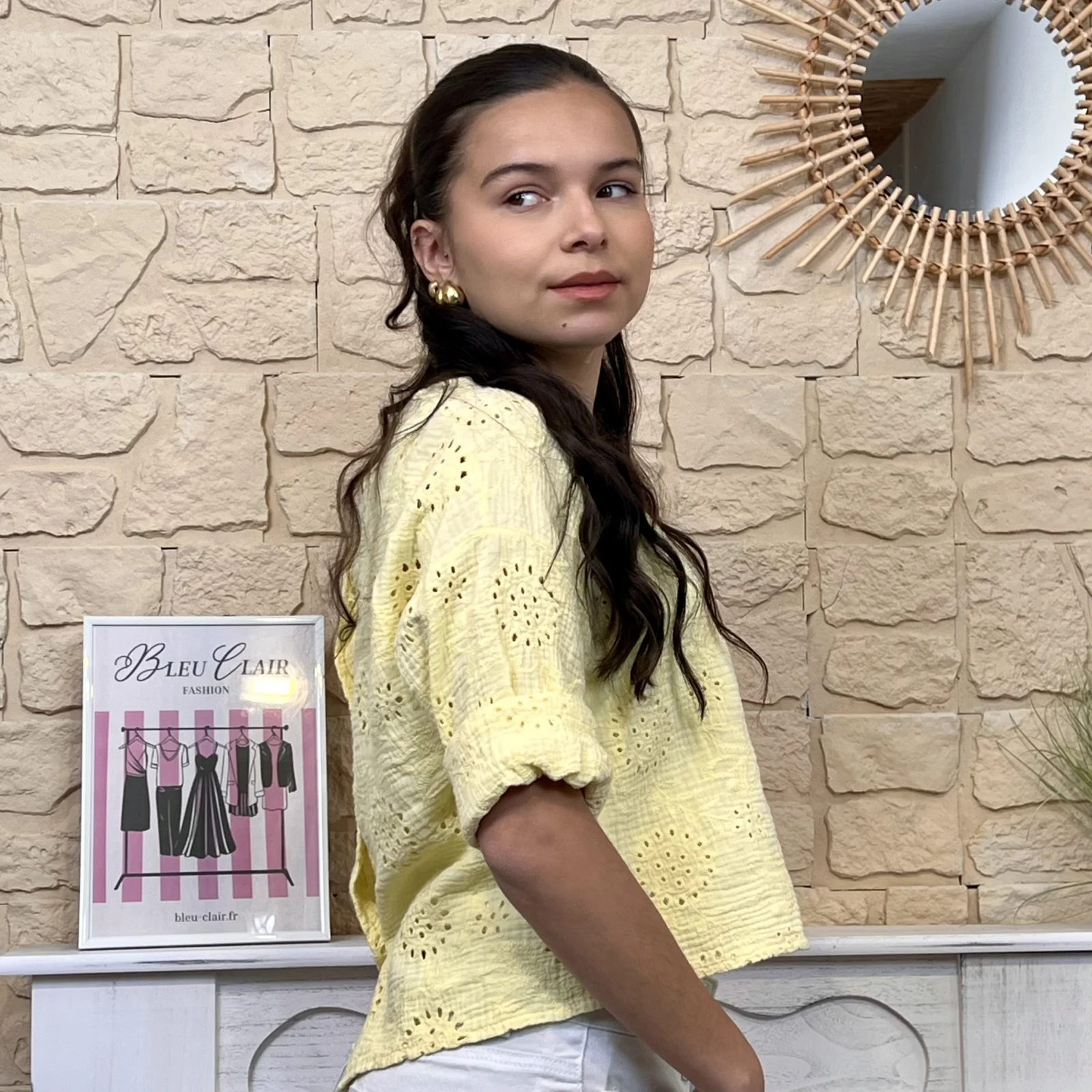 Son tissu texturé avec broderies ajourées apporte du relief et une touche de raffinement. Sa coupe ample et fluide assure un confort optimal tout en sublimant la silhouette.