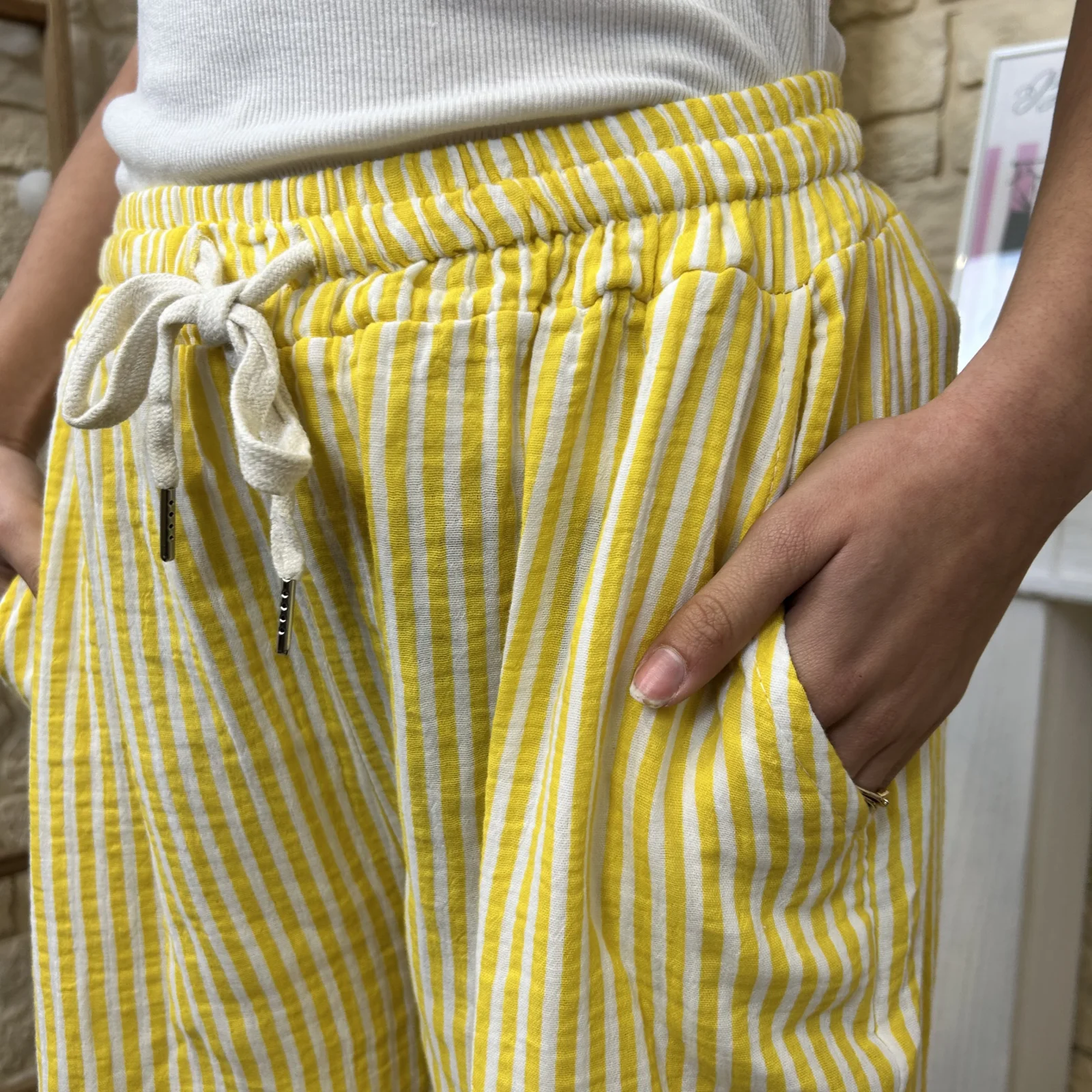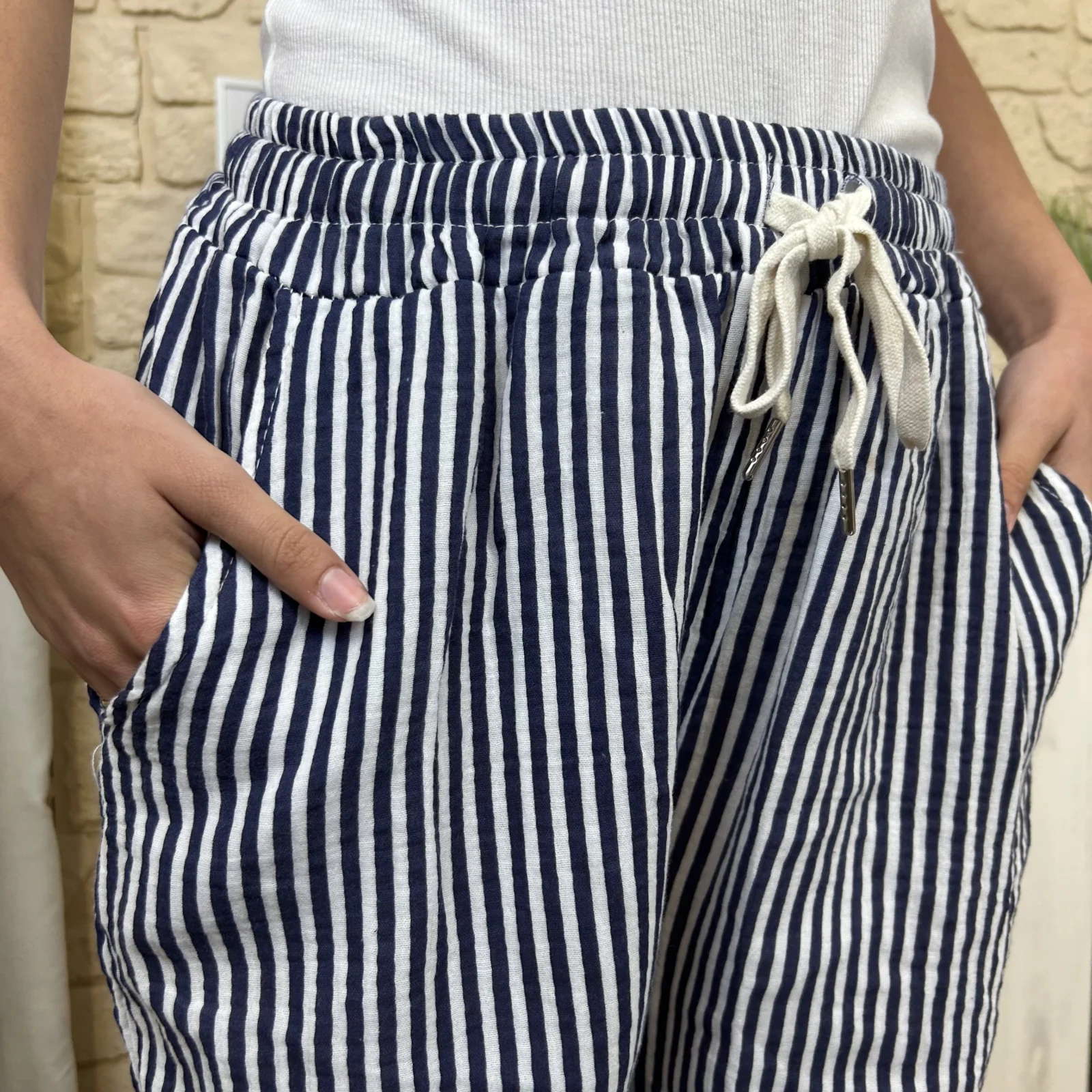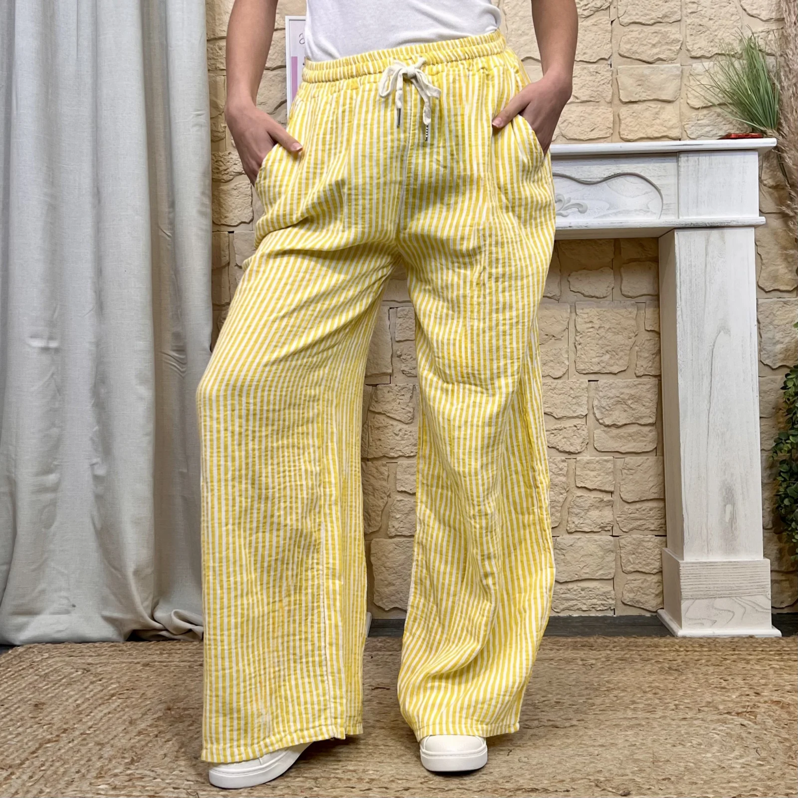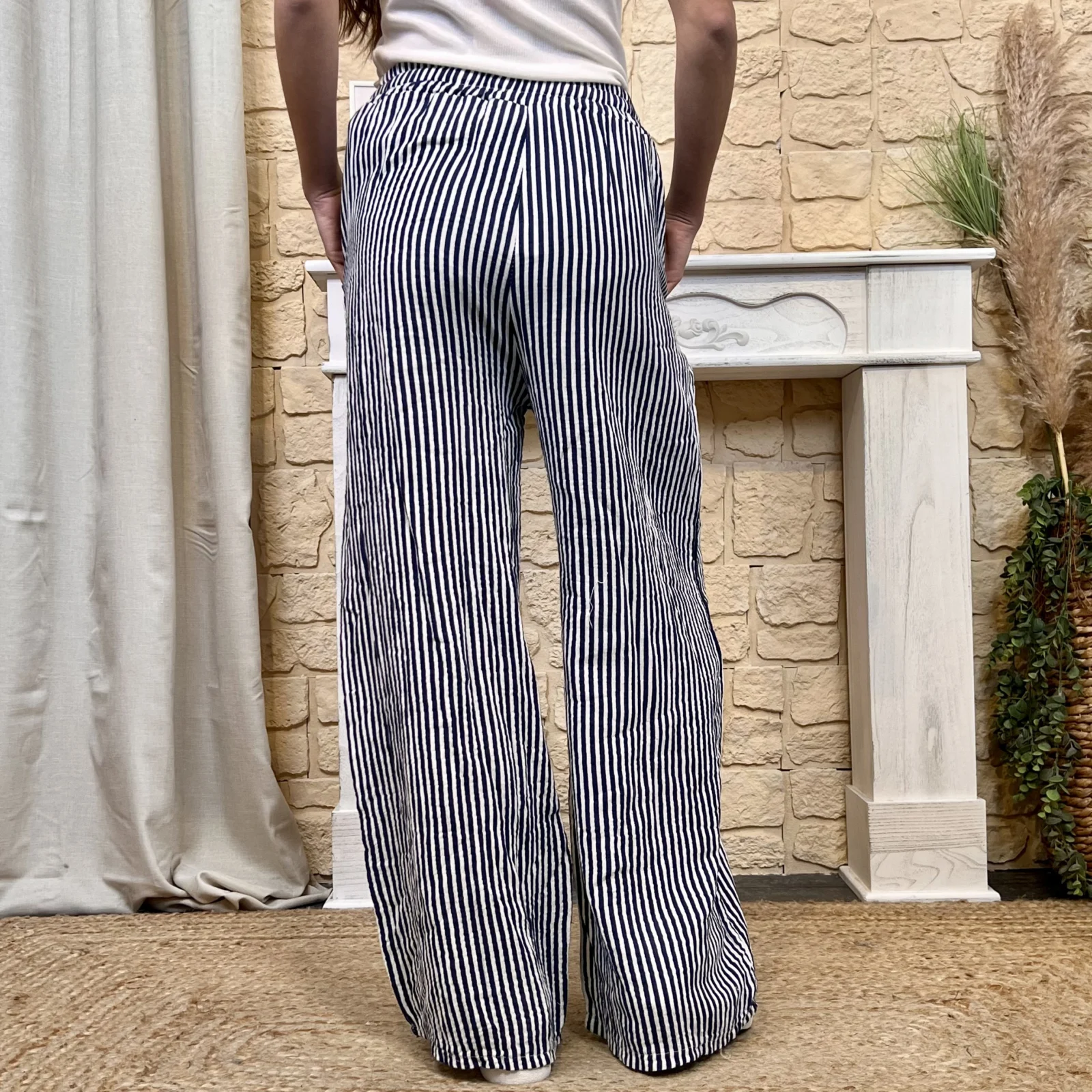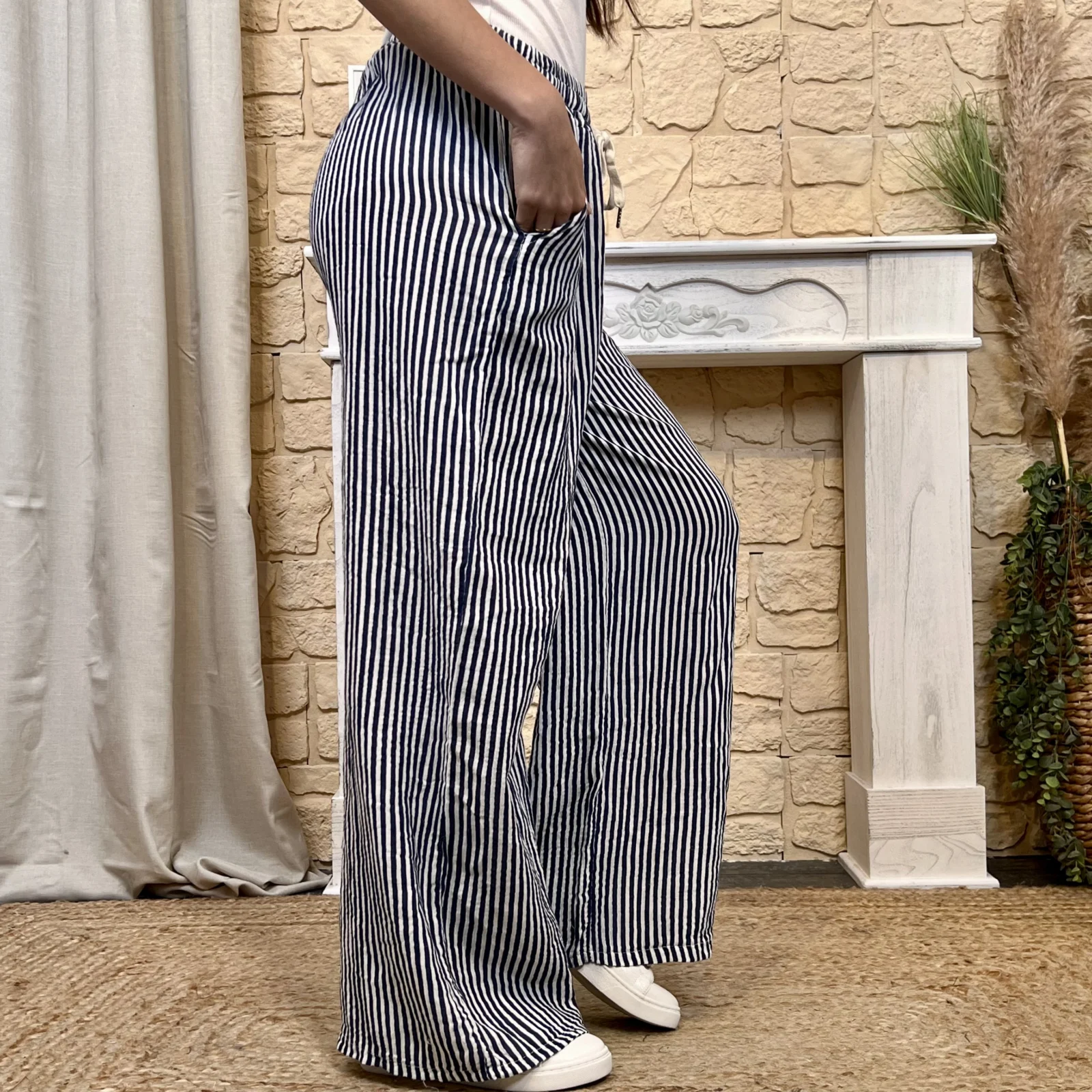 Ce pantalon palazzo en coton est une pièce incontournable pour un look estival à la fois élégant et décontracté. Sa coupe évasée allonge la silhouette, tandis que son imprimé rayé apporte une touche tendance et moderne.
