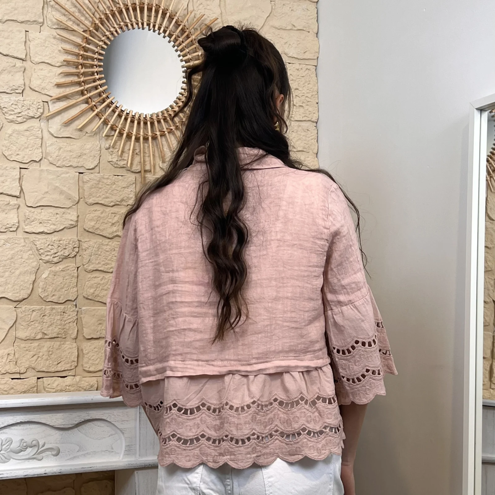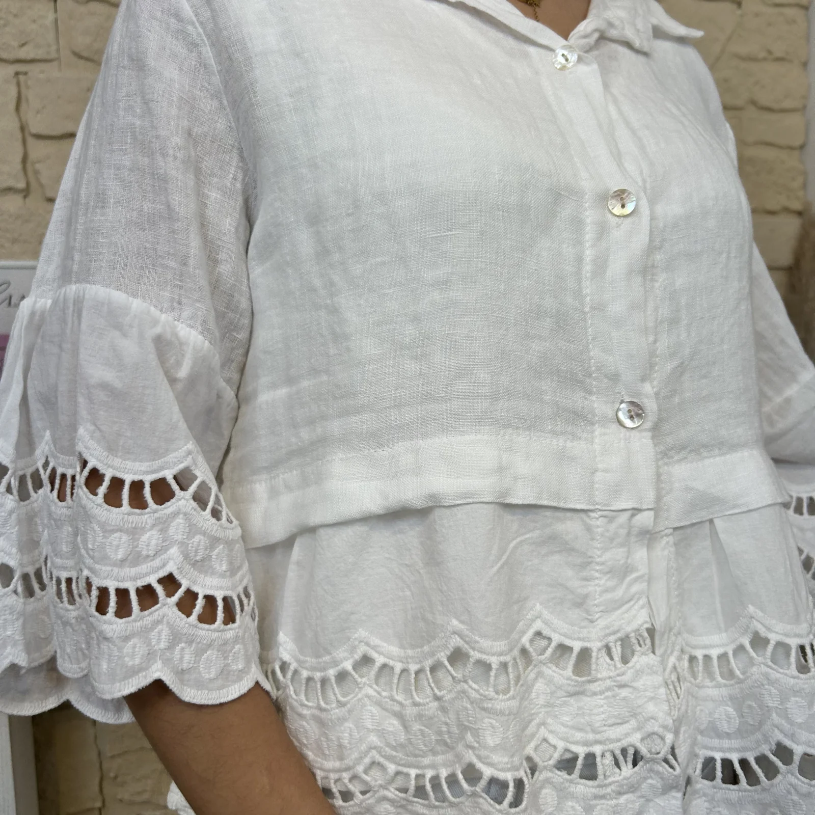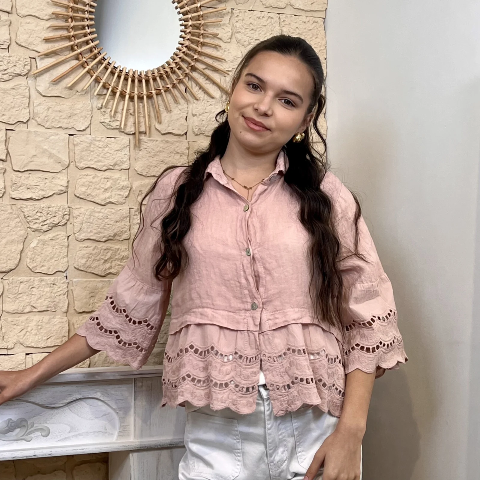 Son design délicatement travaillé avec finitions en dentelle ajourée sur les manches et le bas crée un effet raffiné et féminin. Doté de manches 3/4 évasées et d’une coupe ample, ce chemisier assure une allure moderne et tendance, tout en convenant à différentes morphologies grâce à sa taille unique.