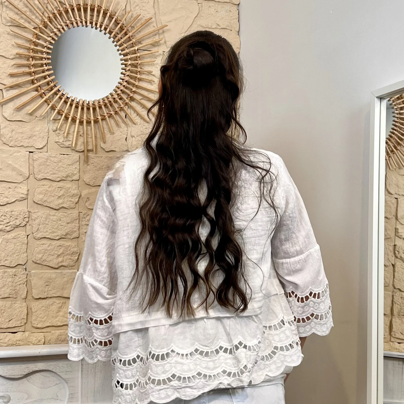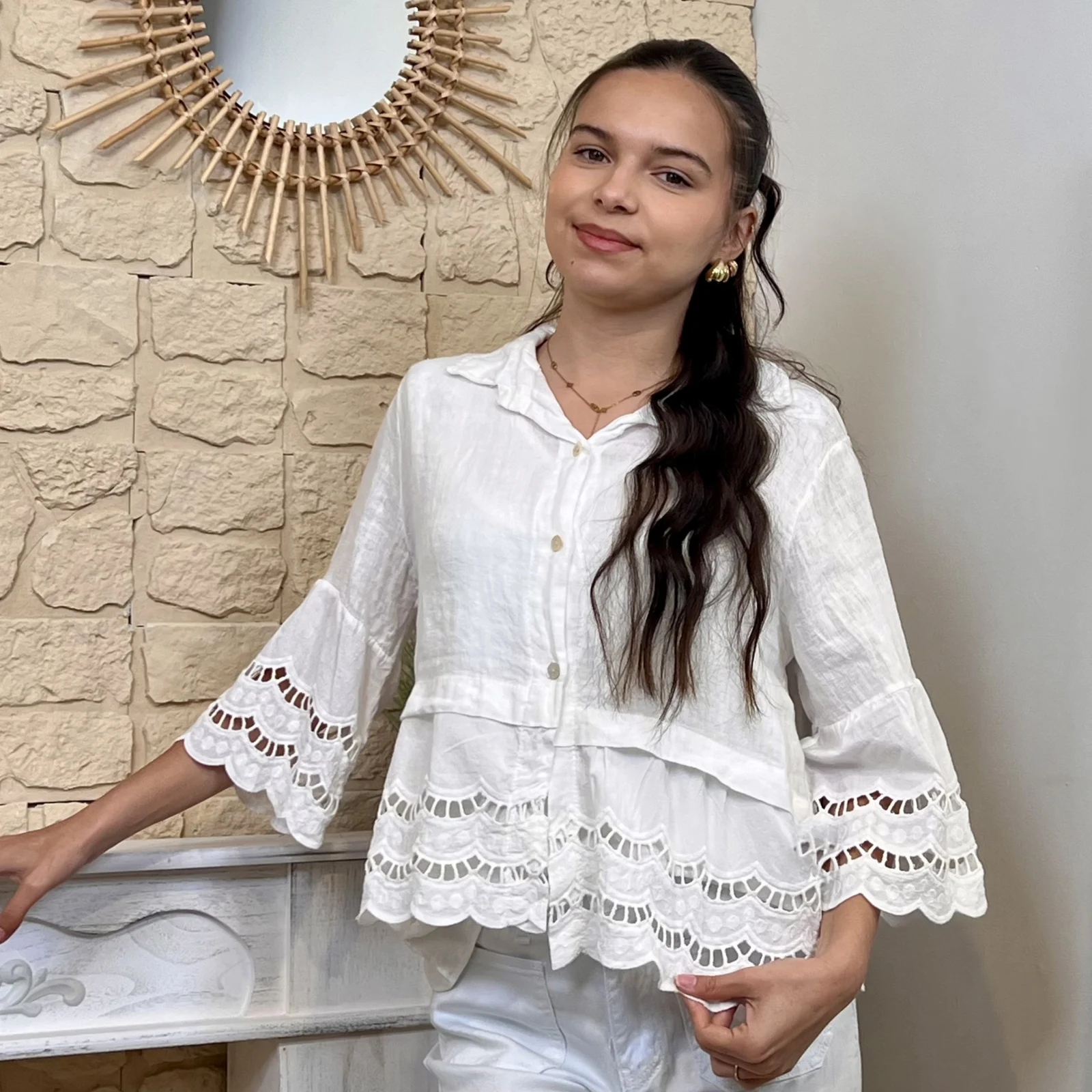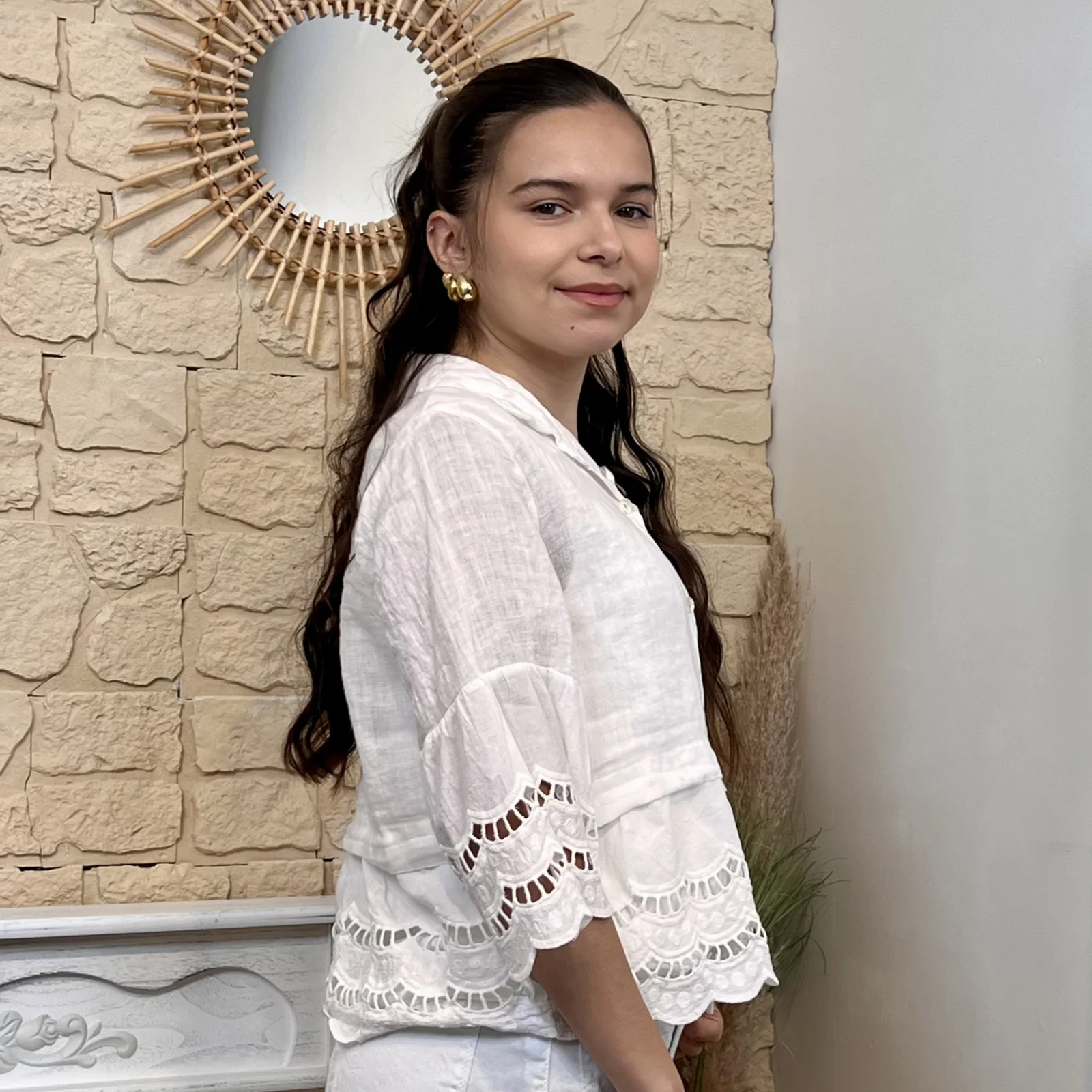 Laisse-toi séduire par ce chemisier blanc bohème à dentelle, une pièce à la fois chic et romantique, idéale pour sublimer tes looks du quotidien. Confectionné dans une matière légère et fluide, il offre un confort absolu tout en apportant une touche d’élégance naturelle.