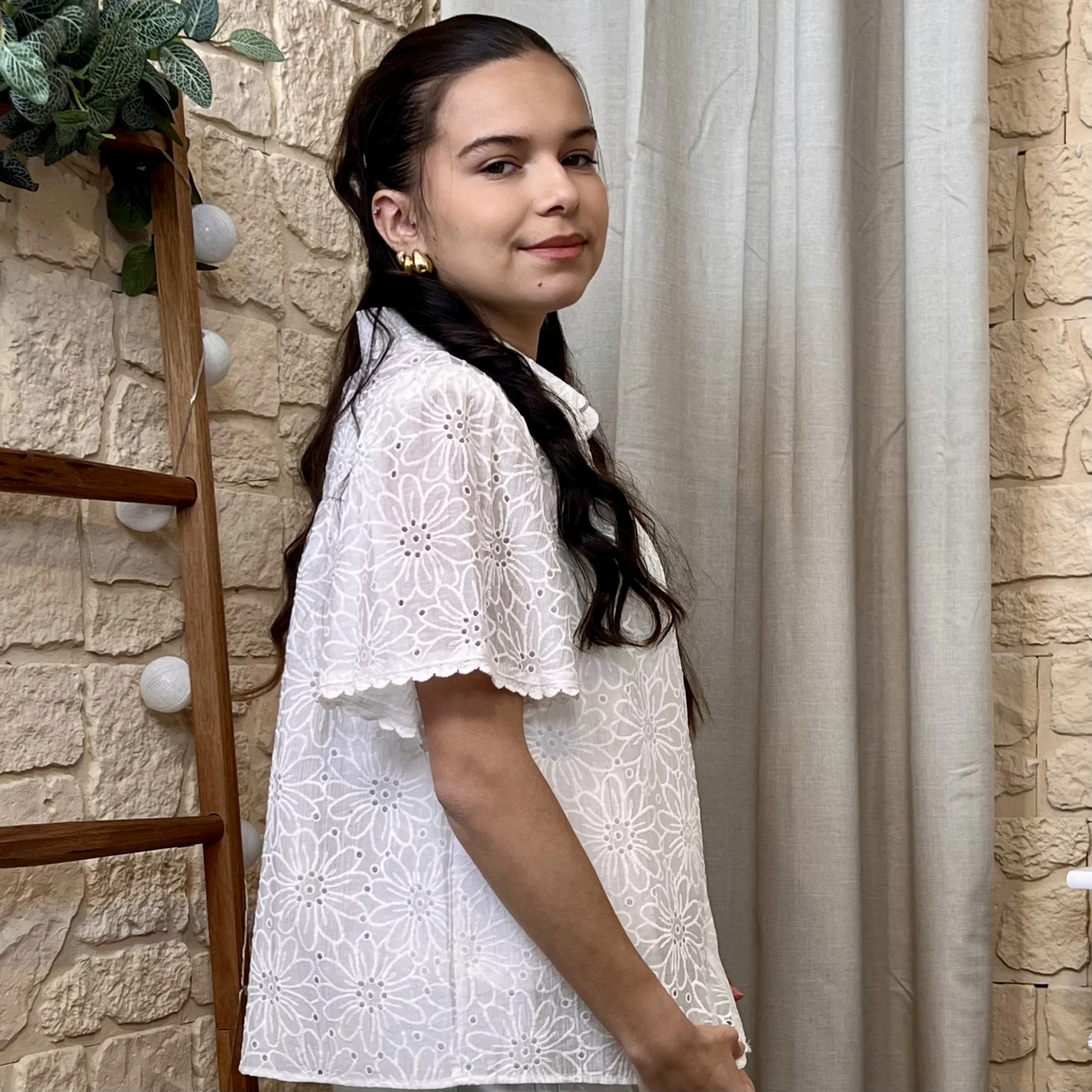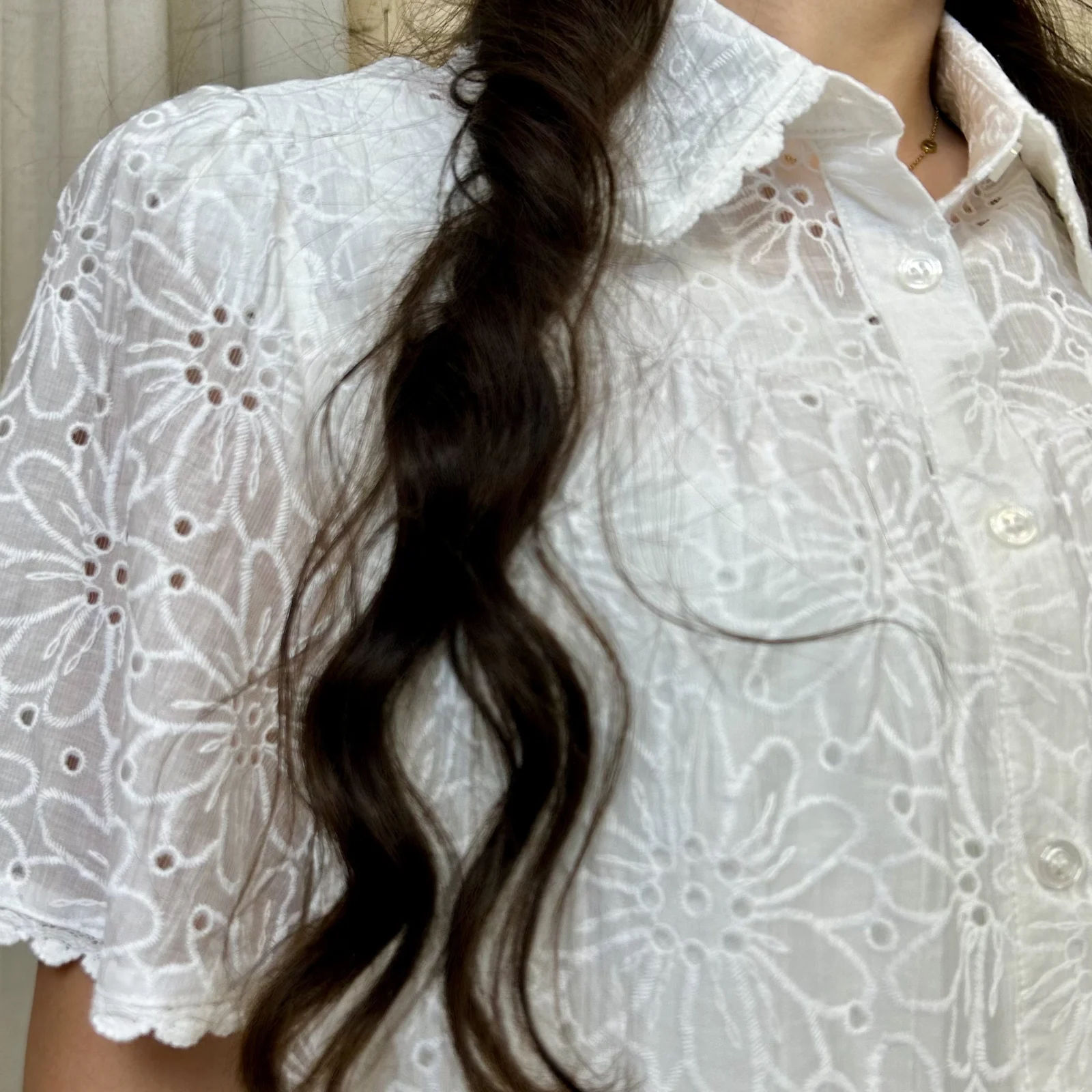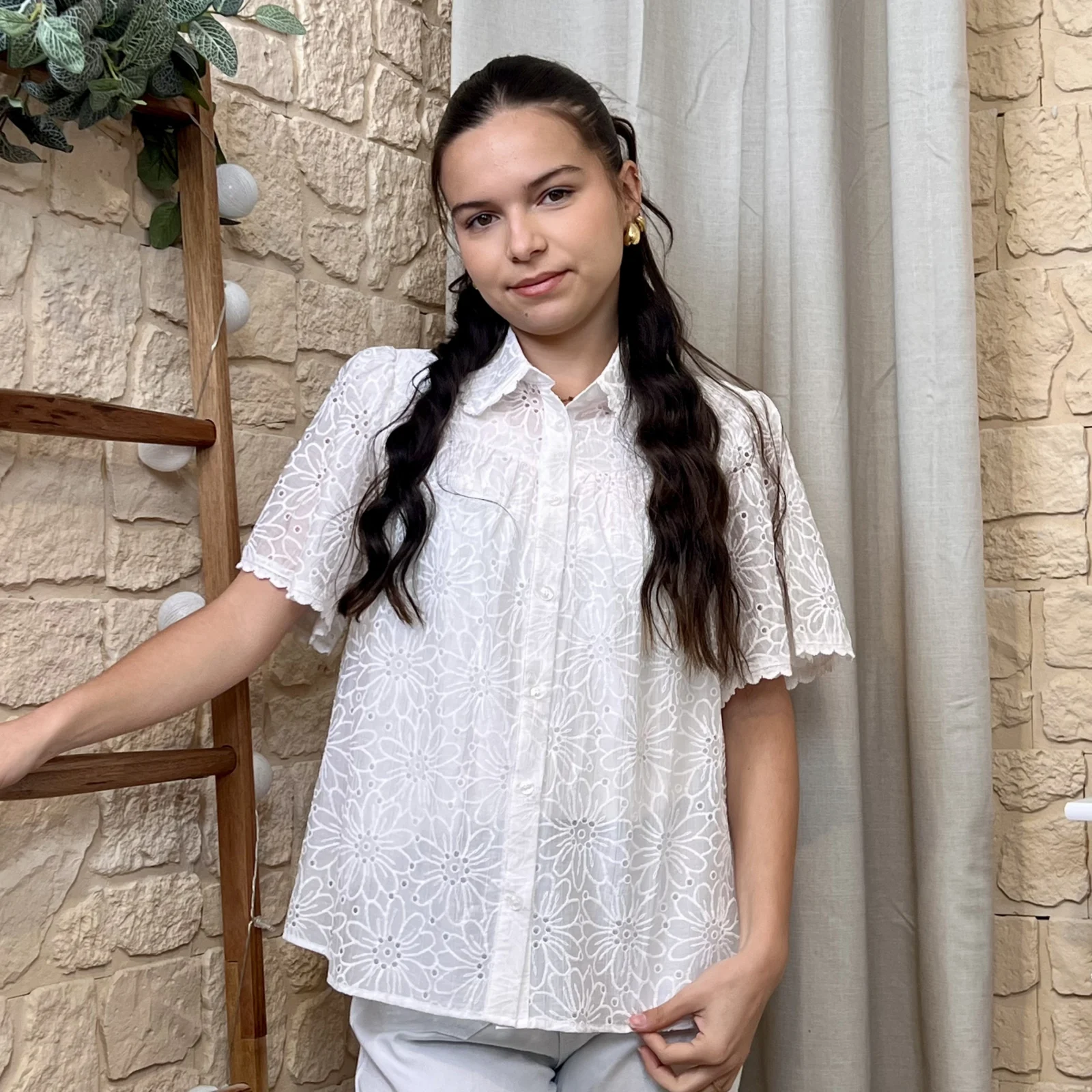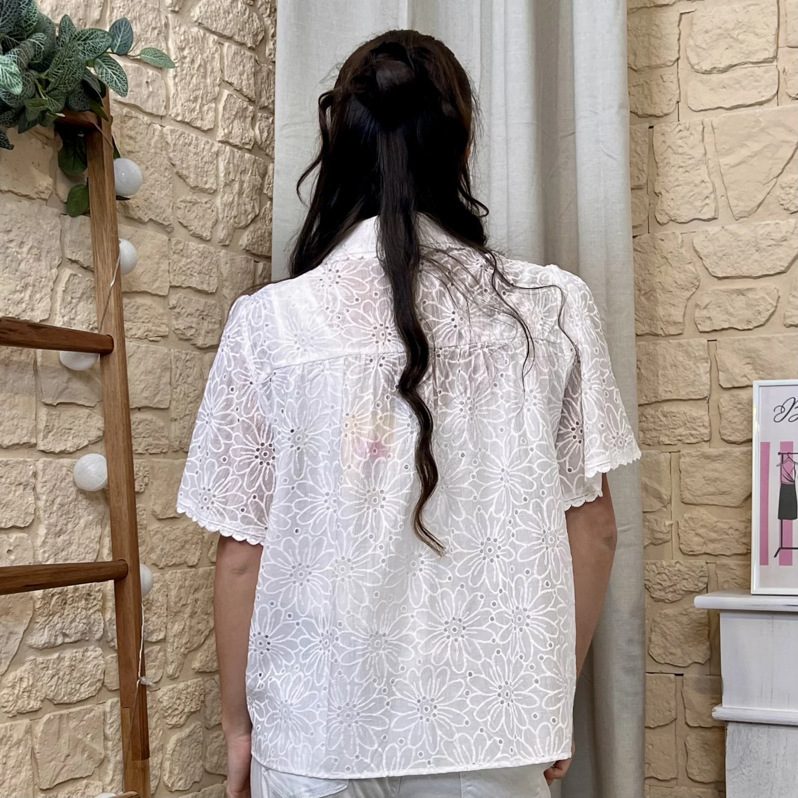 Conçu dans une matière fluide et agréable à porter, ce chemisier offre une coupe légèrement ample qui convient à toutes les morphologies. Son col chemise classique, sa fermeture boutonnée et ses manches courtes festonnées ajoutent une finition soignée et tendance.