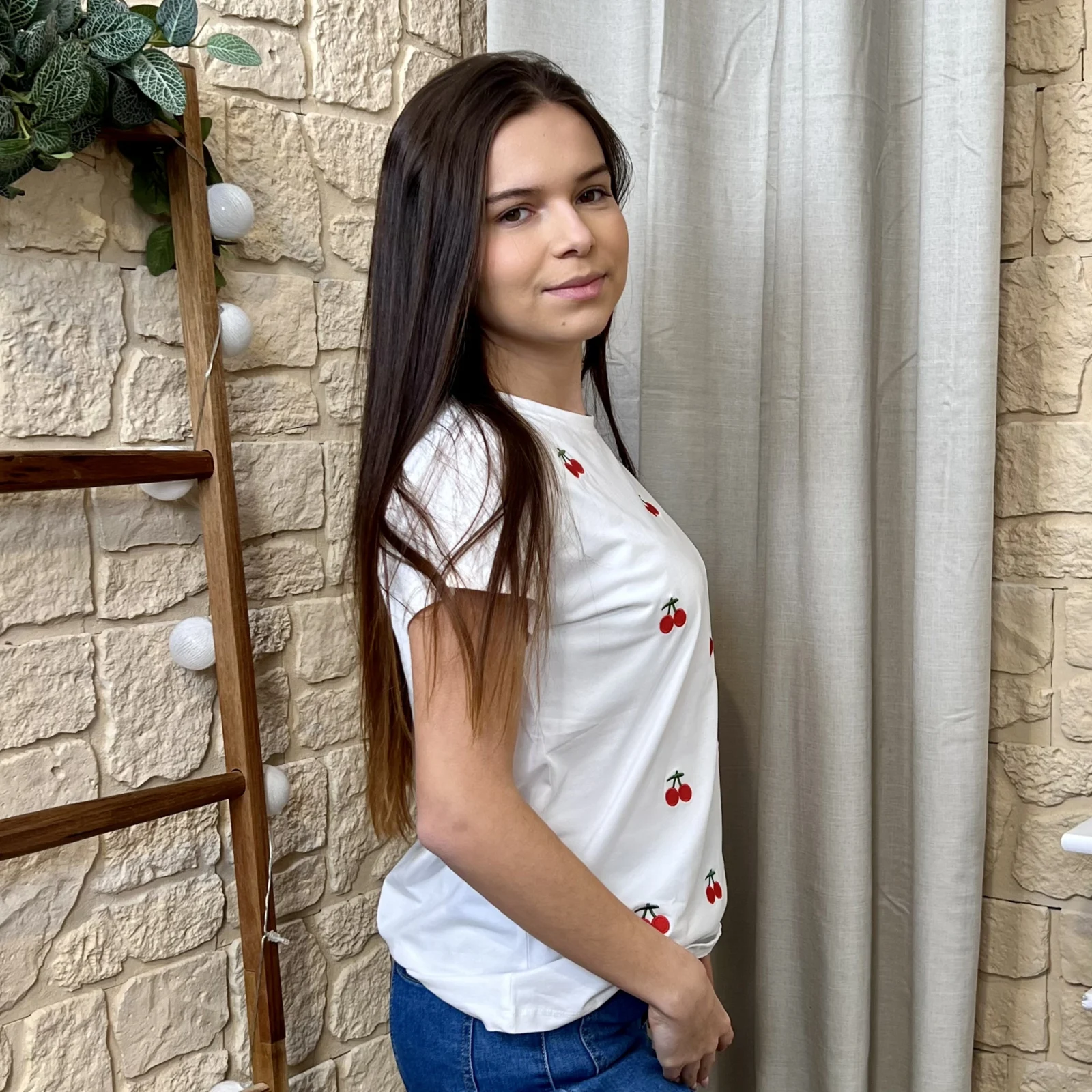Ce t-shirt cerises est la pièce parfaite pour la saison. Léger et tendance, il s’adapte à toutes les situations. Facile à porter avec un jean et des baskets pour un look casual.