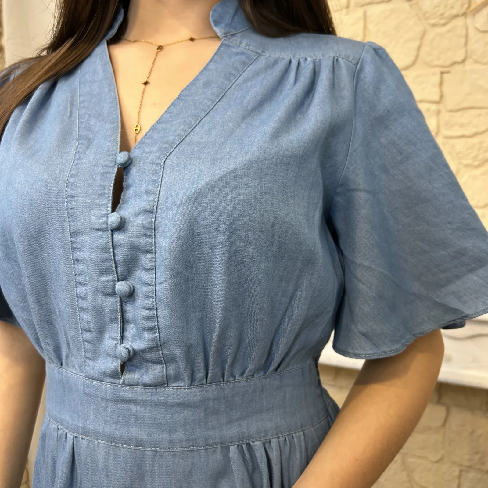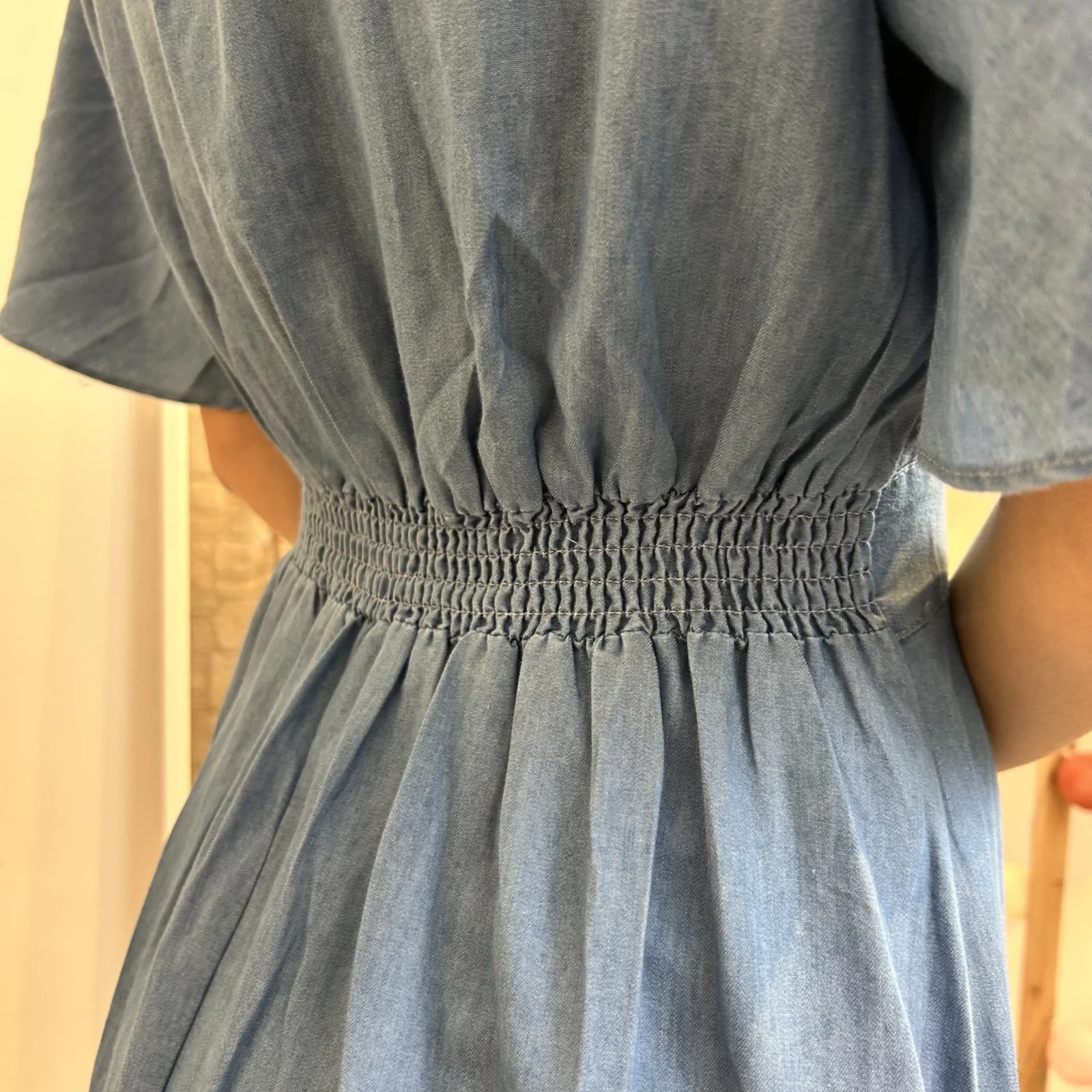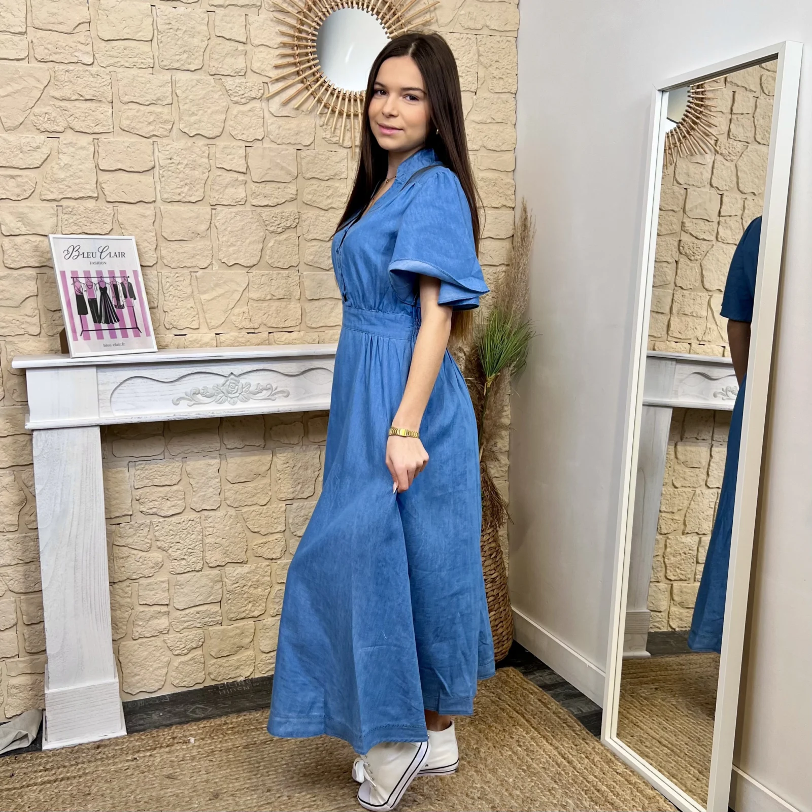 Cette robe longue denim est la pièce parfaite pour cet été ! Elle est légère et fluide, et elle s’associe facilement avec une paire de sandales ou de baskets.