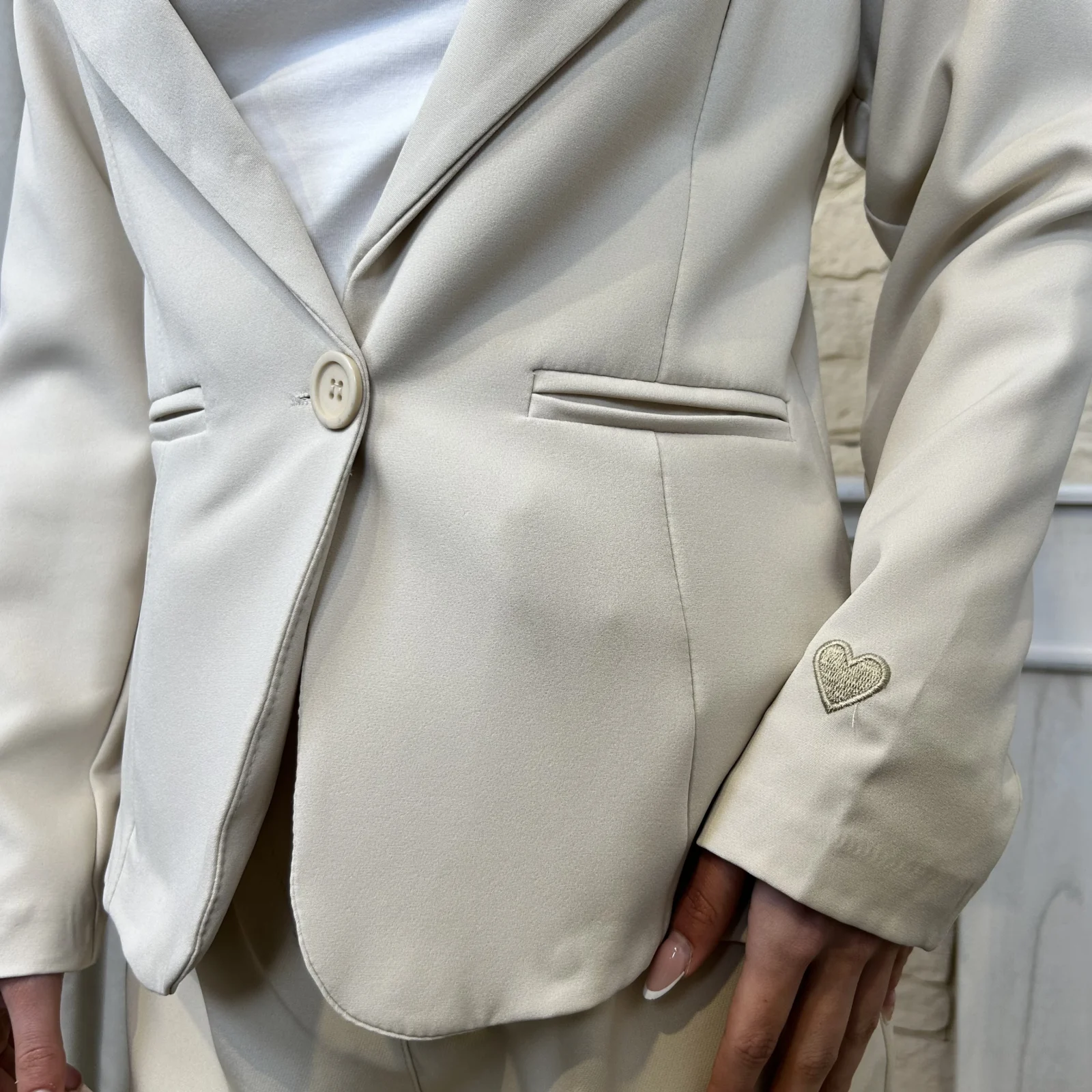 Son cœur brodé sur la manche gauche ajoute une note délicate et originale, tandis que sa coupe ajustée met parfaitement la silhouette en valeur.