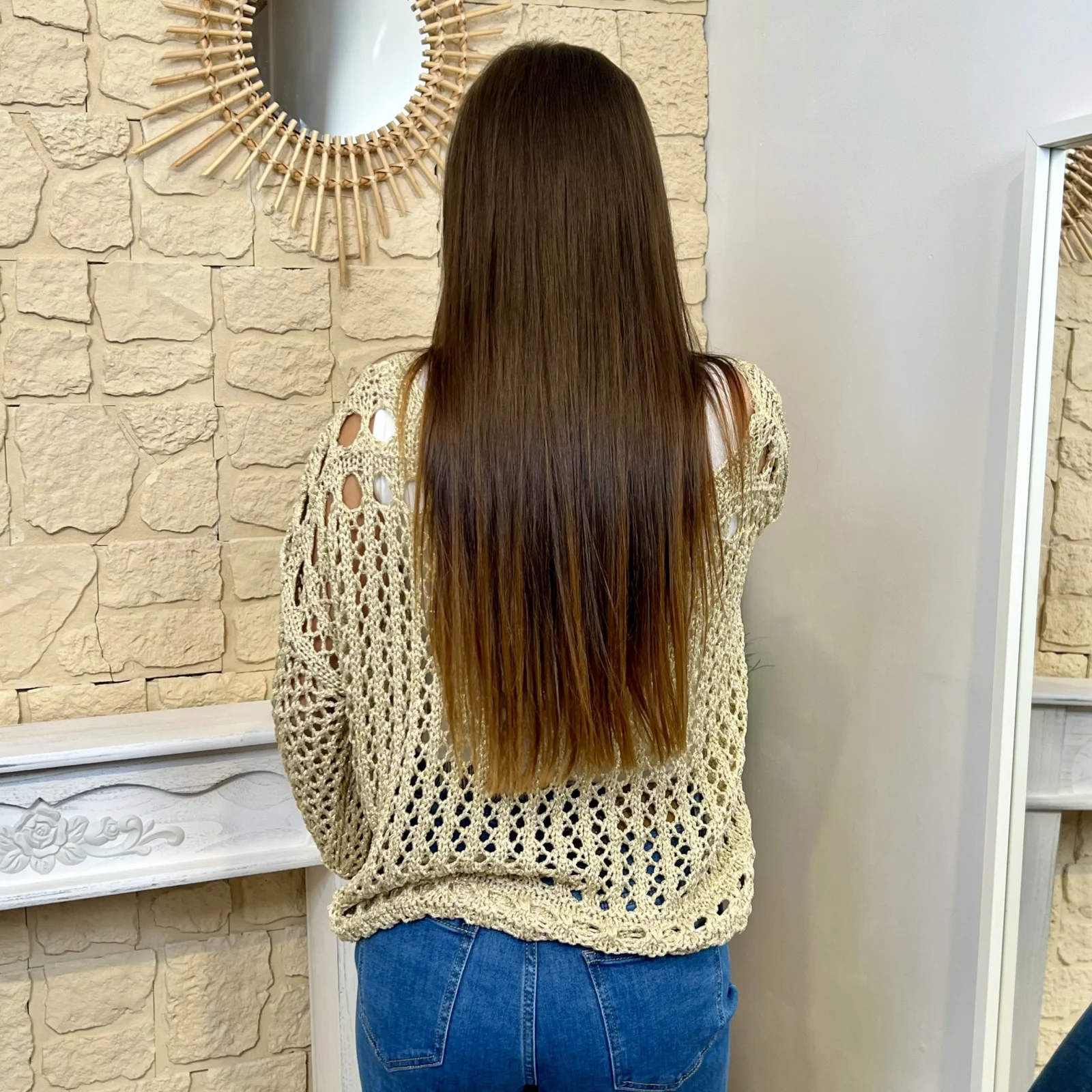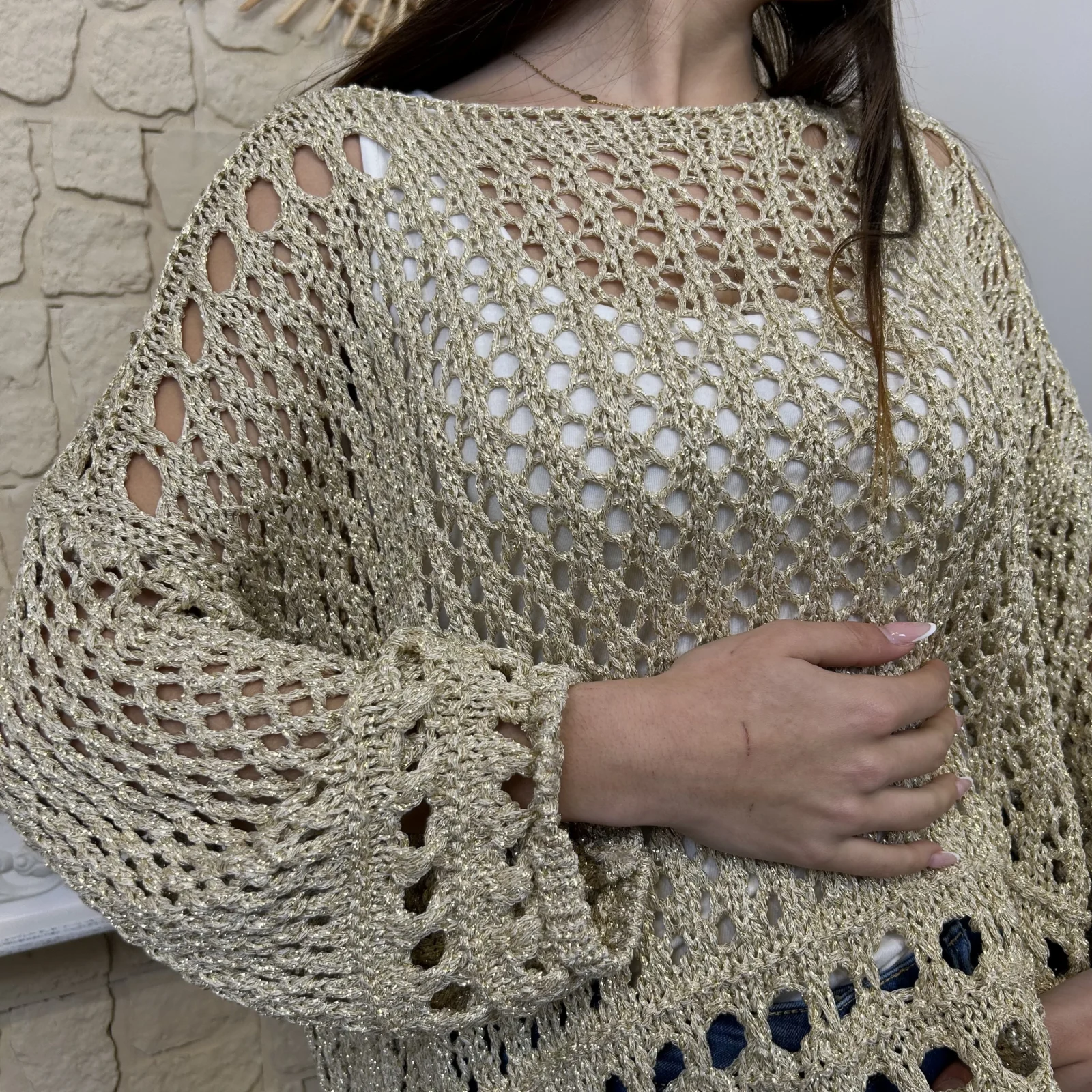 Adoptez un look tendance avec ce pull ajouré doré ! La maille large se porte par dessus un top et peut s’associer avec un jean pour un look casual.