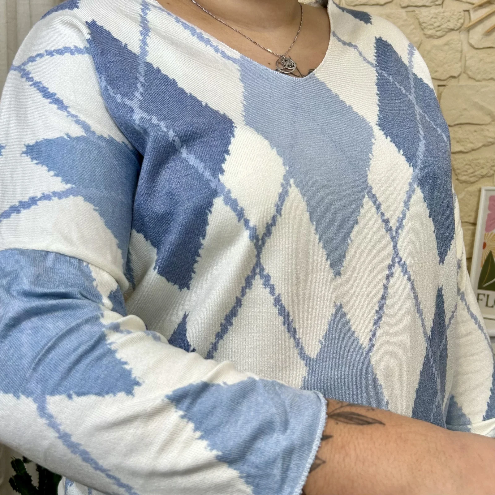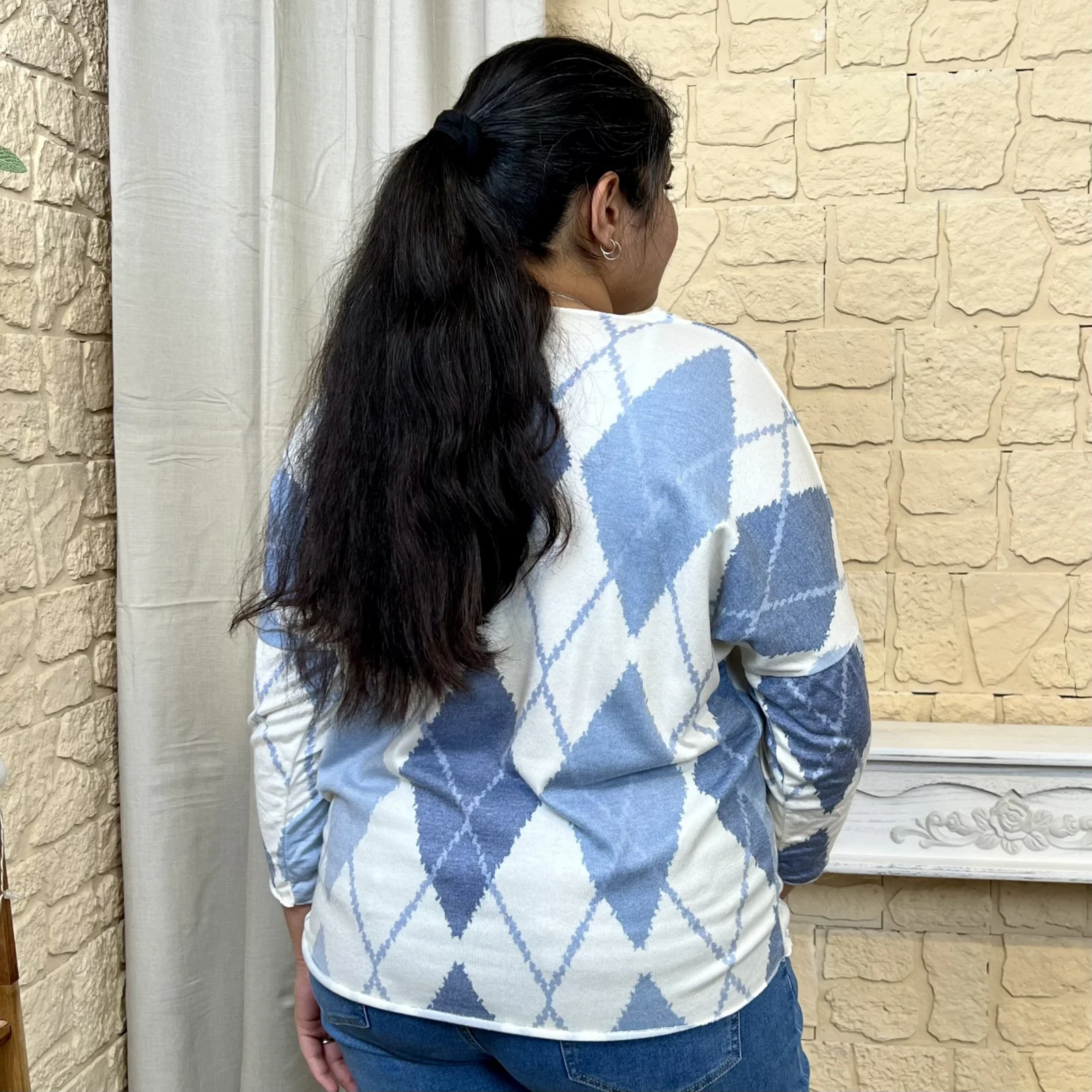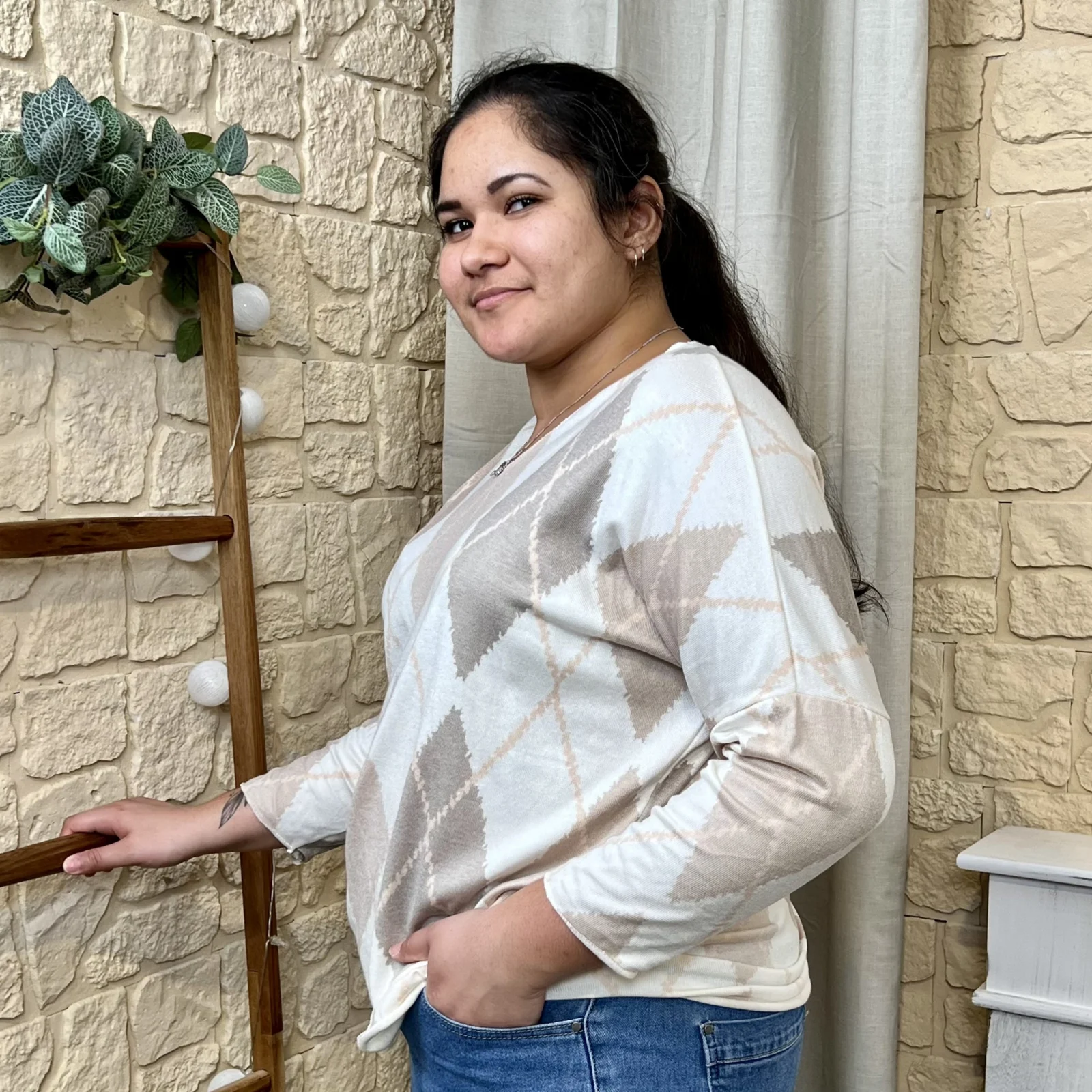 Ce pull aux motifs losanges est idéal pour apporter une touche colorée à tous vos looks ! A associer avec un jean et une paire de baskets.