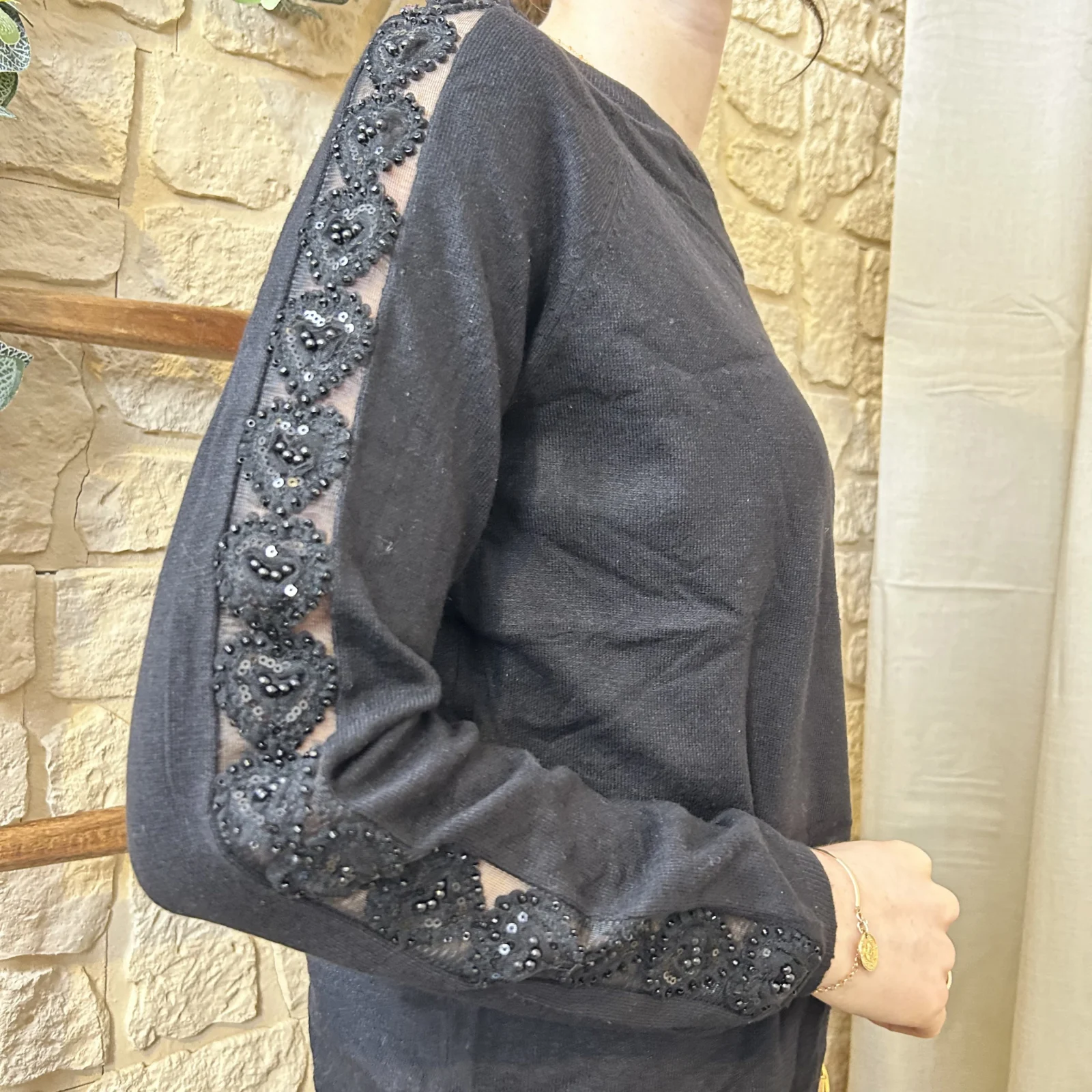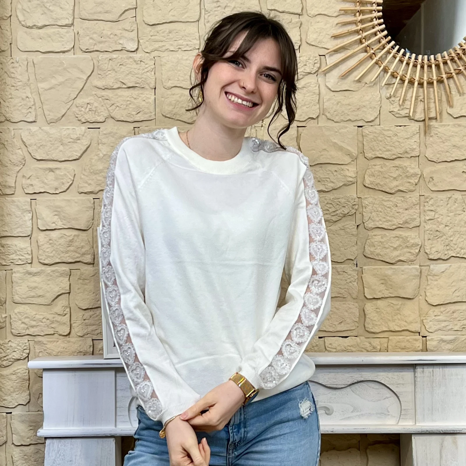 Bande en tulle et strass ajourée le long des manches