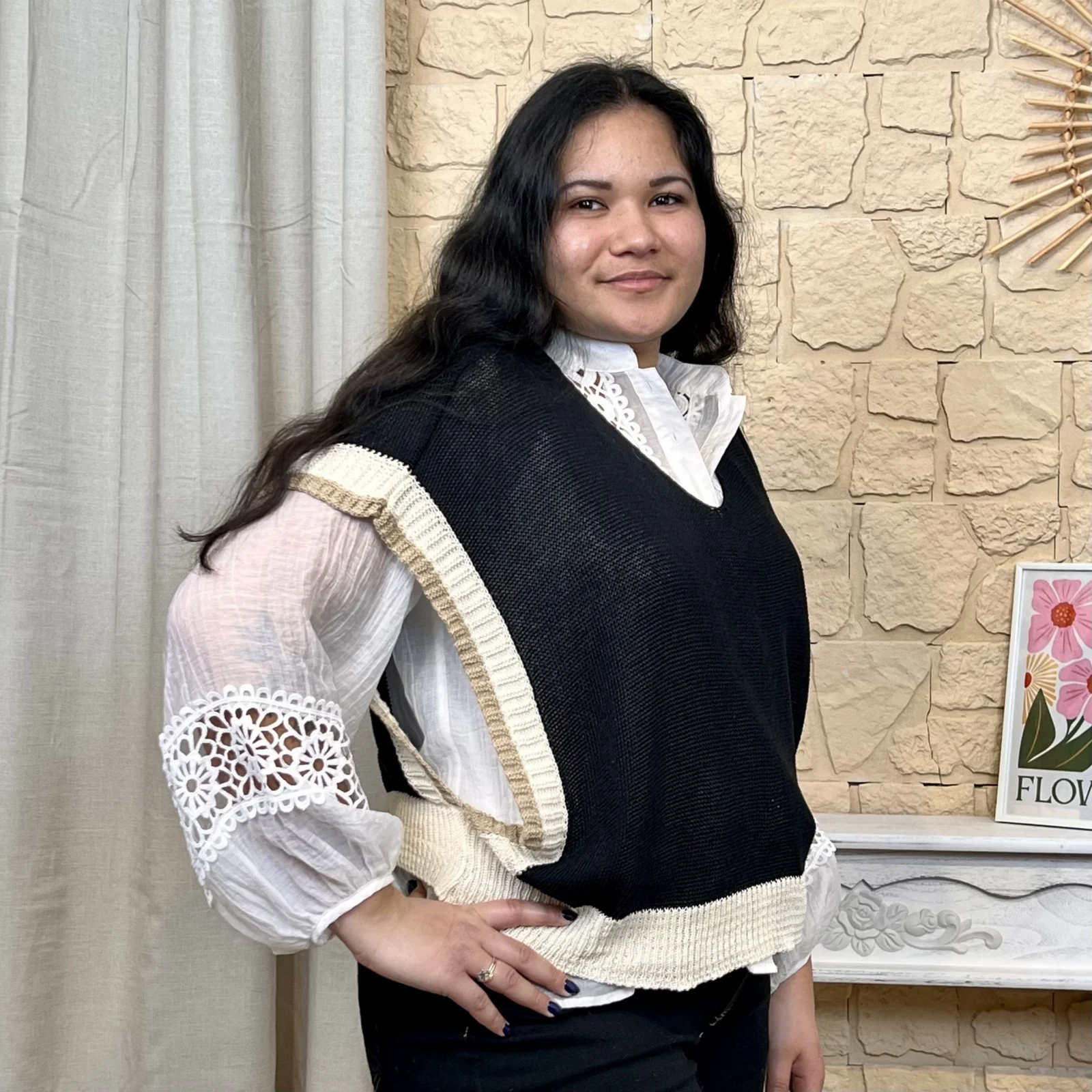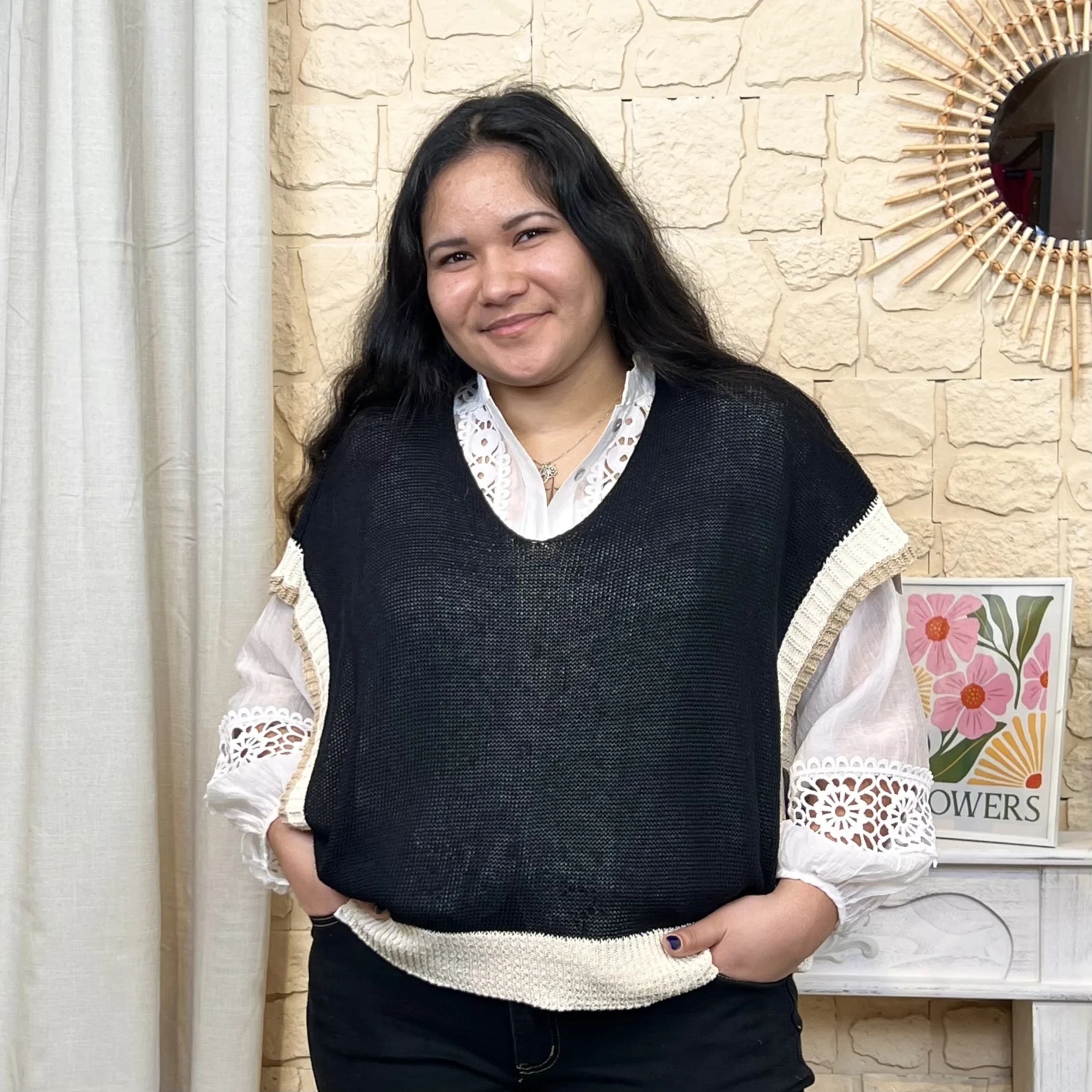Proposé en taille unique, ce poncho conviendra du 36 au 42 en fonction des morphologies.