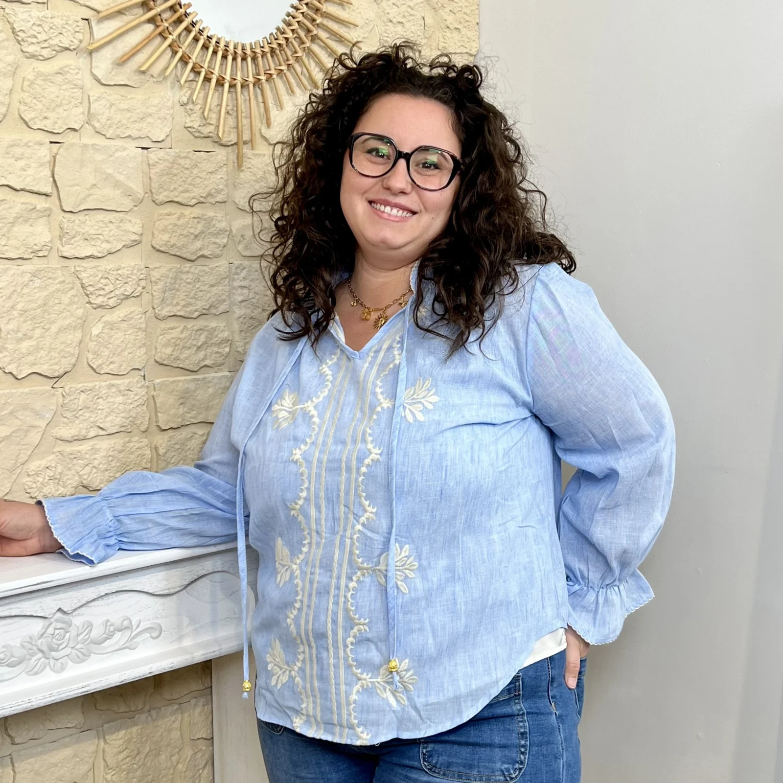 J730 – Blouse brodée col volanté (T44-T52)