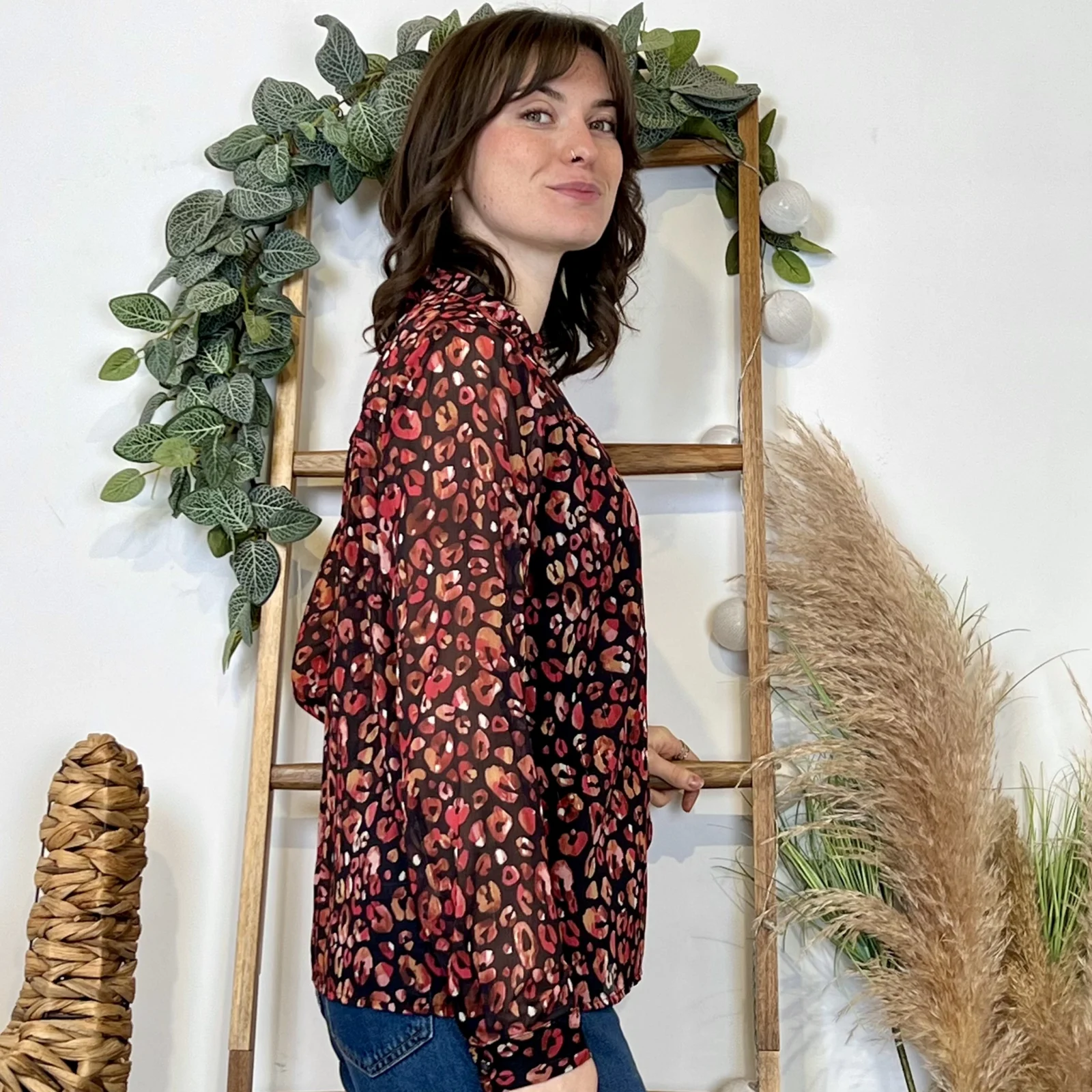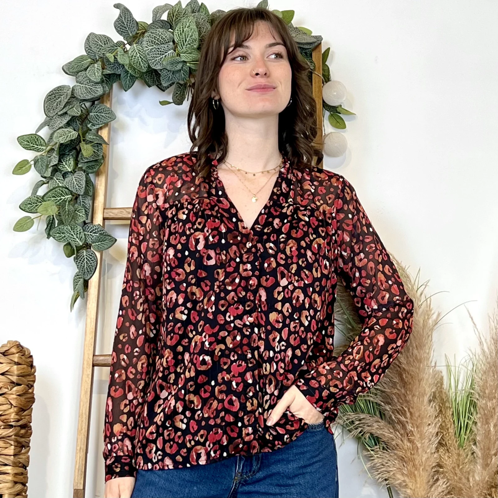 Blouse à l’imprimé automnal, proposée du 36/38 au 38/40, nous vous conseillons de choisir cette blouse dans votre taille habituelle.