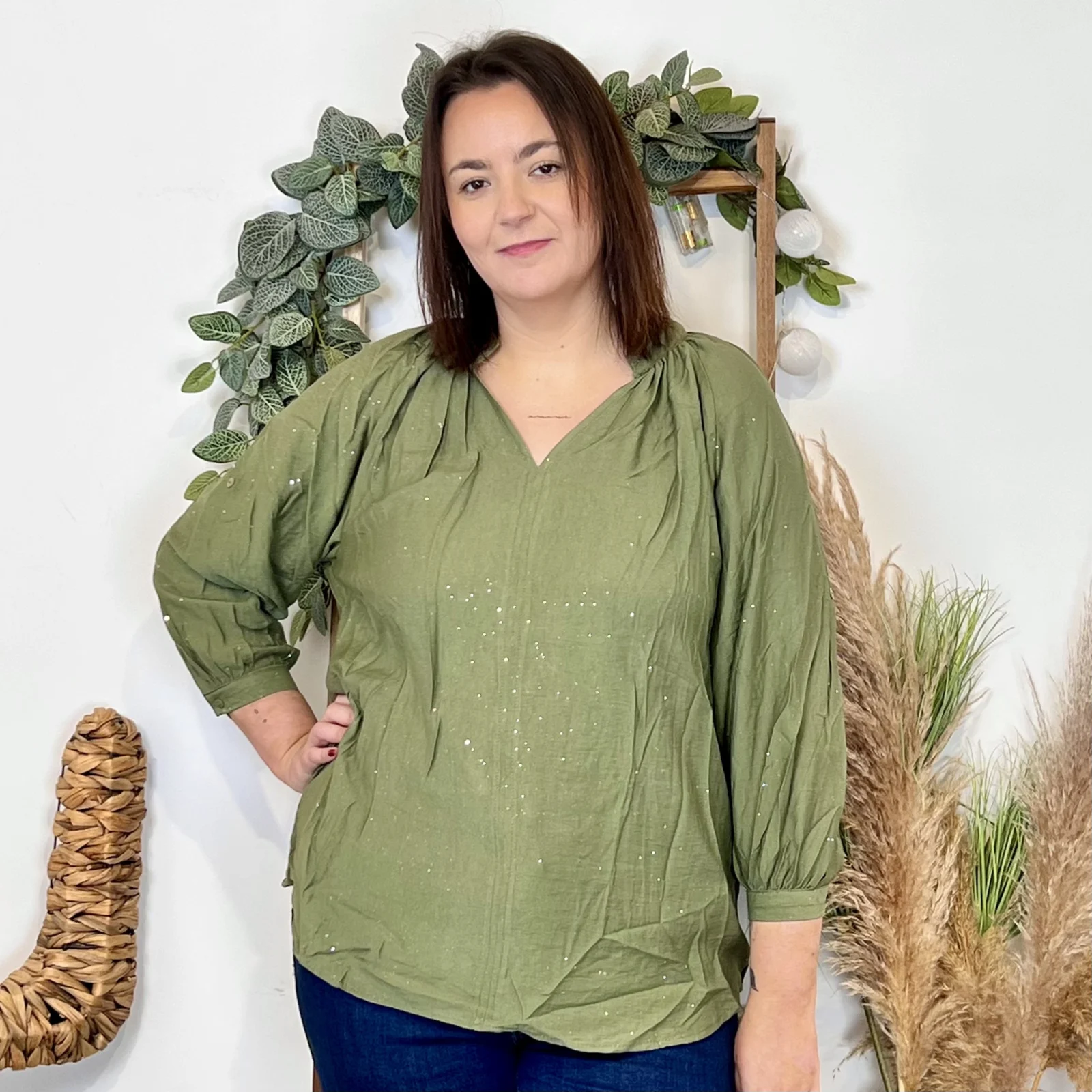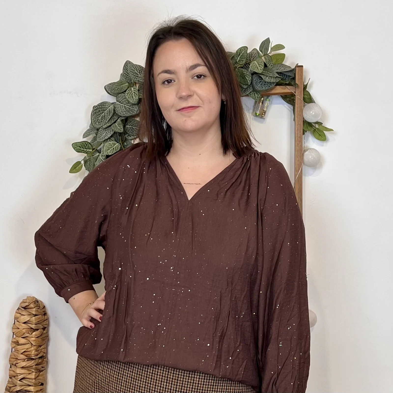 J958 – Blouse pailletée col V (T44-T52)