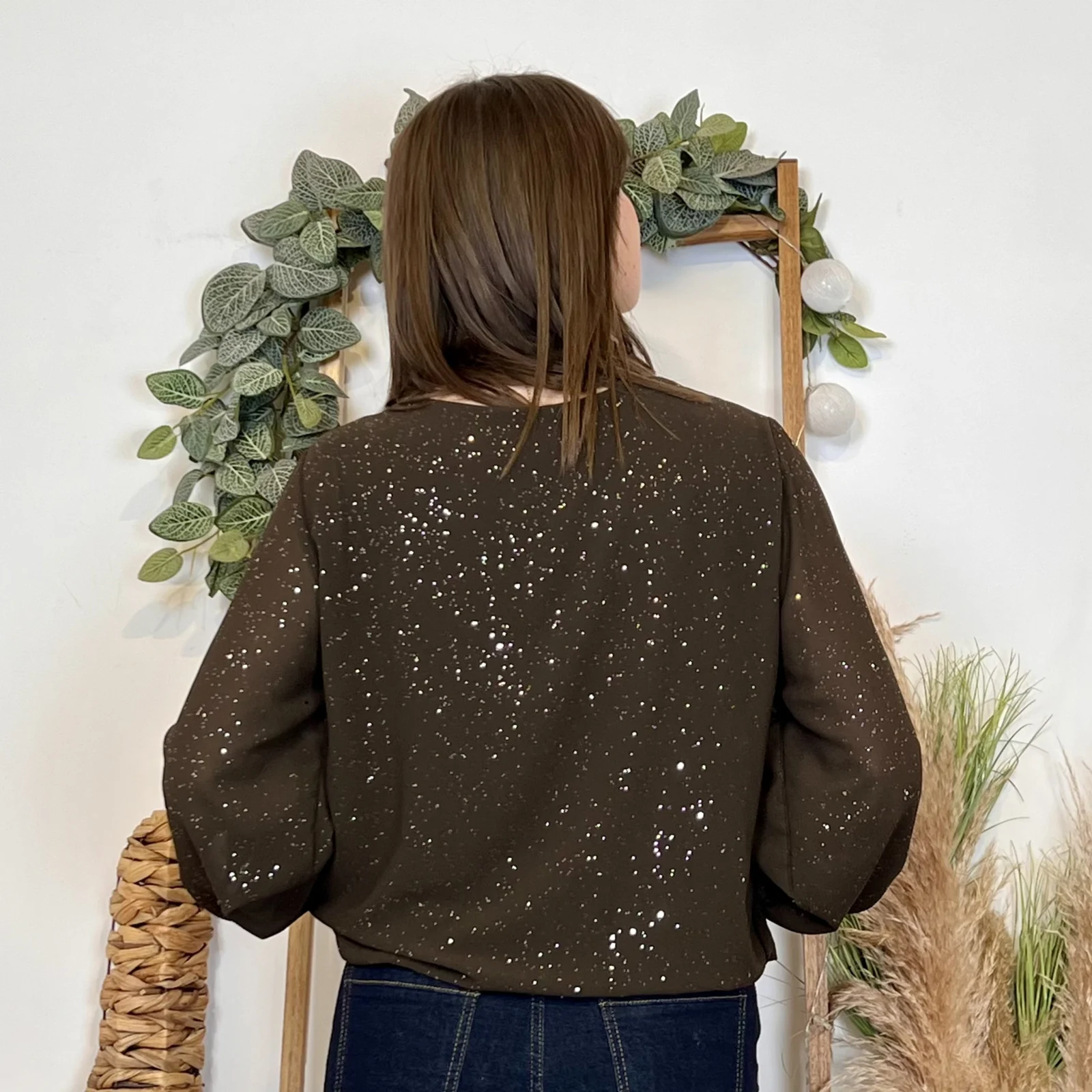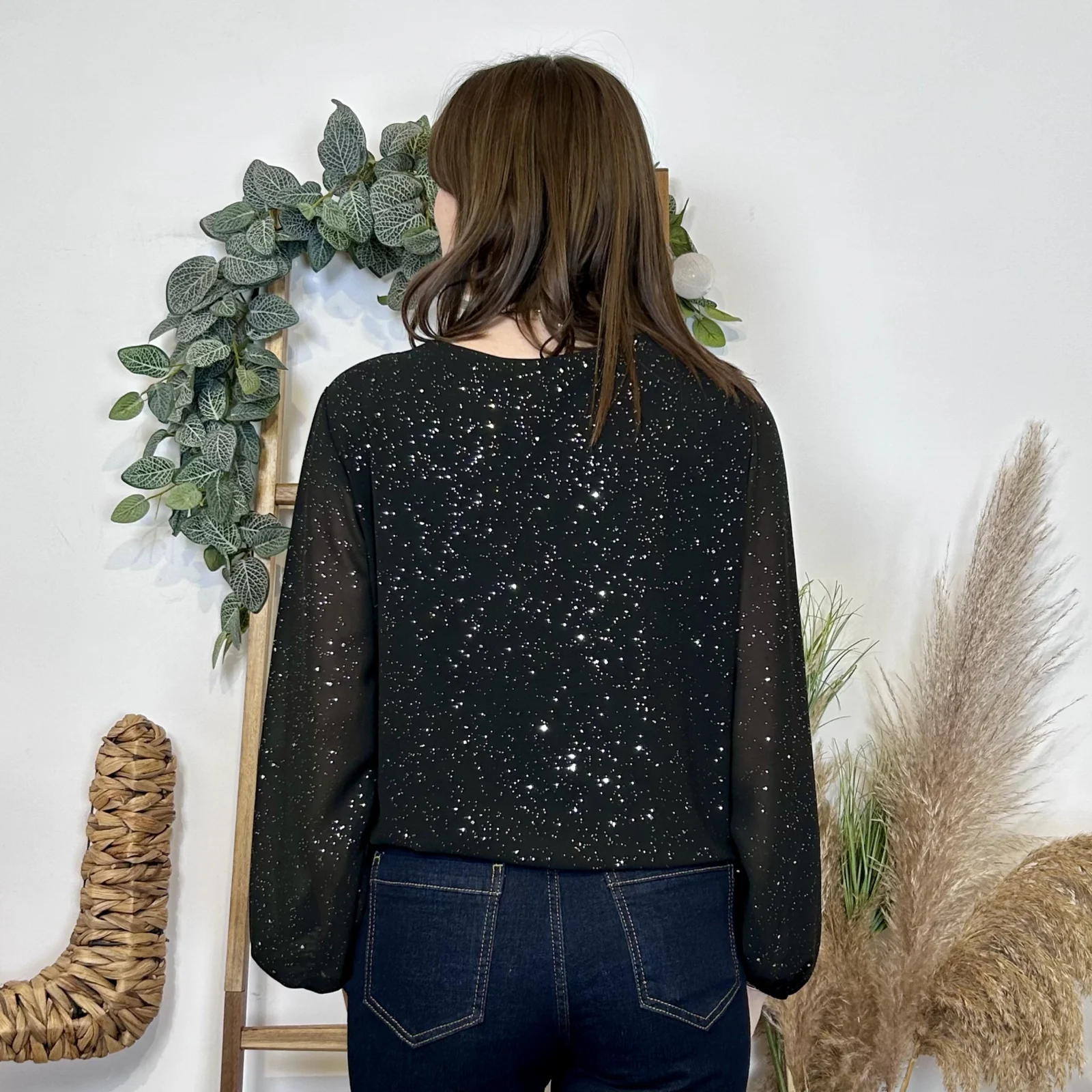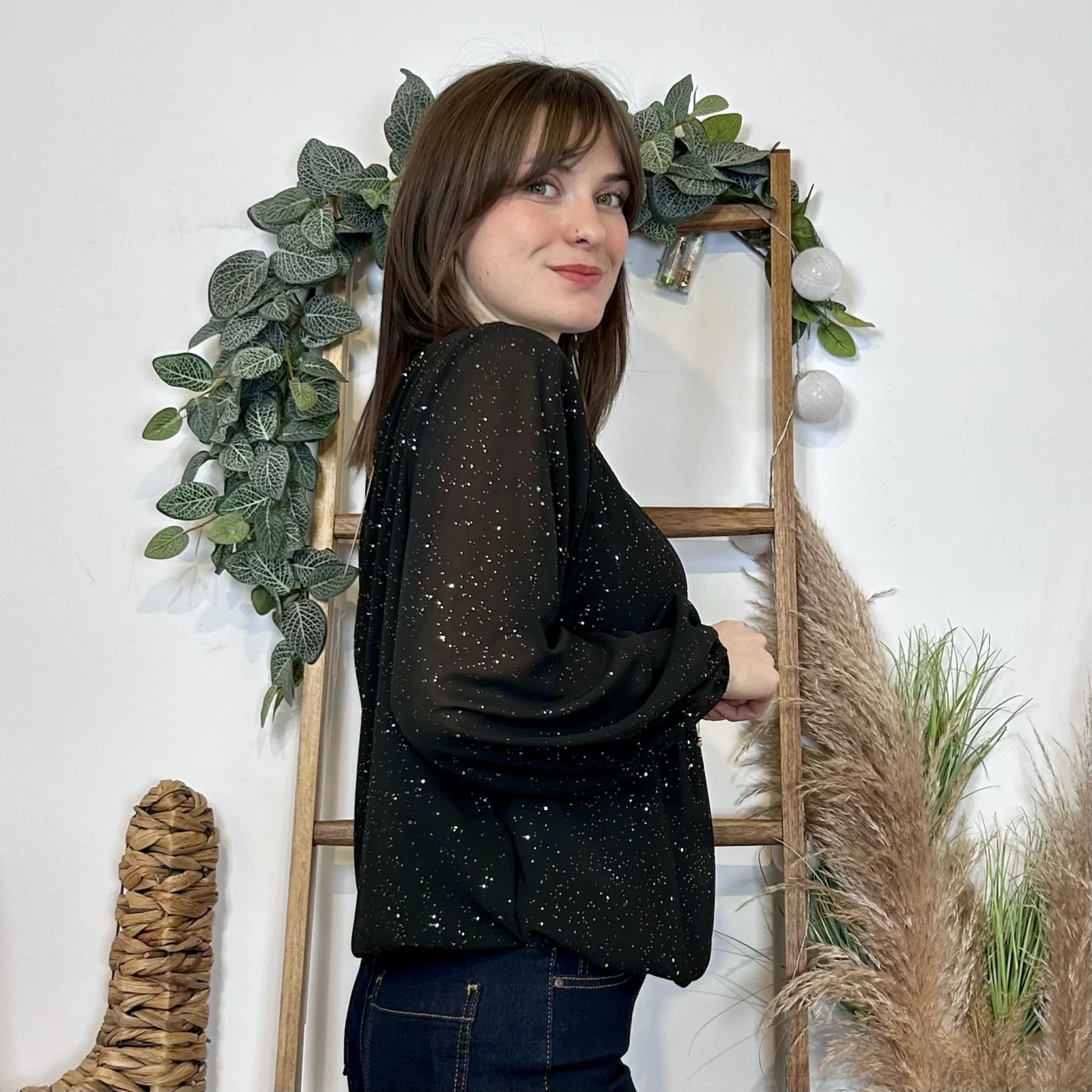 La blouse est proposée en taille unique, pensée pour s’adapter facilement à plusieurs morphologies grâce à sa coupe fluide et ample. Elle peut convenir de la taille 36 au 42.