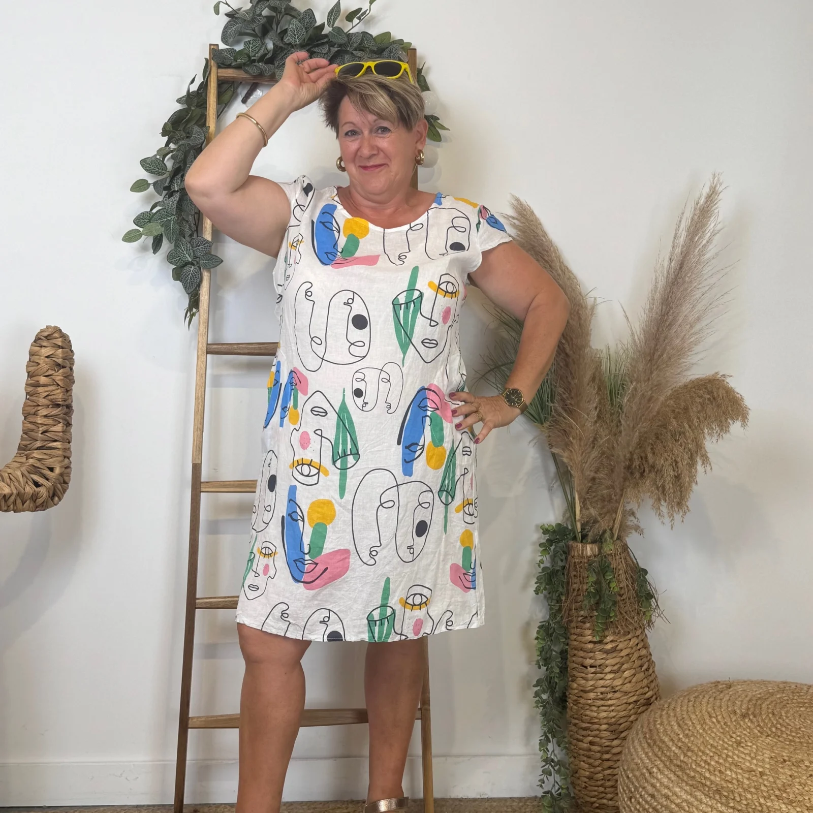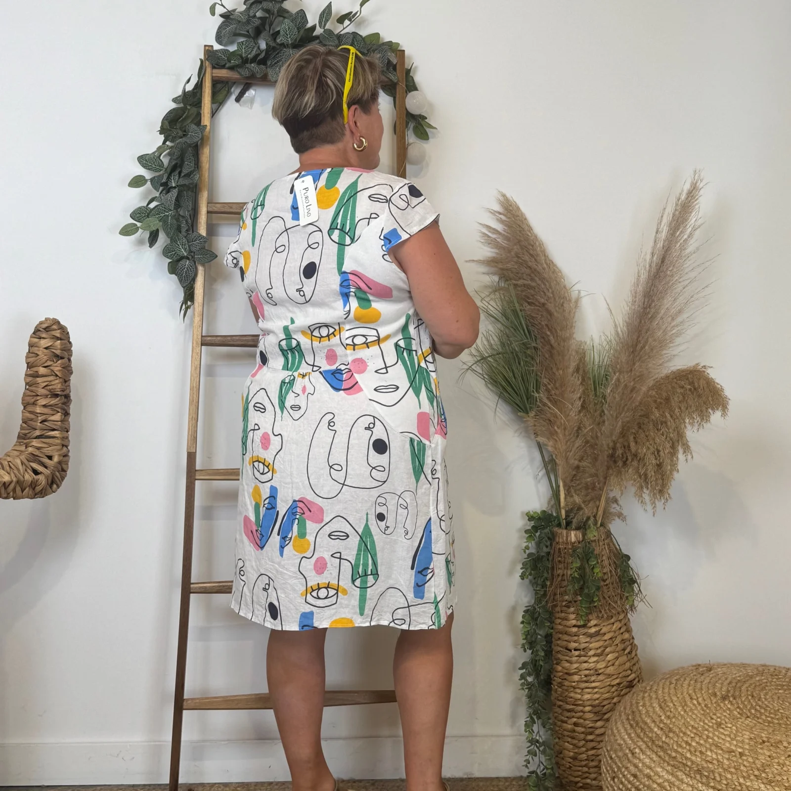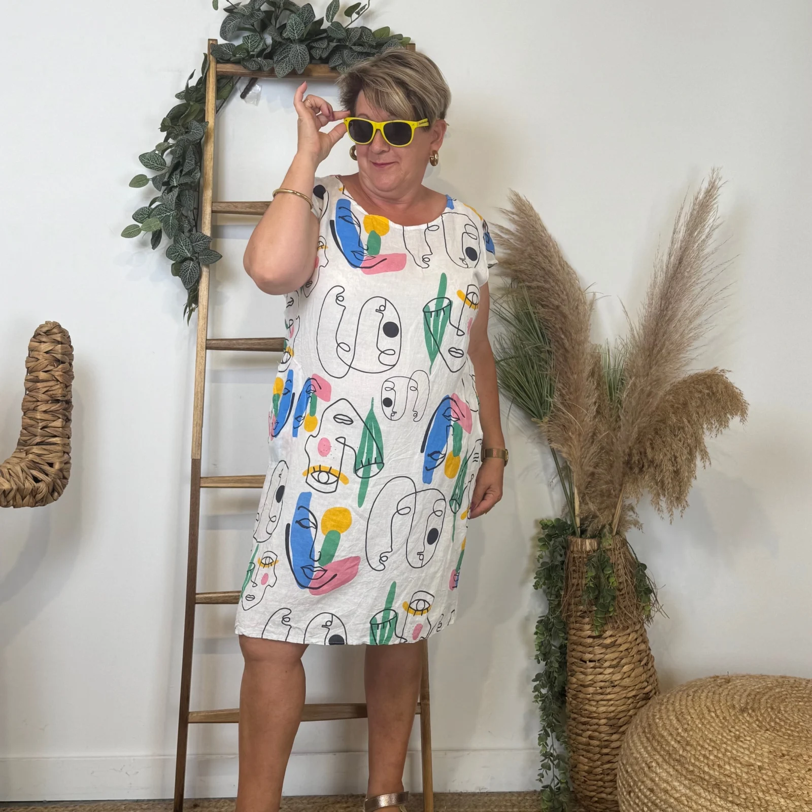 Robe courte droite de matière naturelle col rond imprimé manches courtes. A porter avec des sacs , des vestes ou des gilets.