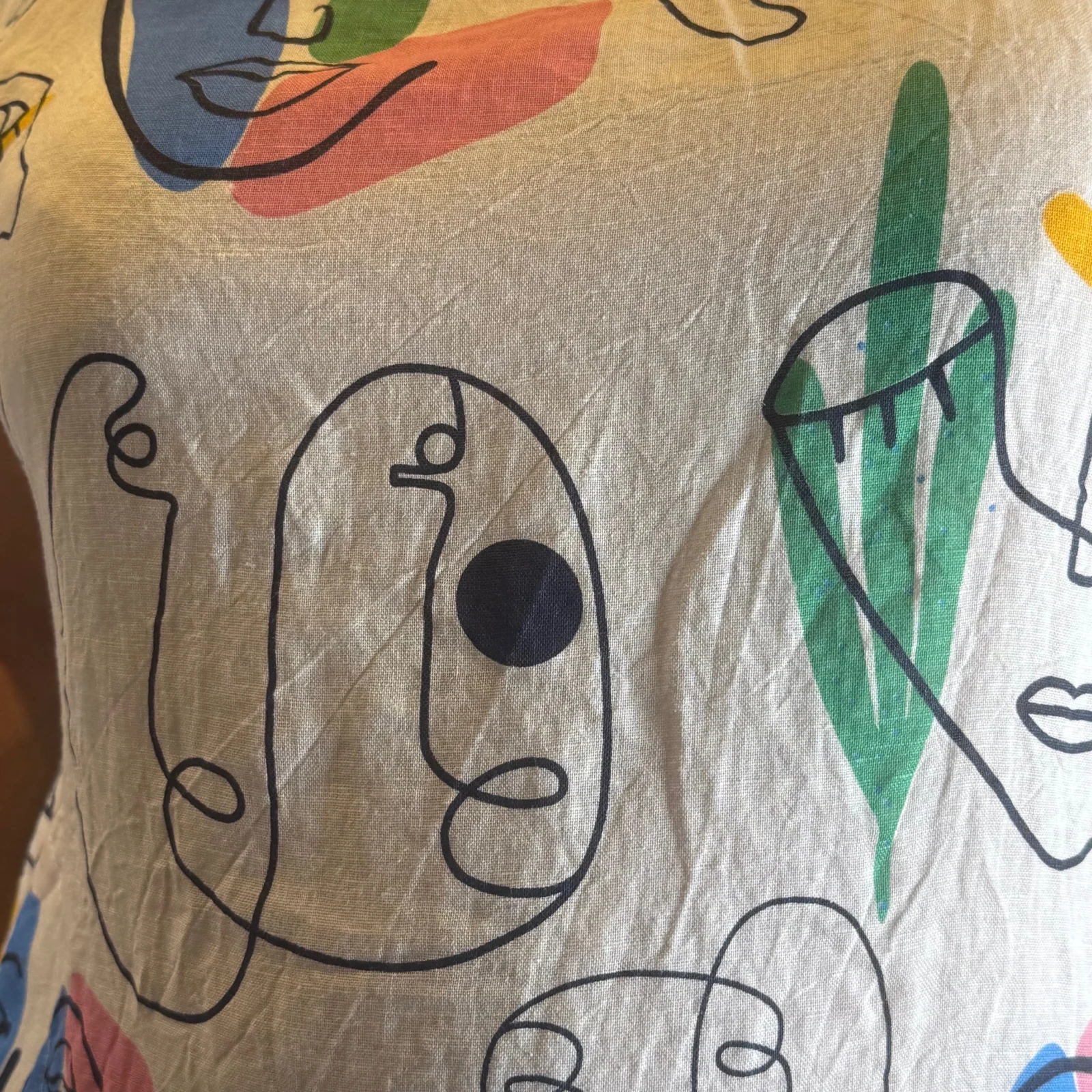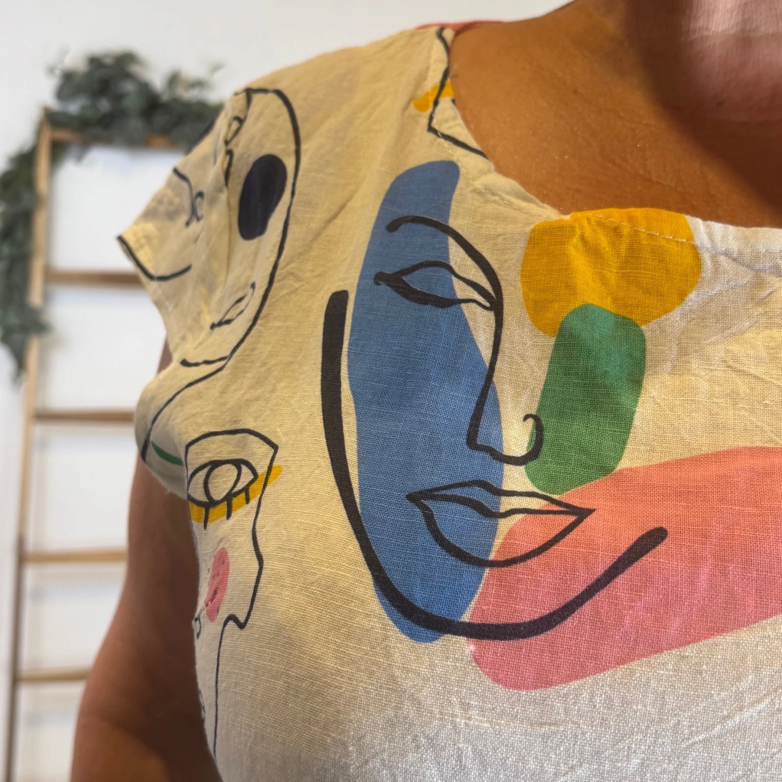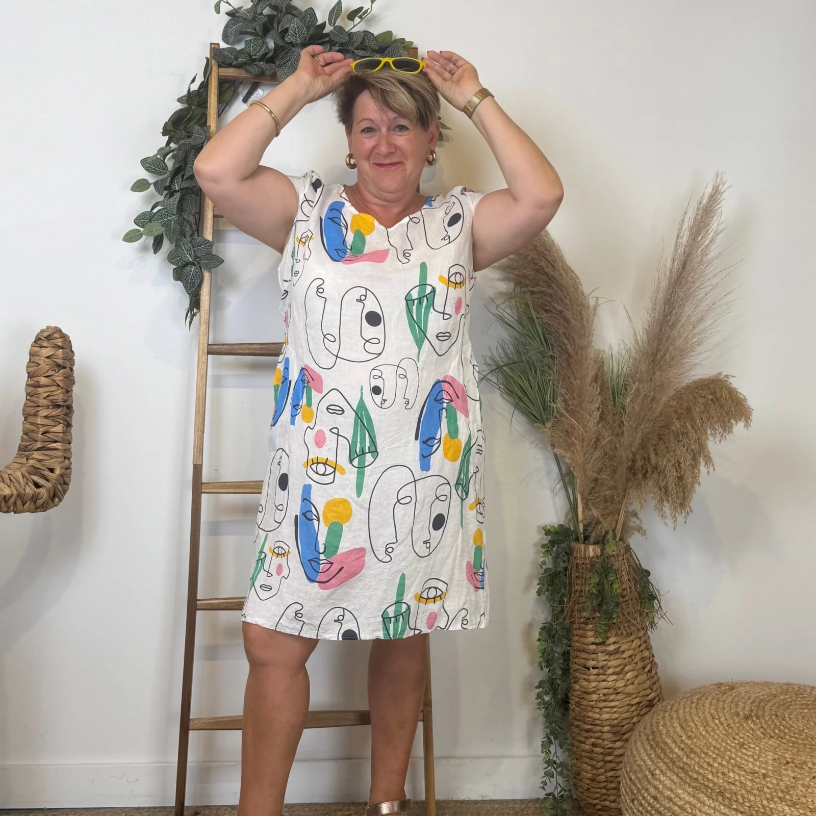 Robe courte droite de matière naturelle col rond imprimé manches courtes. A porter avec des sacs , des vestes ou des gilets.