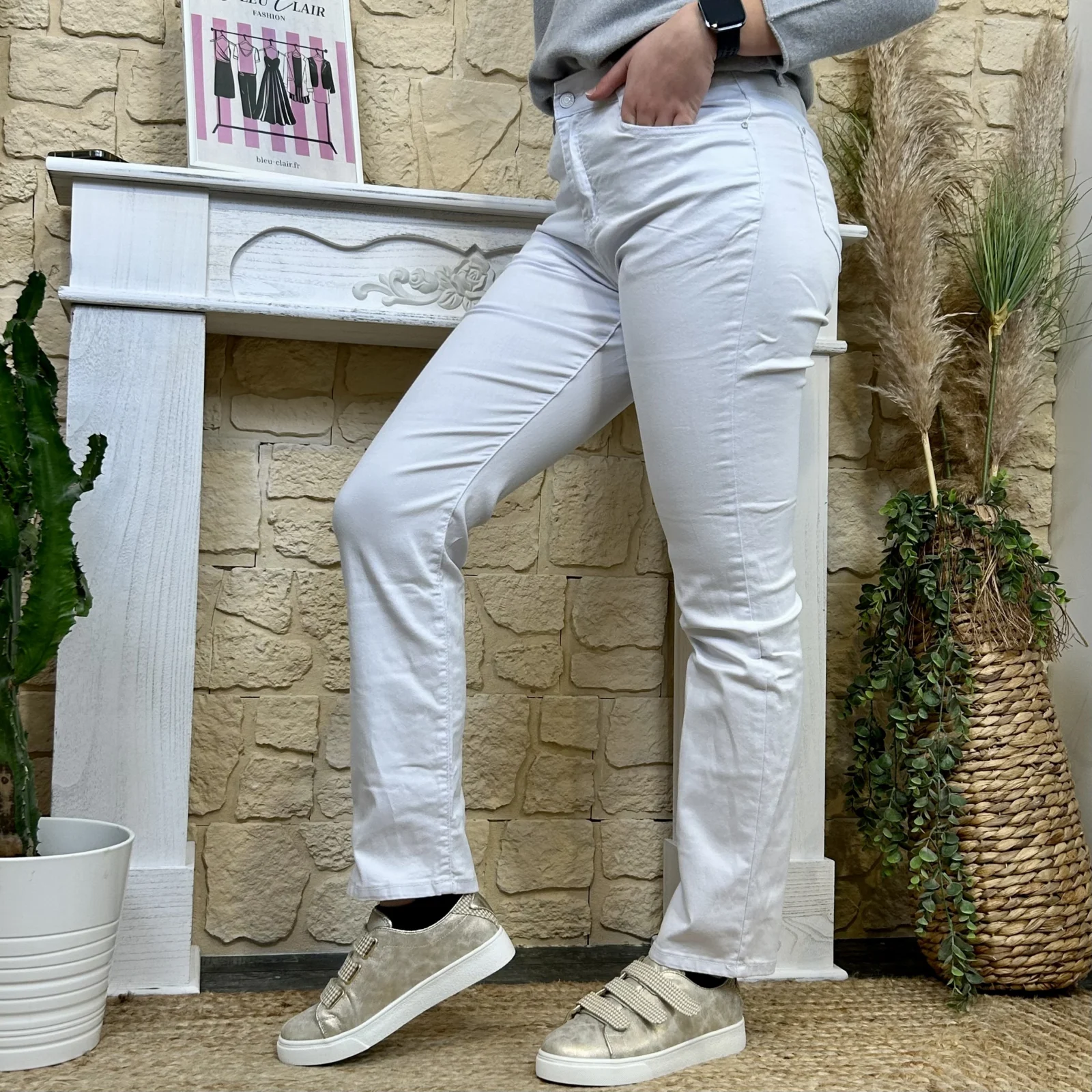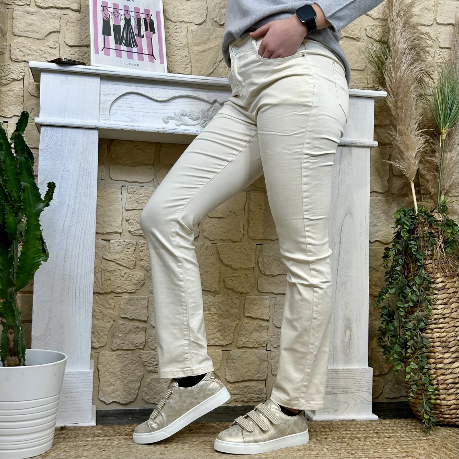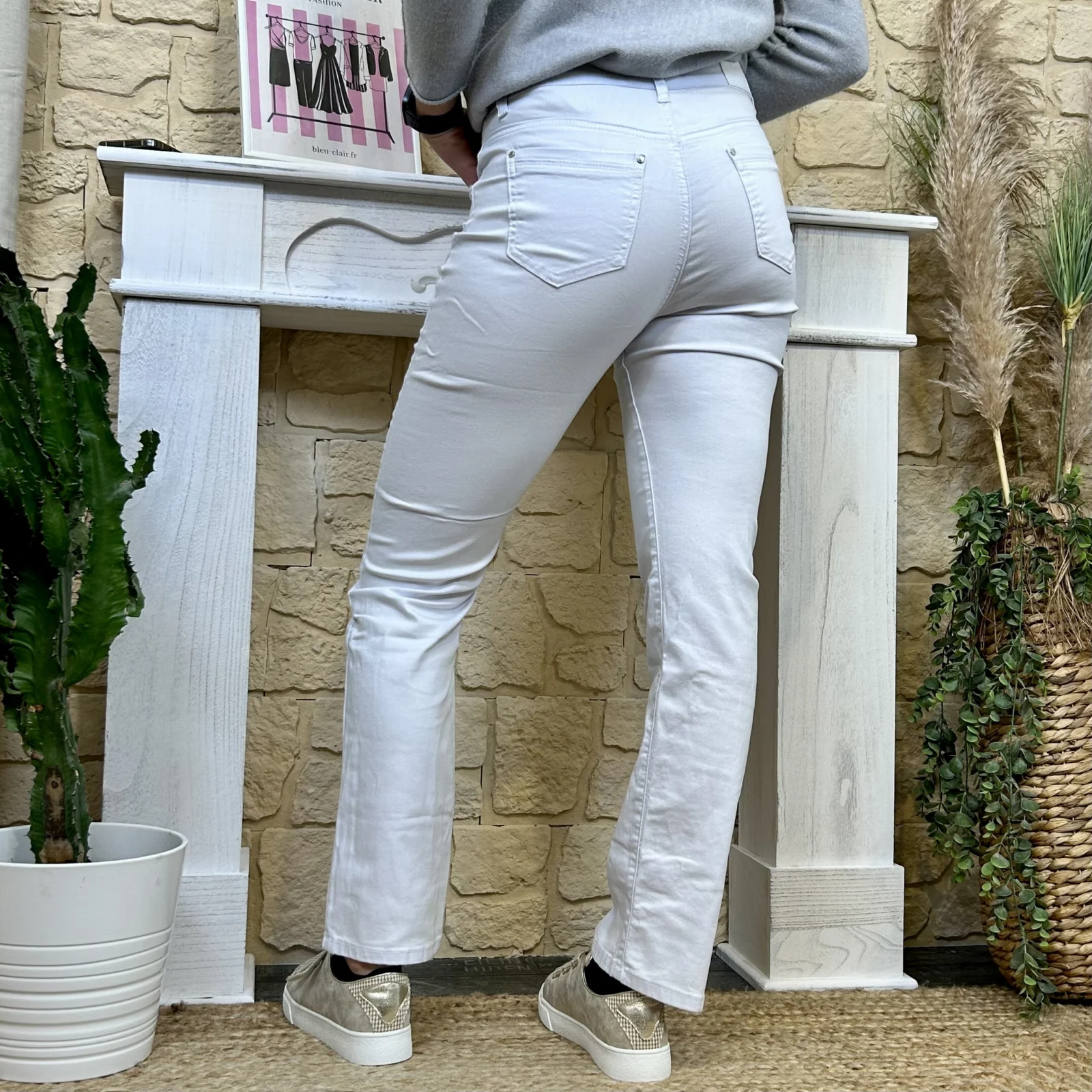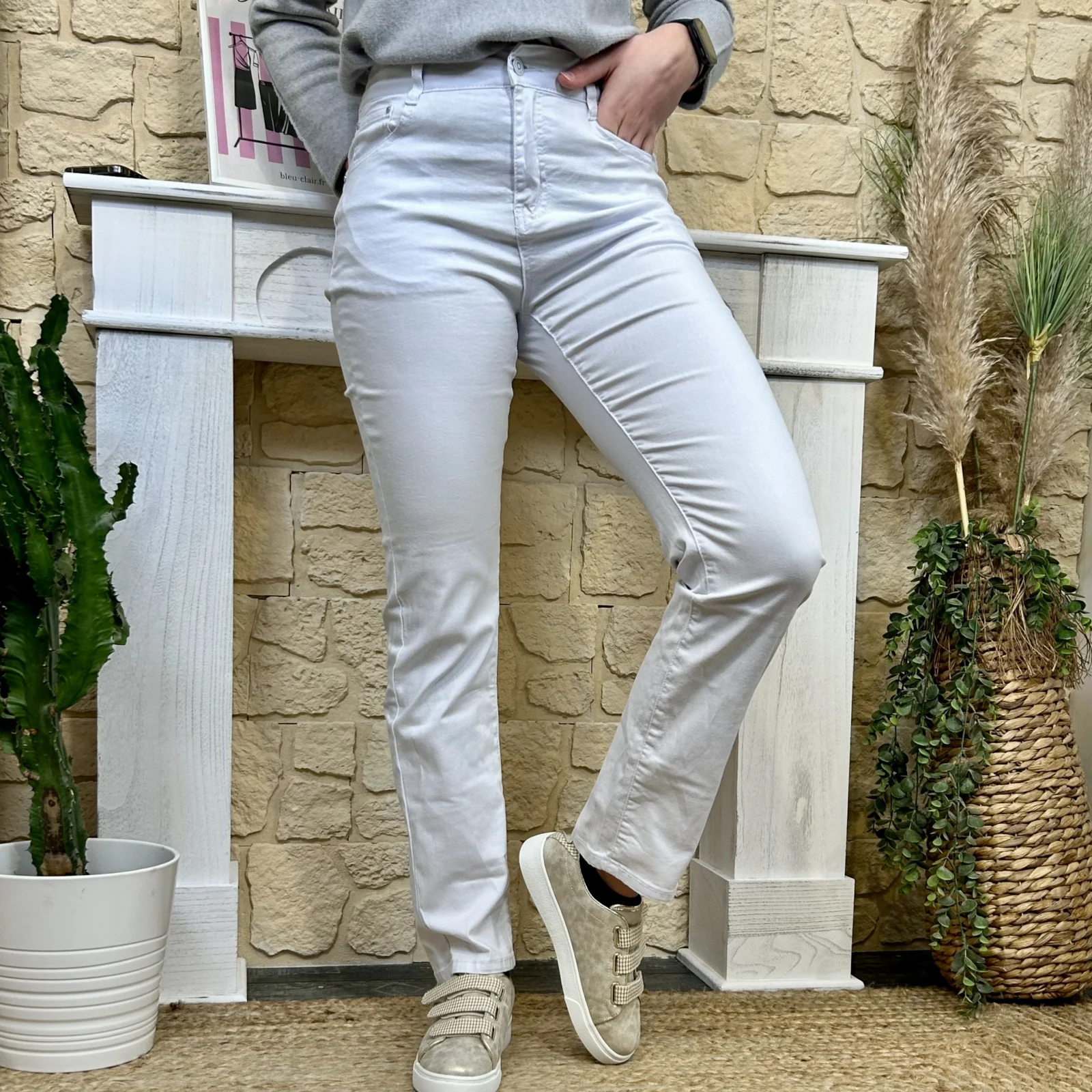 Sa coupe droite équilibre la jambe sans la mouler, flatte la morphologie et allonge visuellement la silhouette.