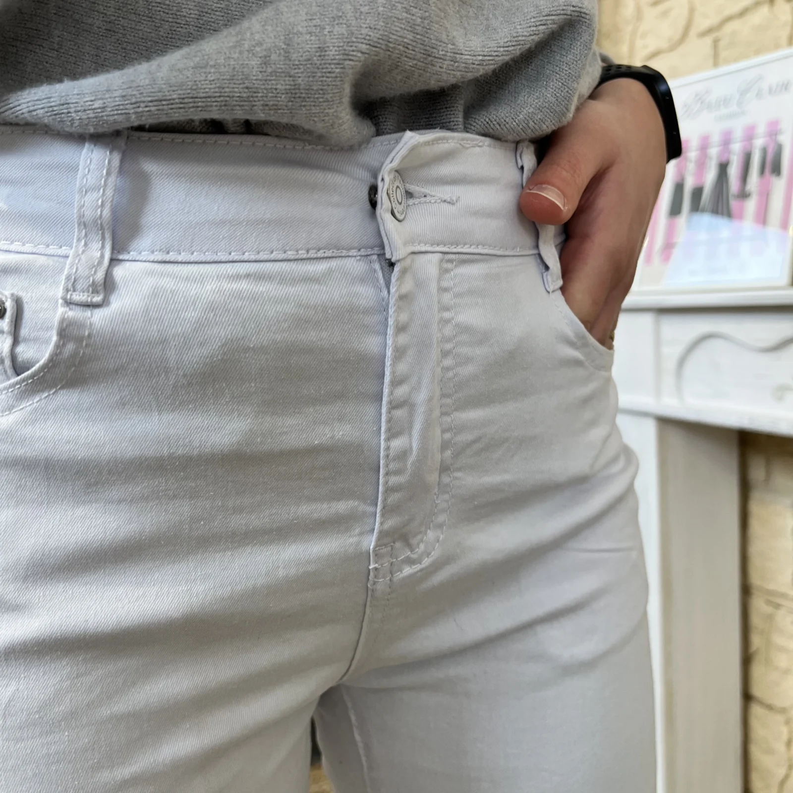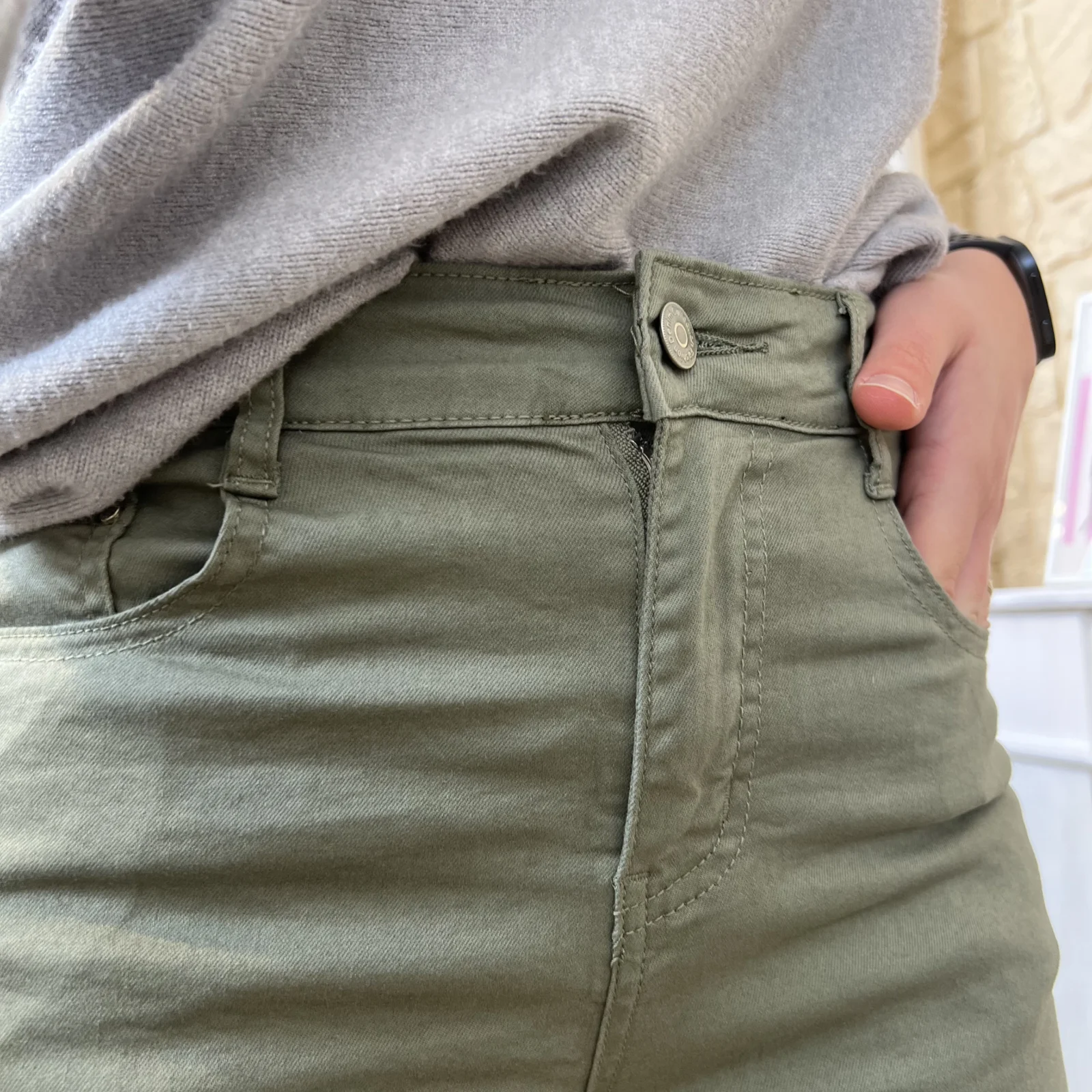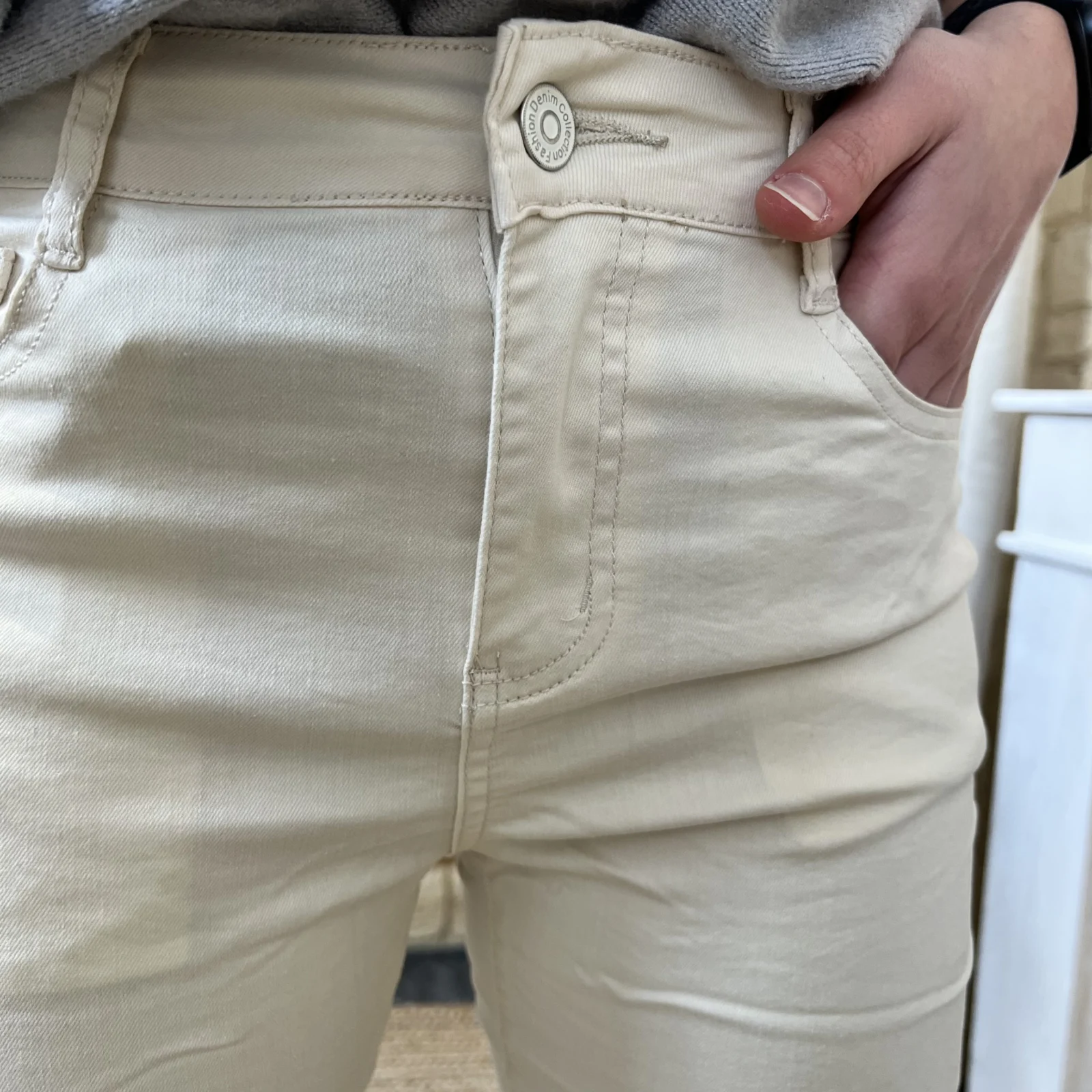 Doté de 5 poches, dont deux poches fendues à l’avant et deux poches plaquées à l’arrière, il présente une taille semi-haute fermée par bouton et zip.