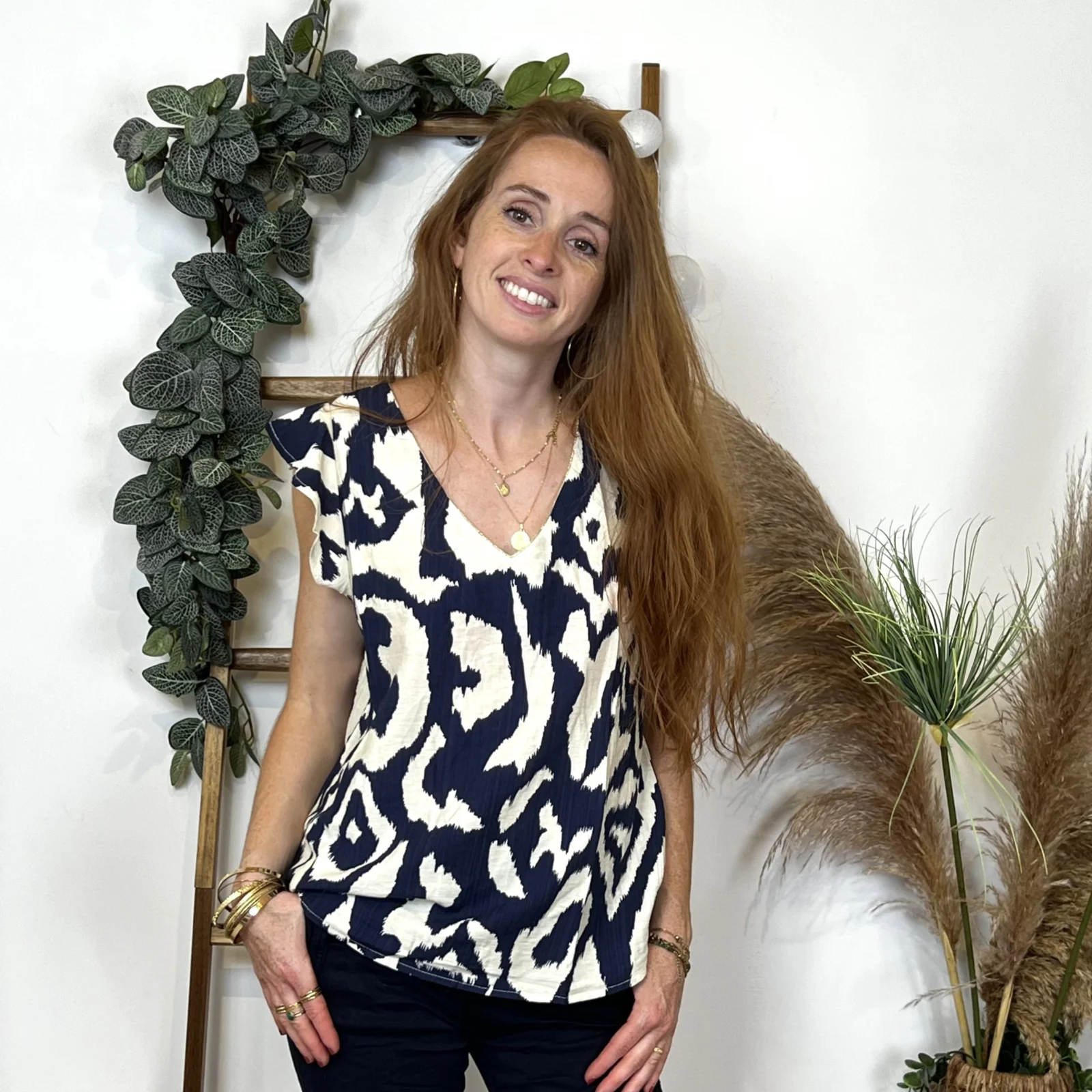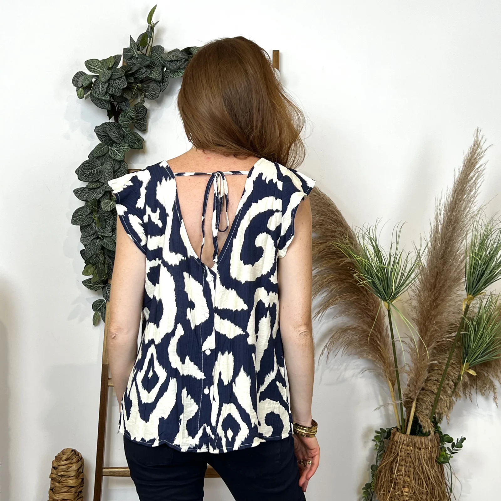 Encolure en V. Dos en V, boutonnage et petit lien au niveau du cou.