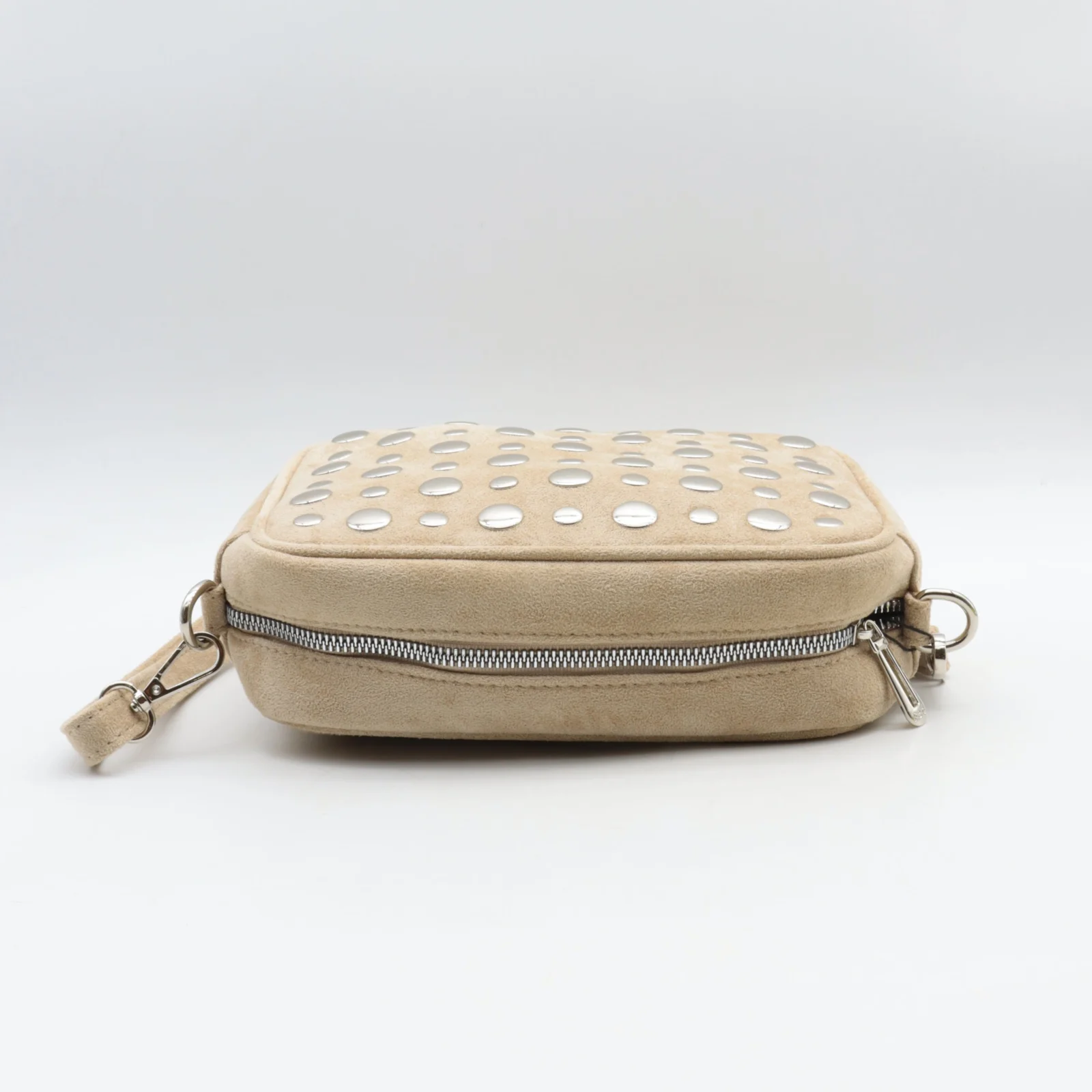 Le sac dispose d’un compartiment principal sécurisé par une fermeture zippée, ainsi que d’une poche zippée au dos très pratique pour garder vos indispensables à portée de main. Son aspect daim doux au toucher associé aux pastilles métalliques brillantes crée un contraste élégant et tendance.