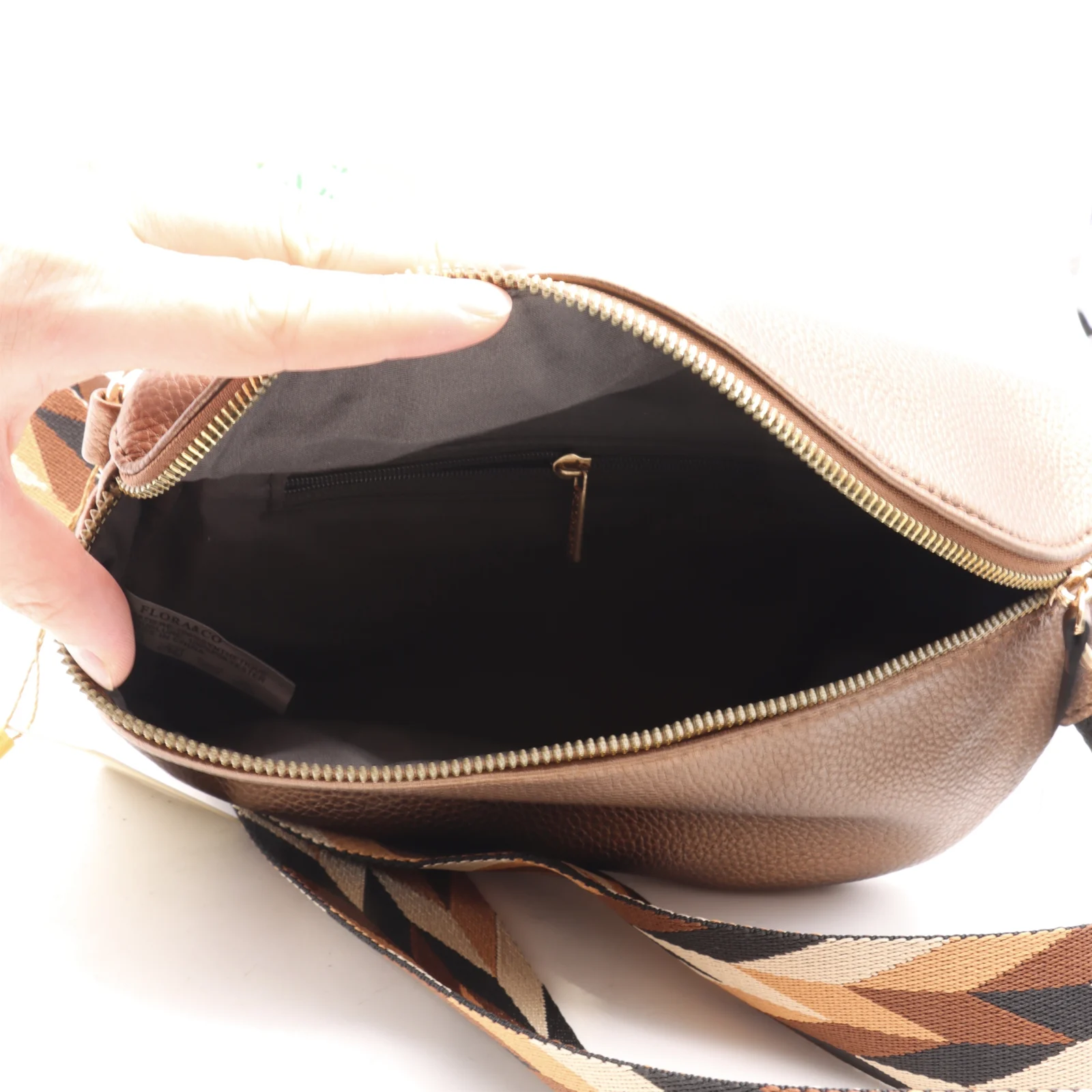 A l’intérieur un grand espace avec une pochette en tissus séparateur offrant 2 espaces et une poche zippée.