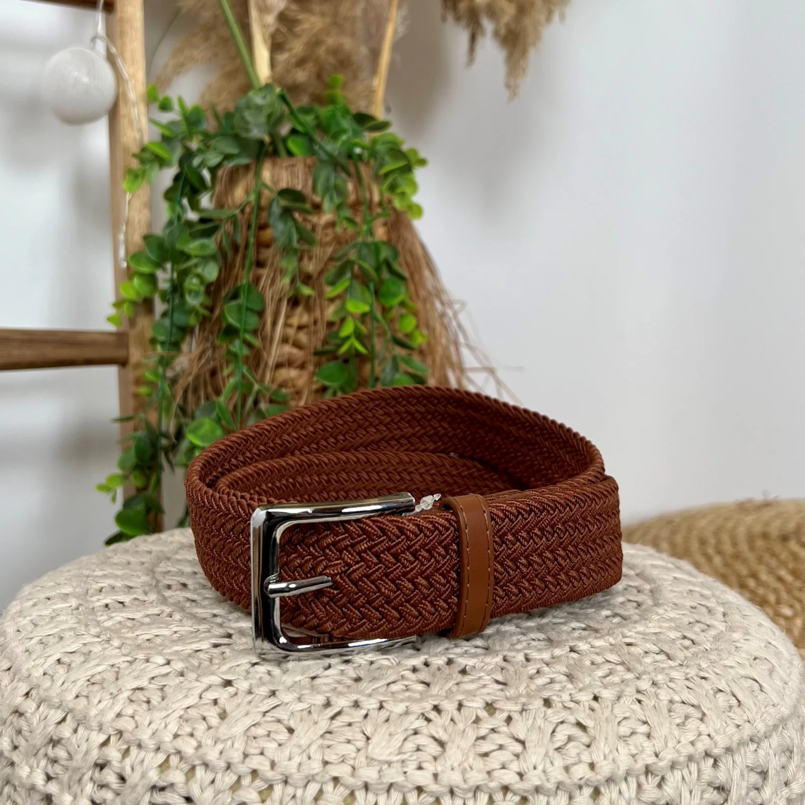 Ceinture élastique tressée avec l’embout en PU. 3.3 cm de large. 105-110 cm de longueur. Extensible jusqu’à 120-125 cm