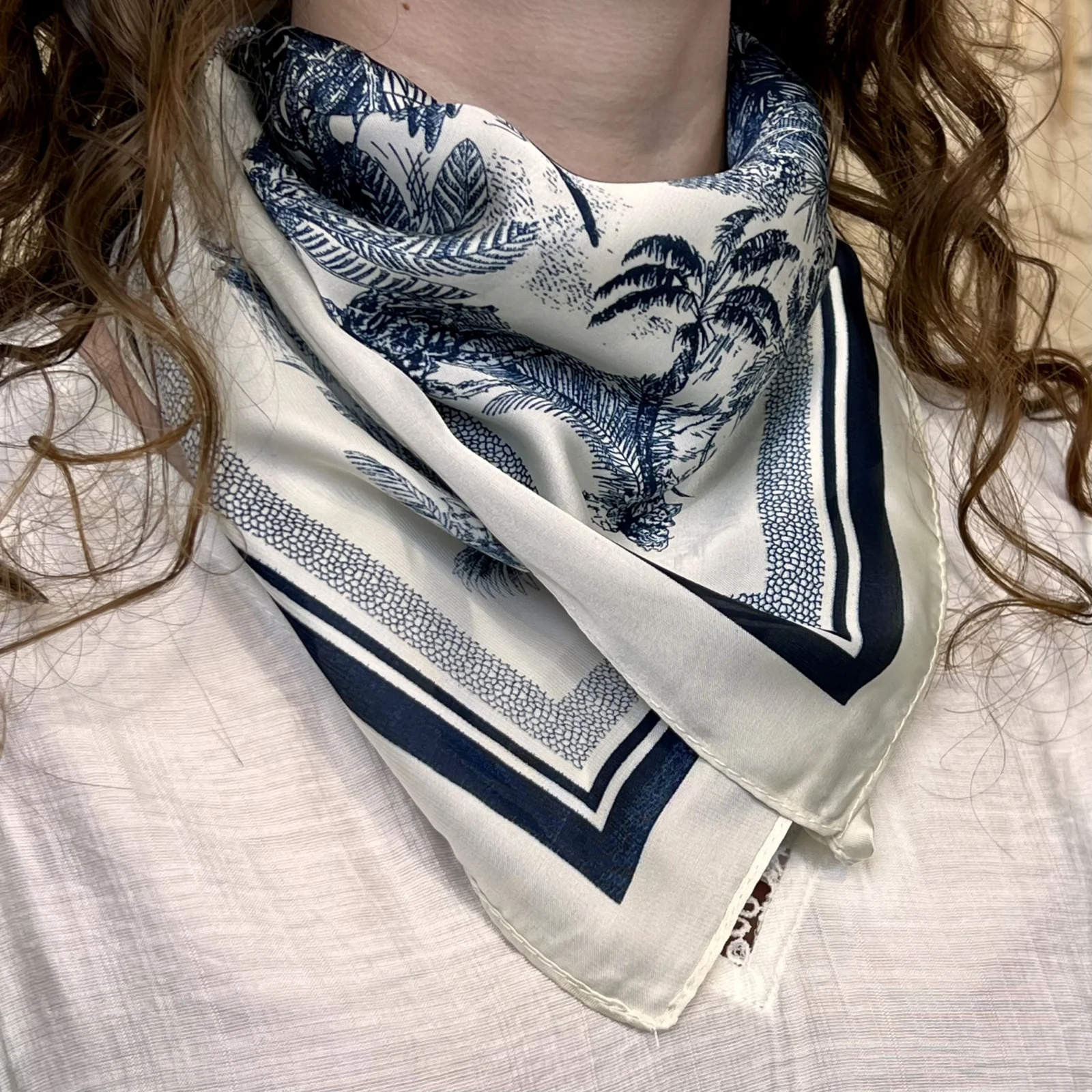 Ce foulard touché soie incarne une élégance intemporelle inspirée des décors classiques.