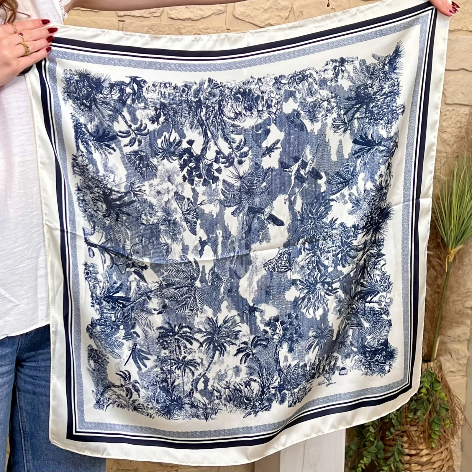 Chic et facile à assortir, ce foulard se porte aussi bien autour du cou que sur les épaules, dans les cheveux ou noué à un sac, apportant une touche raffinée et lumineuse à toutes vos tenues.
