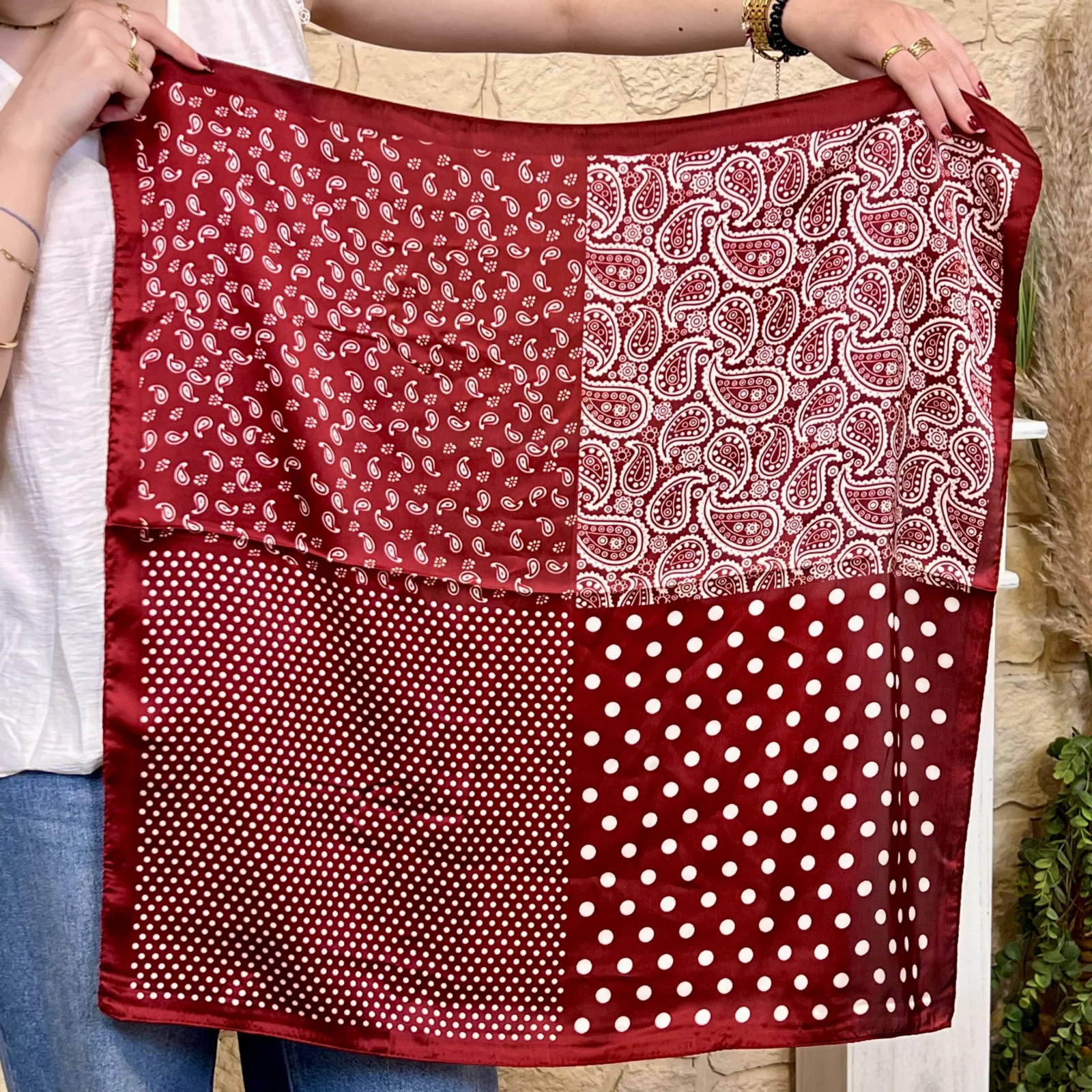 Ce foulard touché soie séduit par son élégance intemporelle et son design graphique. Chaque quadrant présente un motif distinct, apportant originalité et modernité à l’ensemble tout en restant facile à associer.