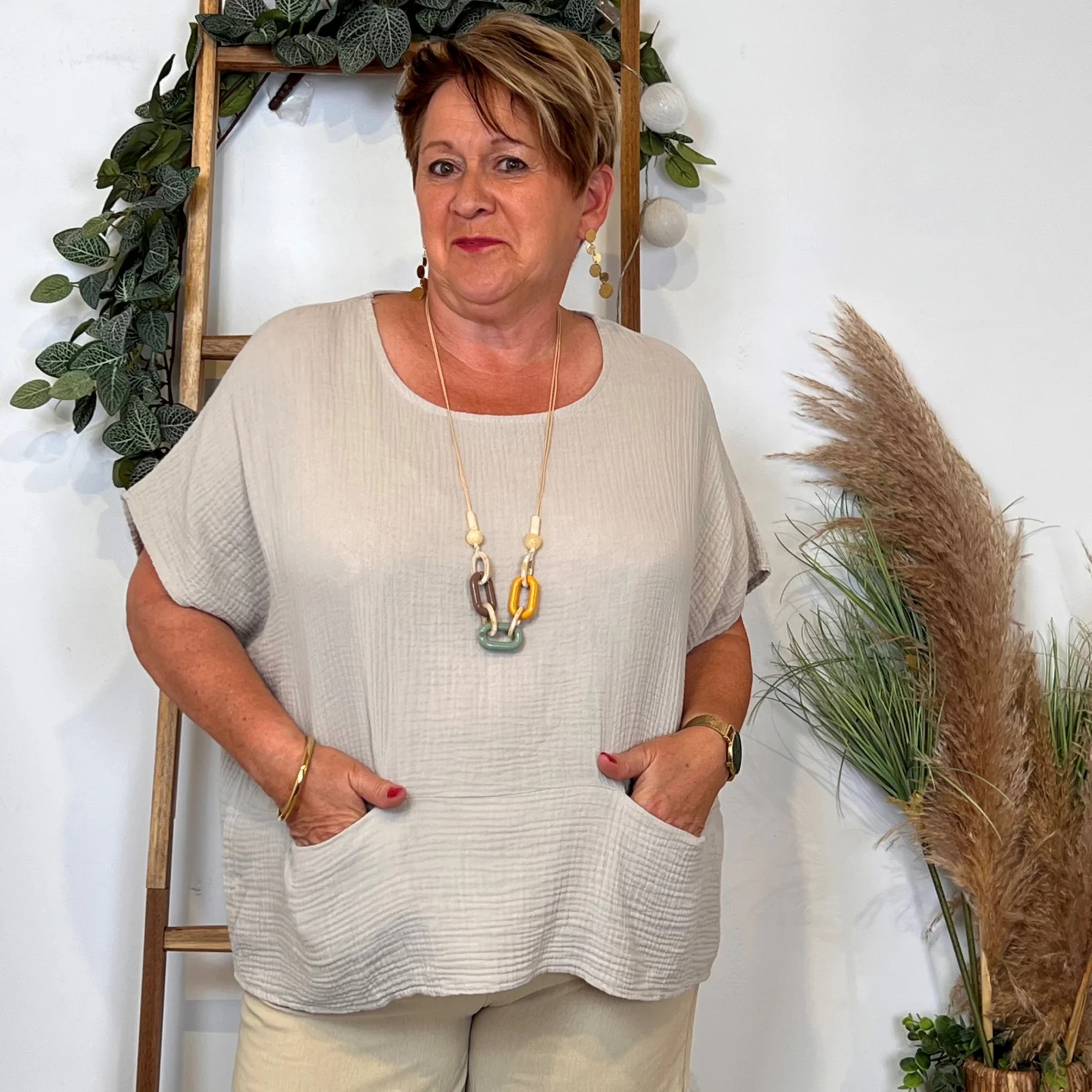 Laissez-vous séduire par cette tunique si facile à porter convenant jusqu’à la taille 46/48. Elle respire l’élégance en toute simplicité. Sa matière légère, sa coupe droite et son encolure et son collier fantaisie apportent une touche d’allure pour finaliser le style, vous ne la quitterez plus.