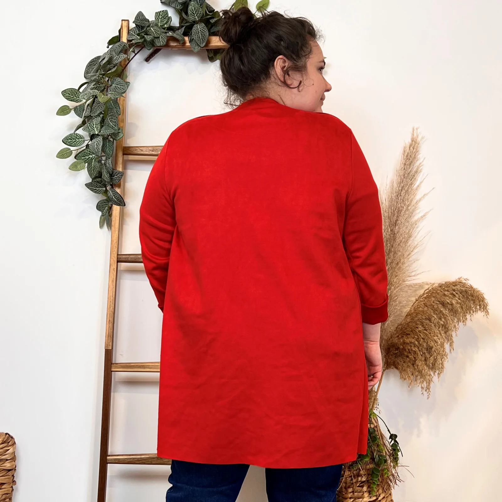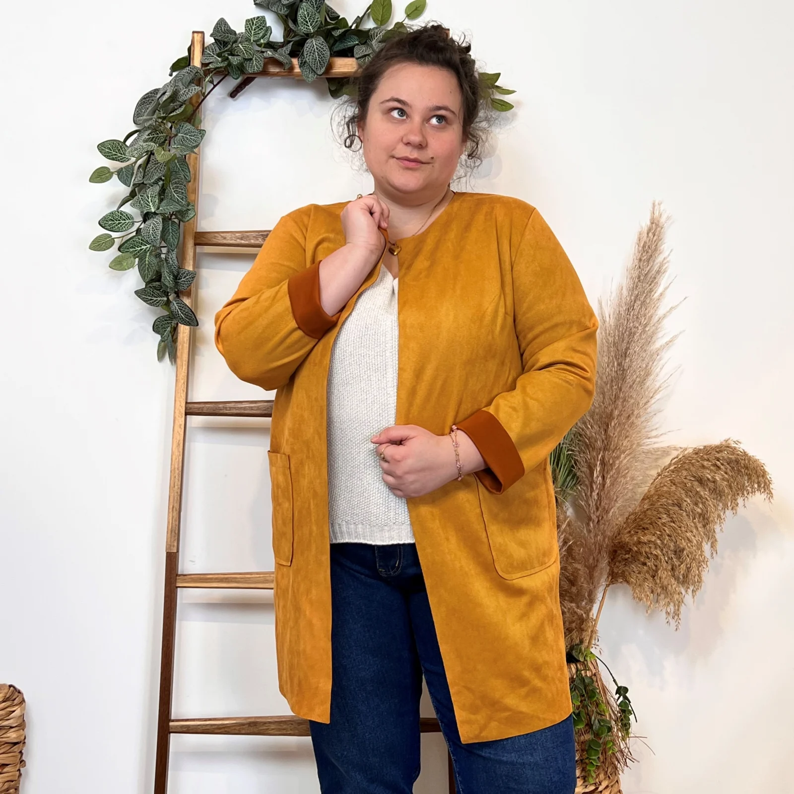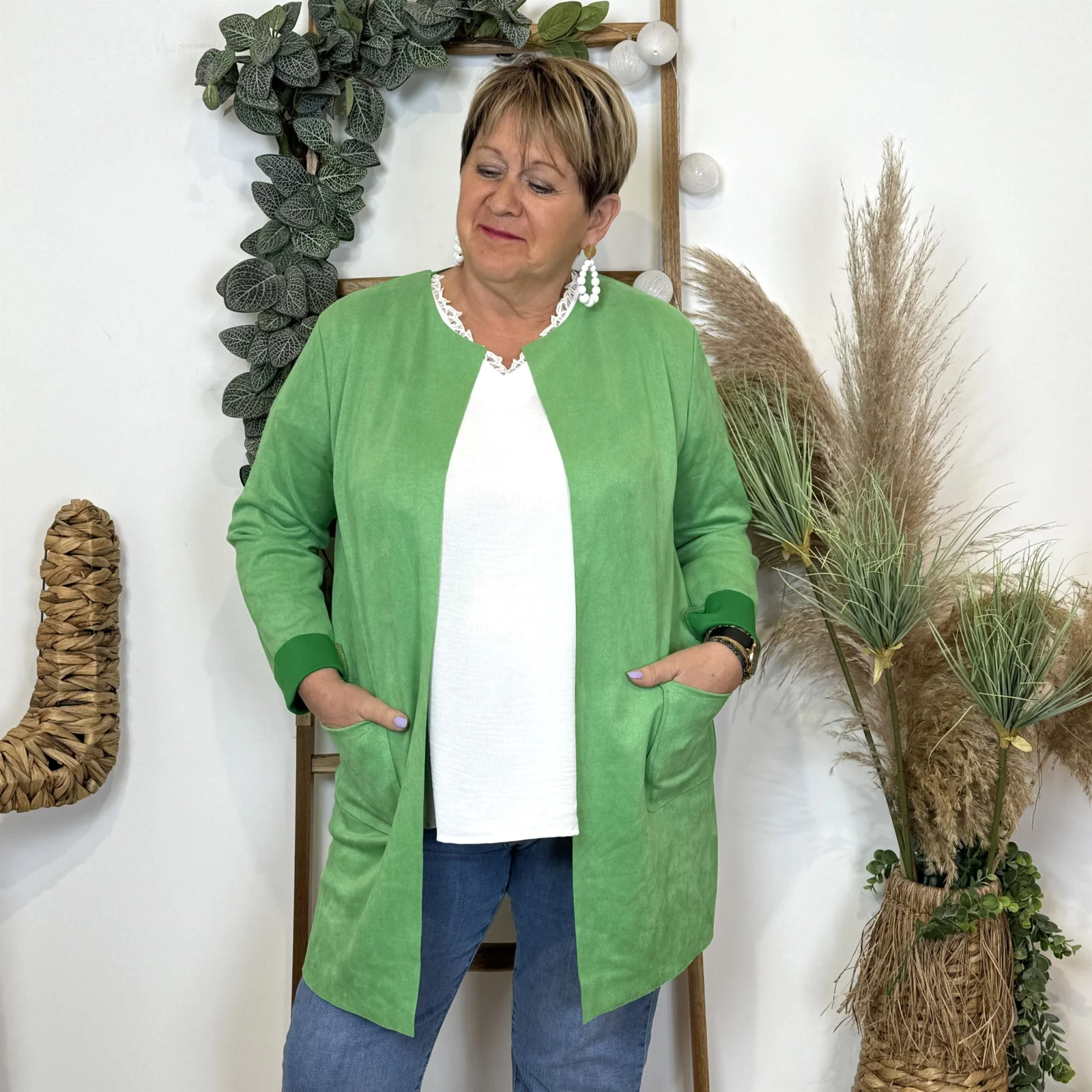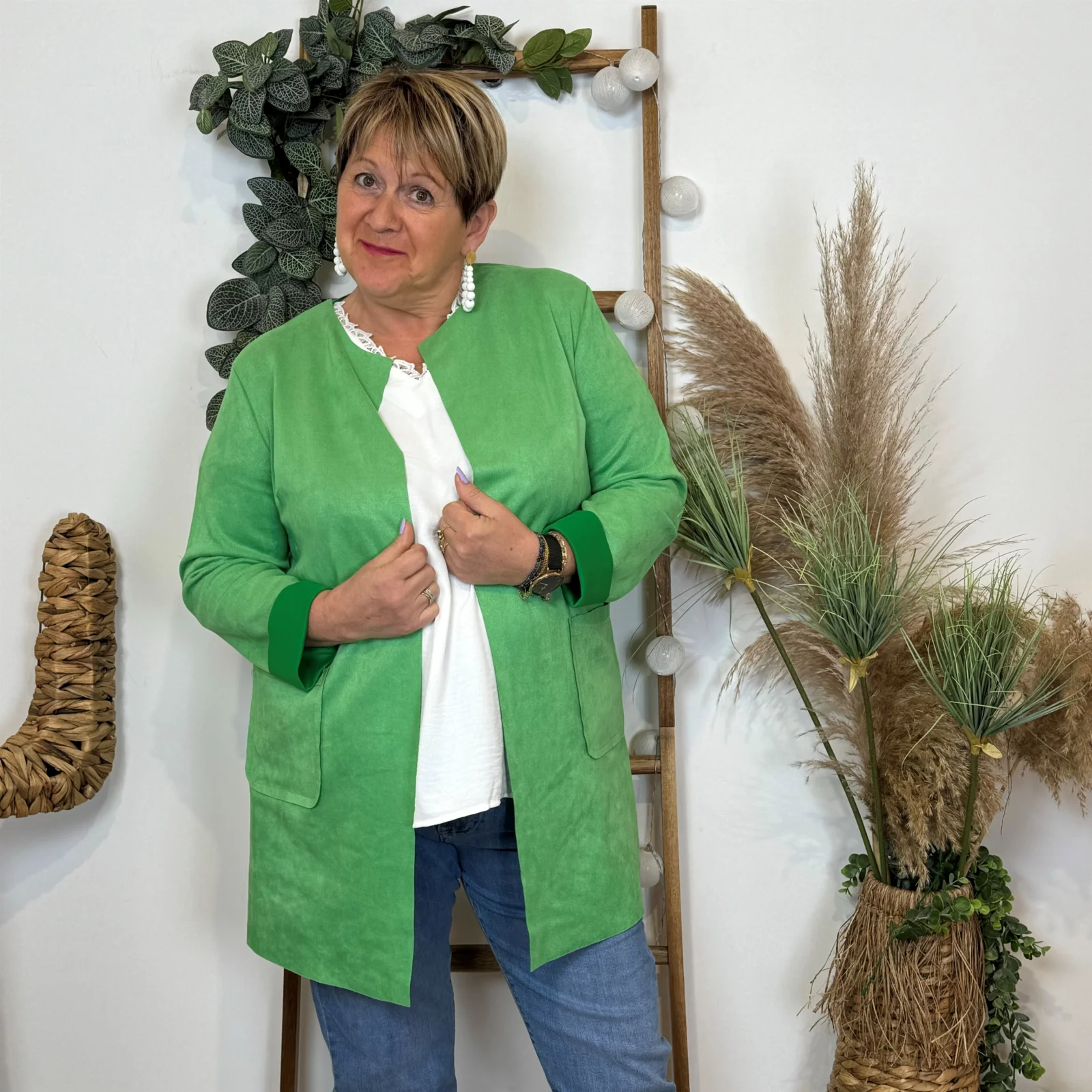L’équipe BleuClair vous propose cette petite veste de fabrication italienne qui vous comblera en toute saison. Découvrez notre veste mi-longue en suédine pour Femme. Ici associée avec un jean Voggo et un pull leger. La pièce idéale pour cette sain afin d’apporter une petite touche chic à votre tenue.