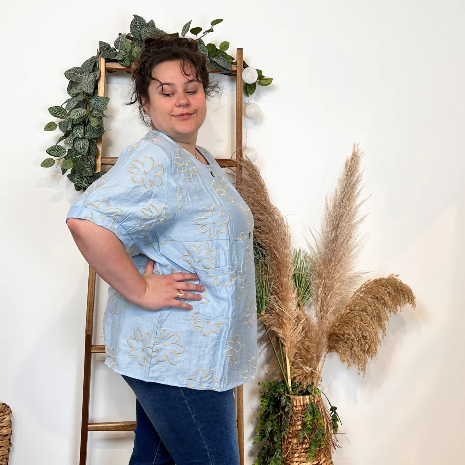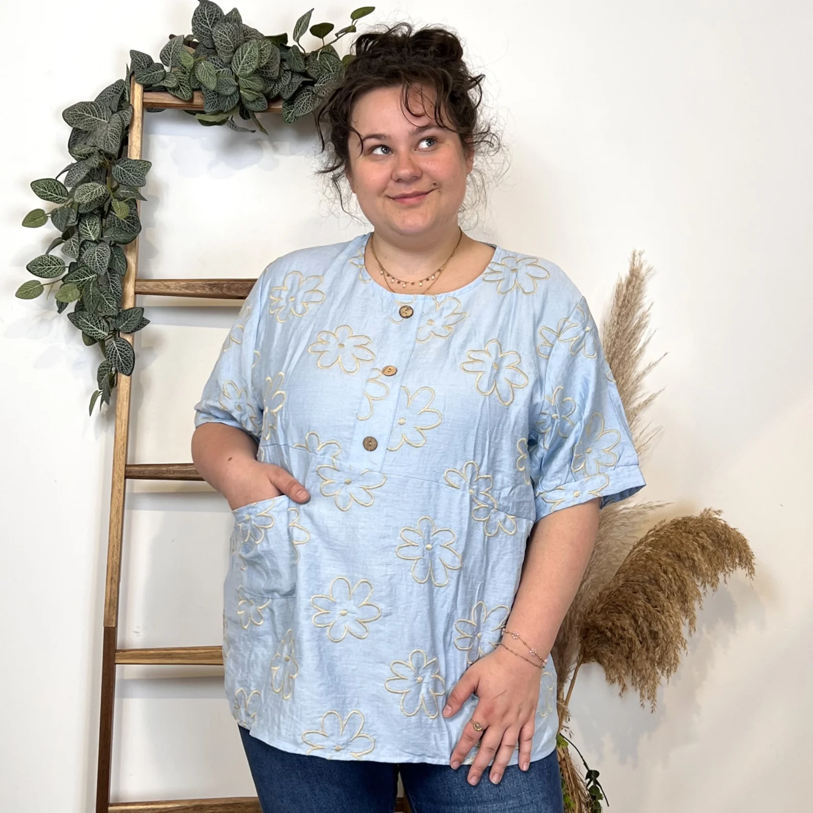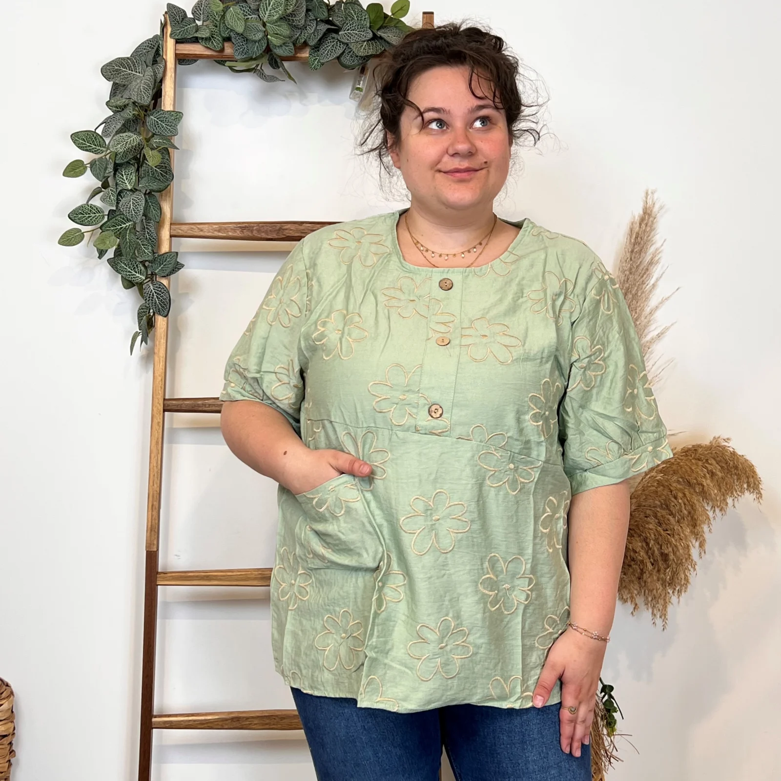 Une blouse signée Christy qui se porte facilement en cette saison. Blouse fluide imprimée “Jolies Formes”