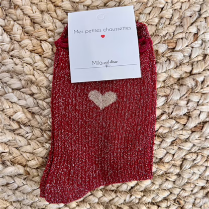 V295- Chaussettes paillettes « Coeur » , Mila (bordeaux)