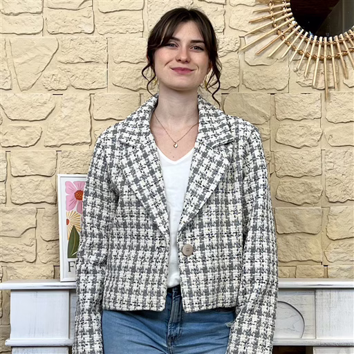 Sa coupe légèrement ajustée et sa longueur courte mettent la silhouette en valeur. Dotée d’un col à revers et d’une fermeture boutonnée, elle s’adapte aussi bien à un look casual qu’à une tenue plus habillée.
