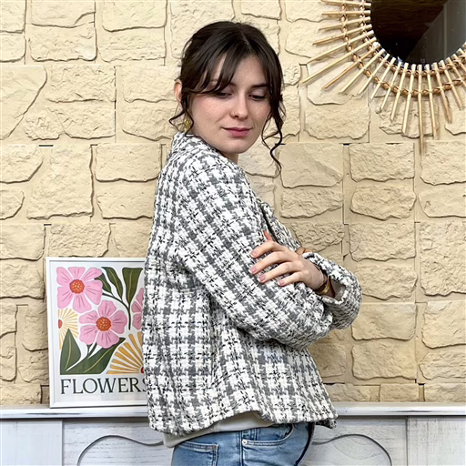 Apportez une touche chic et structurée à vos tenues avec cette veste courte style tweed. Son tissage texturé et ses nuances délicates lui confèrent un charme intemporel revisité avec modernité.