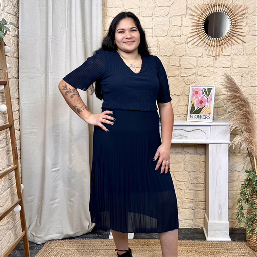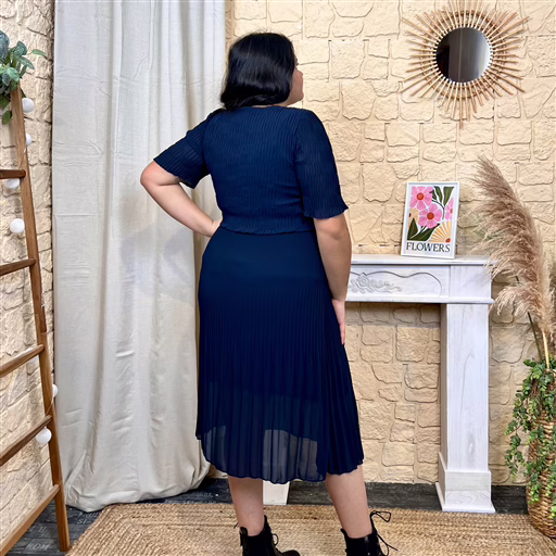 Cette robe longue plissée séduit par son tombé fluide et son jeu de plis délicats qui accompagnent chaque mouvement.