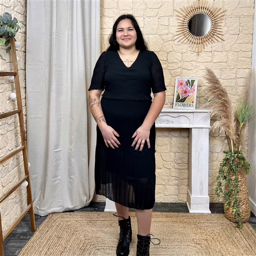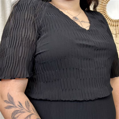 Cette robe longue plissée séduit par son tombé fluide et son jeu de plis délicats qui accompagnent chaque mouvement.