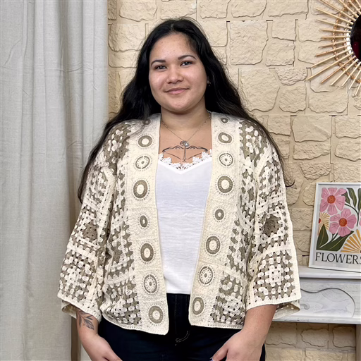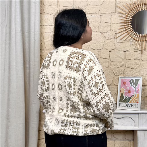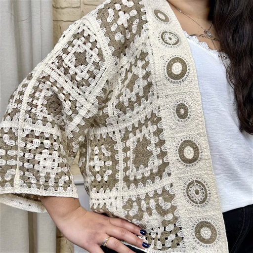 Ouvert sur le devant, il se superpose élégamment à un top ou une robe pour créer une silhouette bohème, douce et intemporelle.