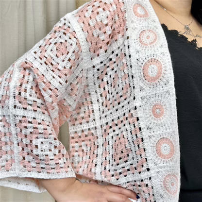 Ouvert sur le devant, il se superpose élégamment à un top ou une robe pour créer une silhouette bohème, douce et intemporelle.